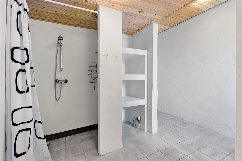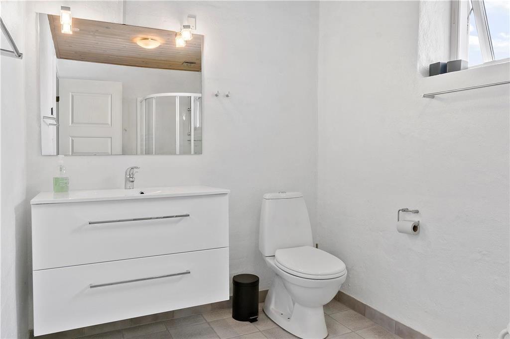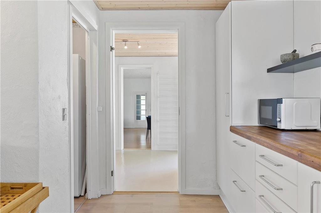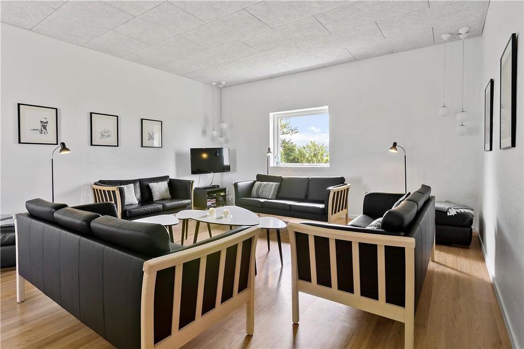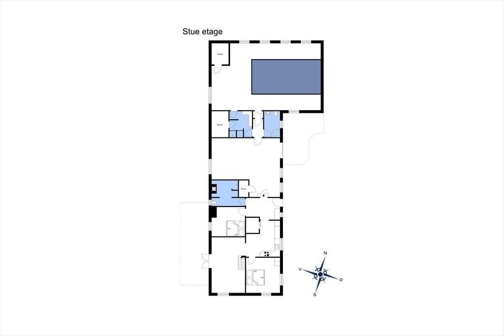 Intet mindre end 385 m2 er fordelt på sommerhusets to etager, og både oppe og nede præsenterer rummene sig på lys og indbydende vis. Takket være de mange kvadratmeter og den formfuldendte indretning kan I nemt invitere et stort selskab med på ferien. Planløsningen byder blandt andet på fem soveværelser og hele tre badeværelser, så 11 personer kan uden problemer samles til dasedage i roligt tempo. Opholdsrum finder I også flere af inden døre: På førstesalen ligger et gennemgangsrum med bordfodbold, mens stueetagen rummer en stor opholdsstue og en ditto spisestue med åben forbindelse til et velindrettet køkken. Det er naturligvis også oplagt at samles i sommerhusets poolafdeling, hvor I kan gå i sauna og plaske i swimmingpoolen, der har målene 7 x 4 x 1,30 meter.
