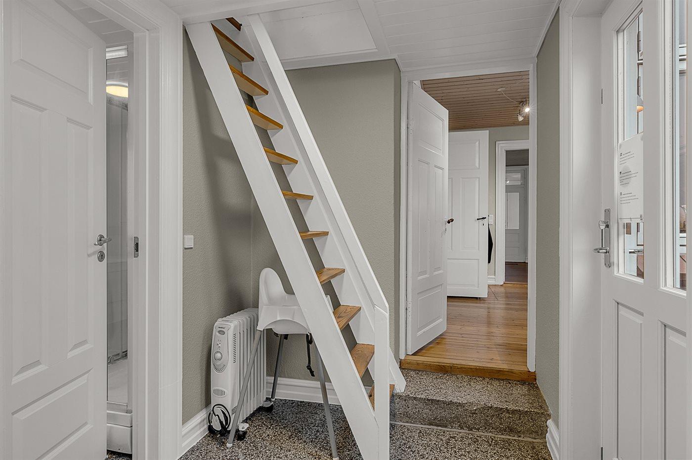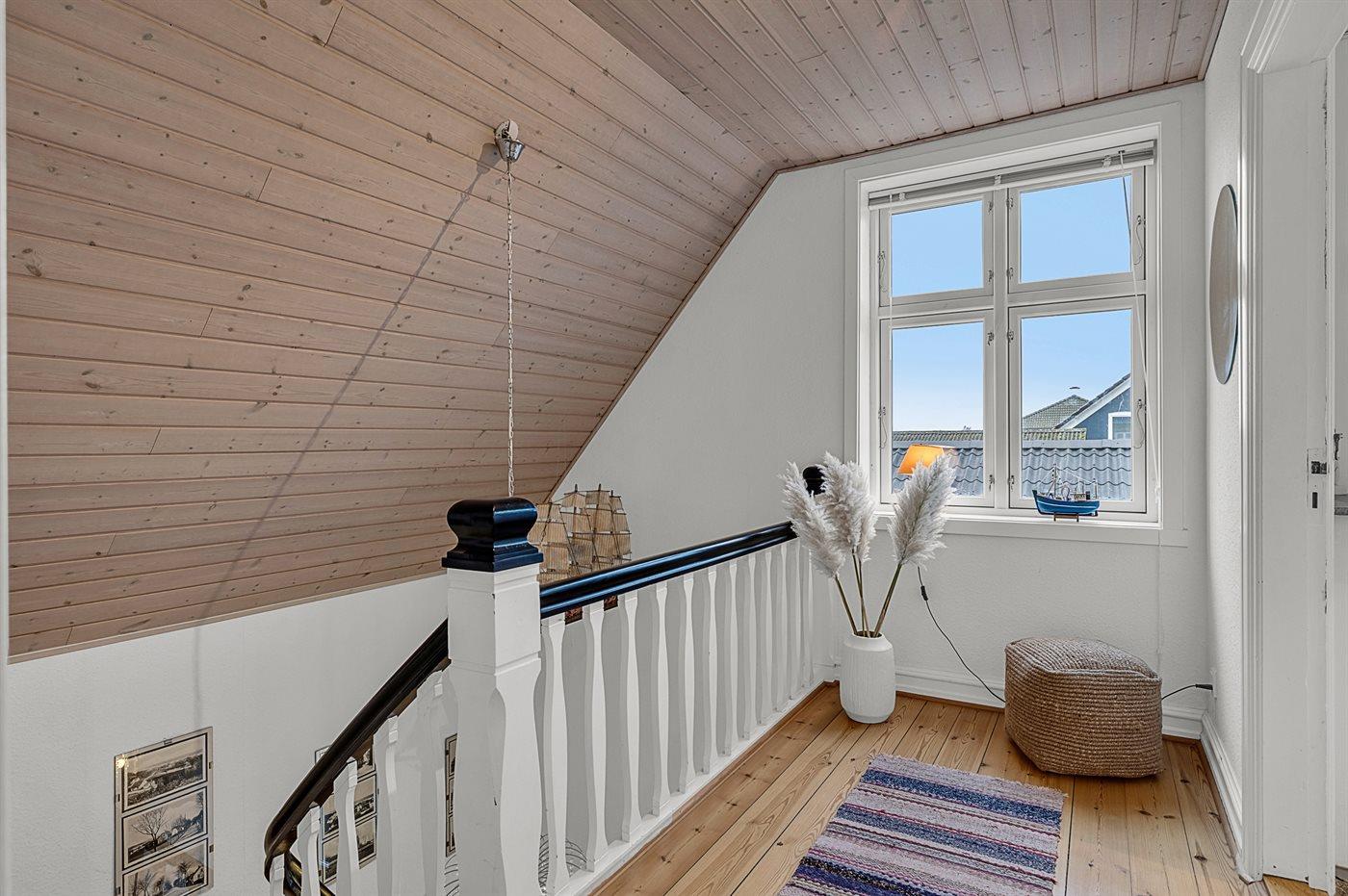 På 1.salen findes der soveværelser, hvorfra der fra det ene er udgang til tagterrasse med udsigt udover byen. Her er der også et stort badeværelse med spa. Fra stueetagen er der desuden opgang til den store hems, hvor man finder de to sovepladser på madrasser.