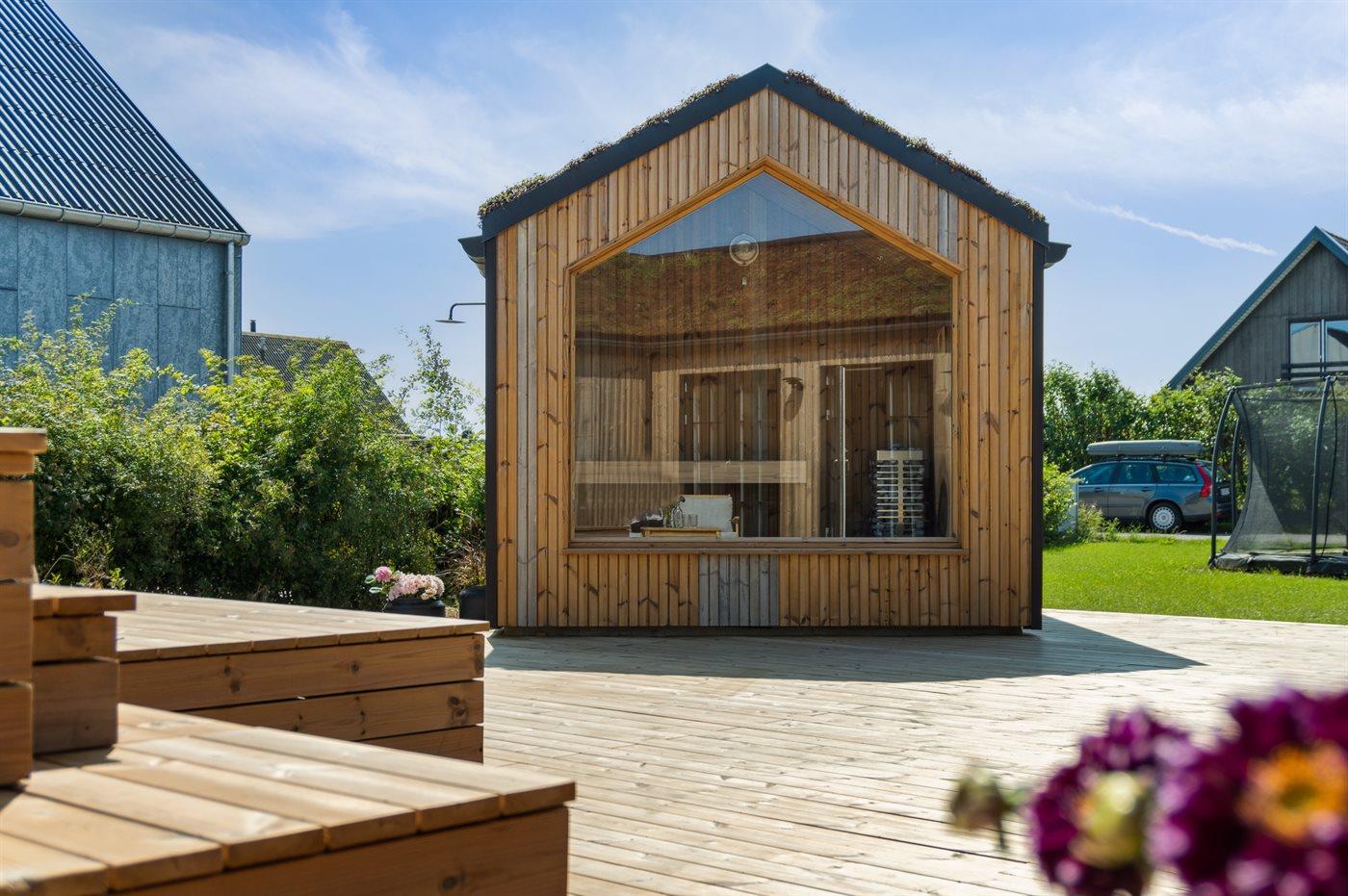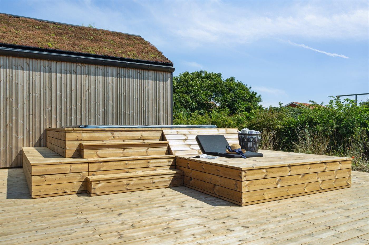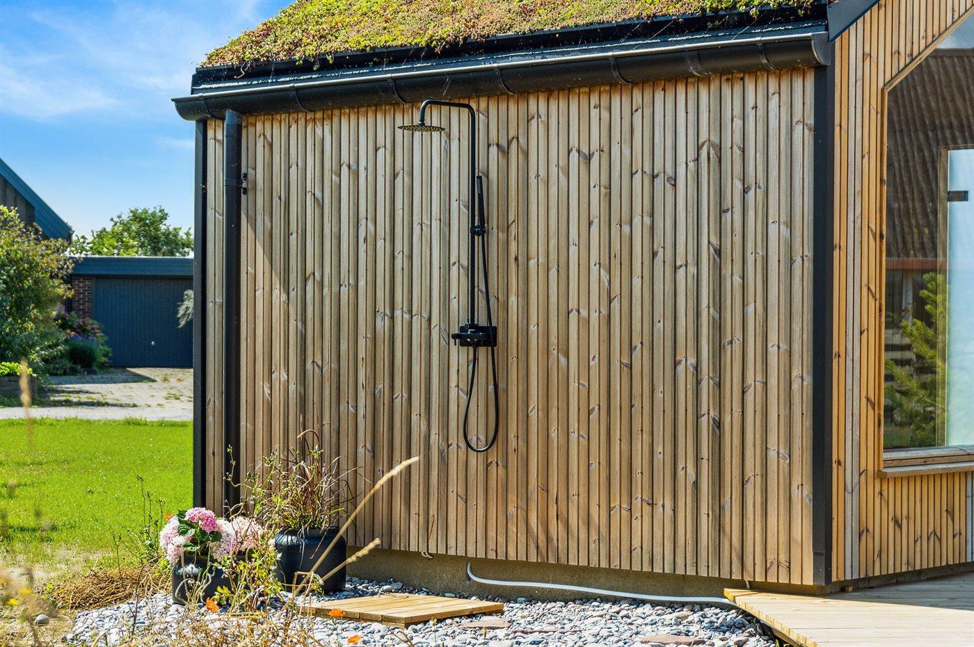 Ferieboligen er beliggende på en 1038 m² stor havegrund. Der er 150 m til havet. Nærmeste forretning er beliggende i en afstand af 275 m. Til ferieboligen hører åbent terrasseareal. Desuden er der overdækket terrasse. Trampolin. Der ligger en legeplads i en afstand af 500 m. Udendørs sauna. Udendørs bruser. Der er mulighed for at tilberede maden udendørs i udekøkkenet. Grill til rådighed. Der er installeret stik til opladning af elbil. Parkering ved ferieboligen.