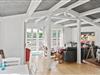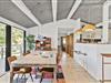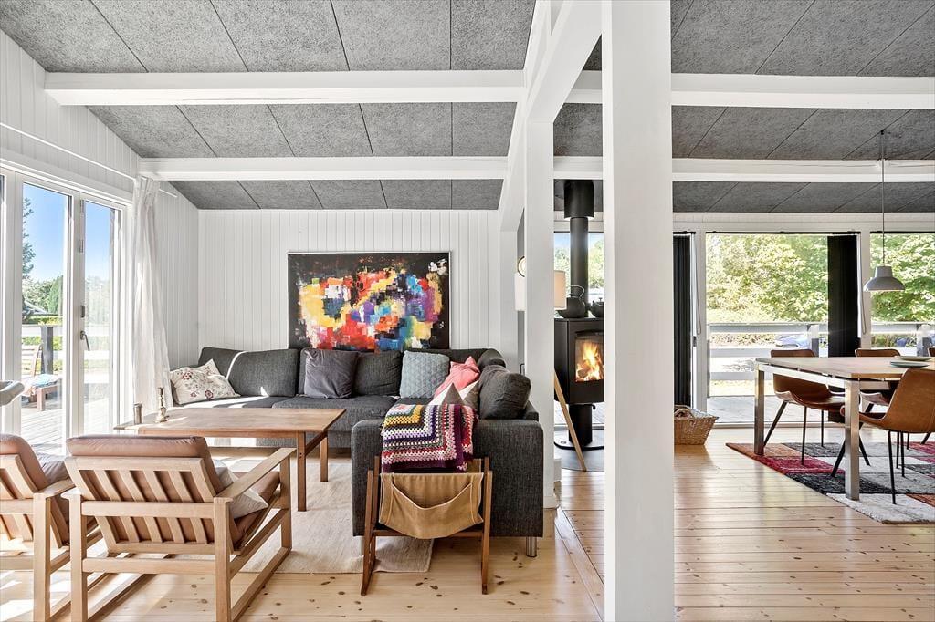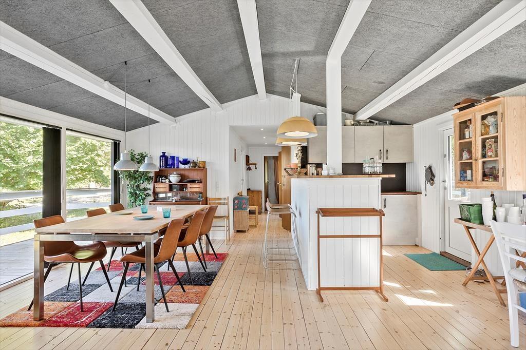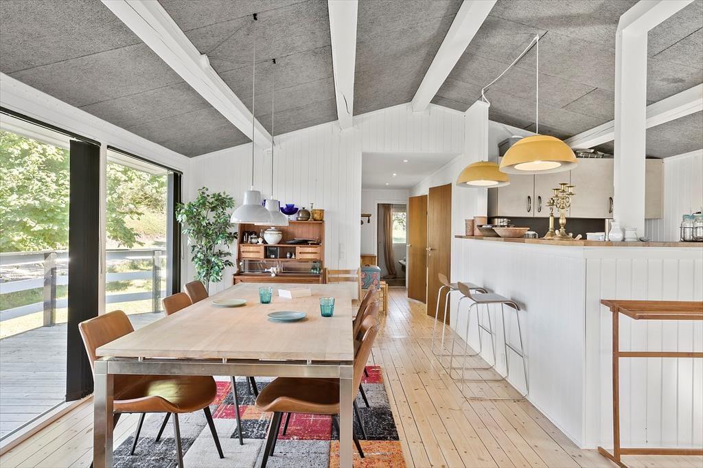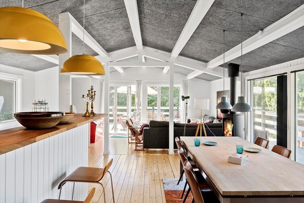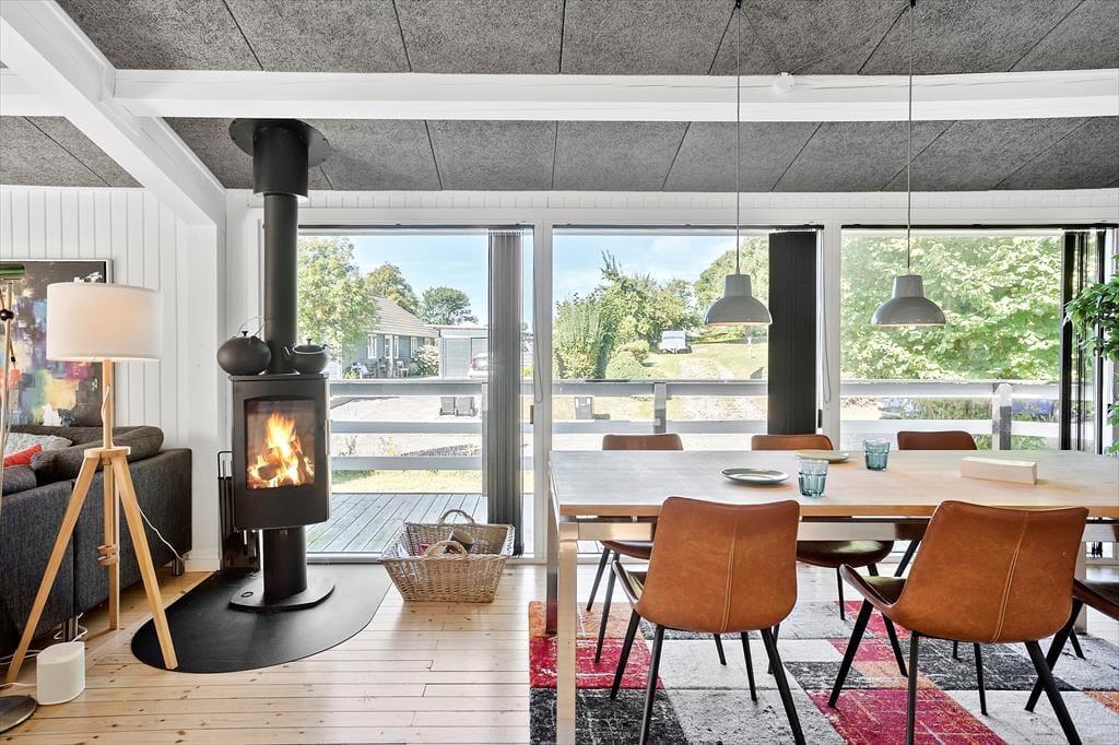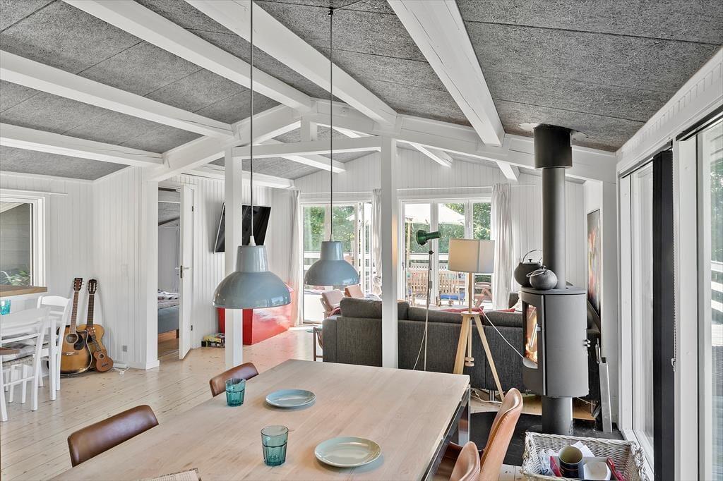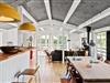 Ved køkkenet er der en spiseafdeling. Cirka midt i stuen er der en ny brændeovn,