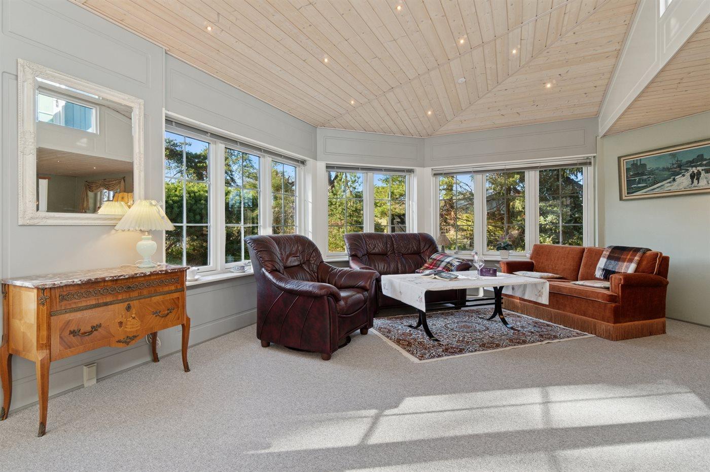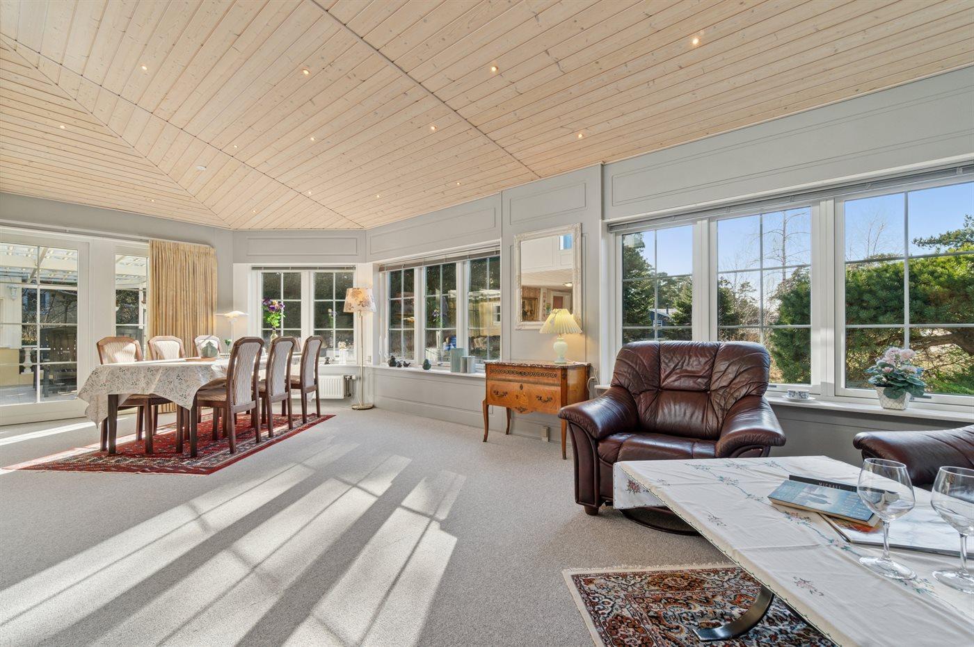 Huset er stort med flere stuer, flot køkkenafdeling og spa-badeværelse samt et større soveværelse med direkte udgang til lille morgenterrasse i stueplan. På 1. sal finder man foruden gæstetoilettet også to soveværelser, en hygge repos og altan, der er delvis overdækket og afskærmet.