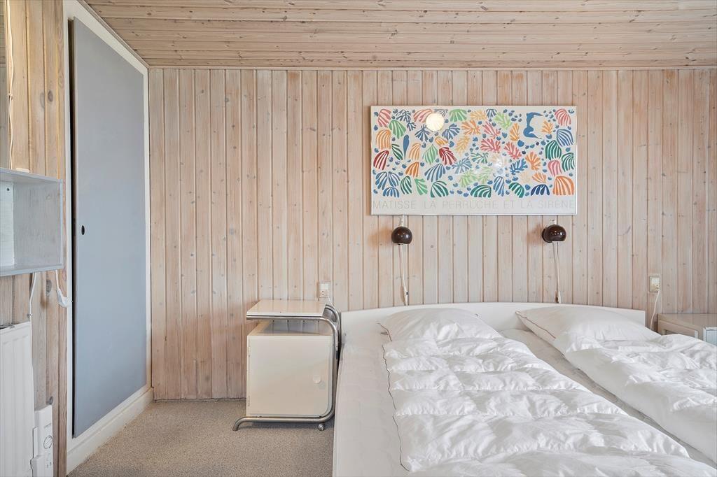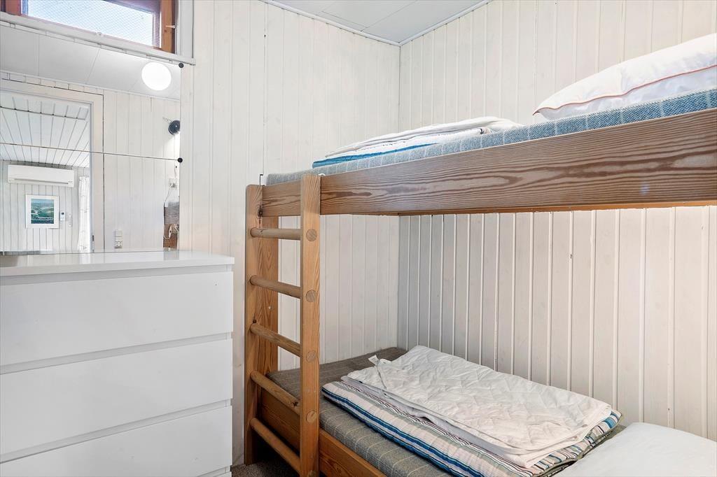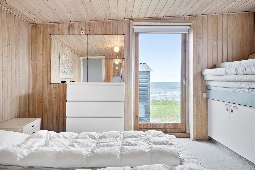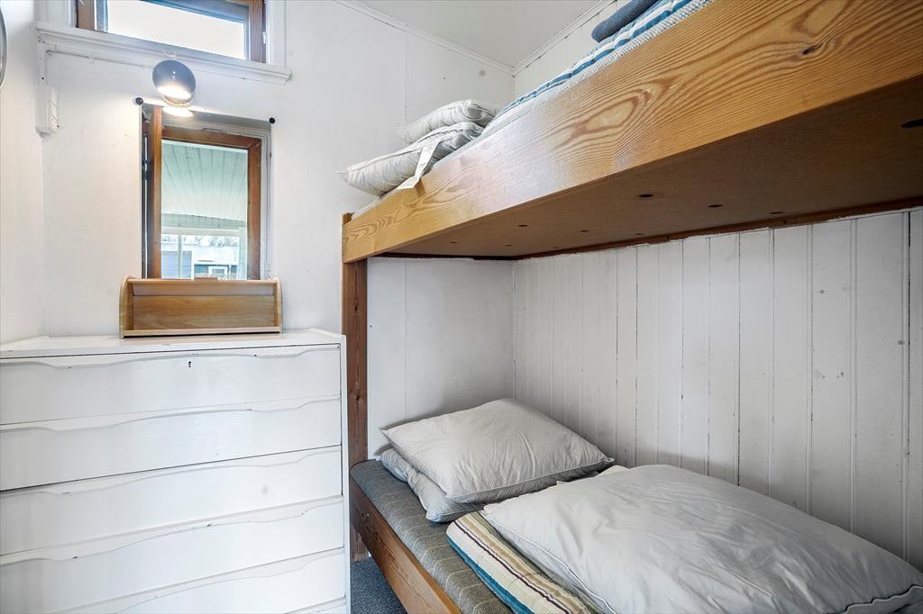 Fra stuen er der adgang til husets soveværelser. Der er to mindre soverum, hvor der er køjesenge i træ, så det passer godt til børn. Det store soveværelse med dobbeltseng er også i forlængelse af stuen, og her er en god dobbeltseng samt en enkeltmandsseng. Fra soveværelset er der en terrassedør glasdør ud til haven og udsigt til vandet. Det er altså et dejligt soveværelse med et godt lysindfald og skabsplads.