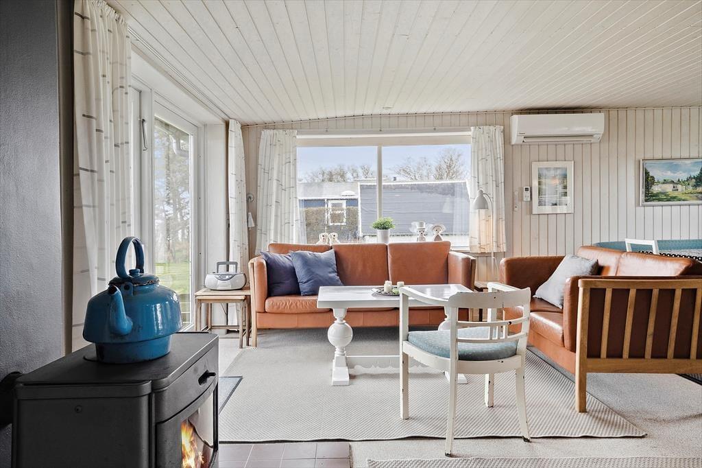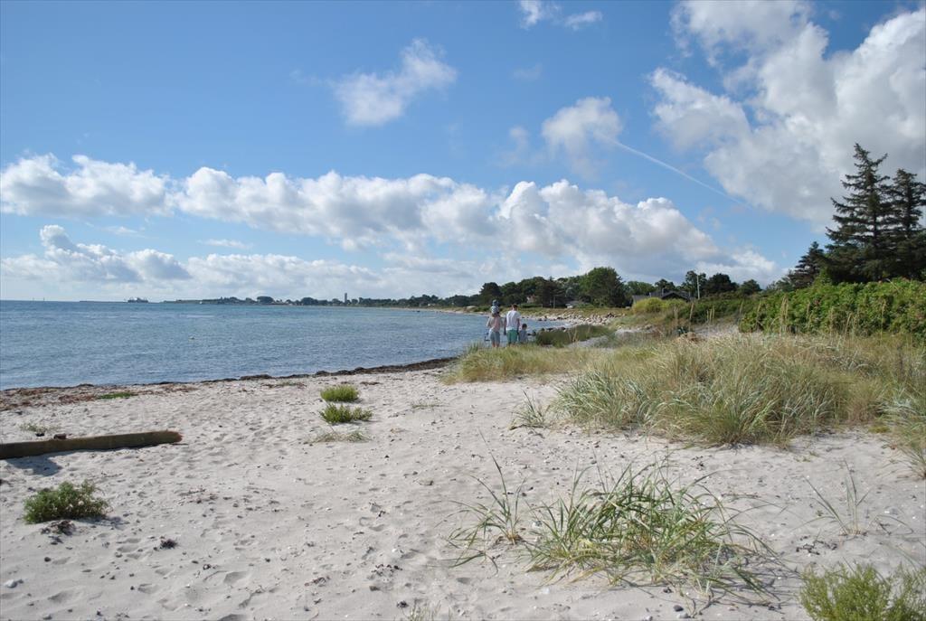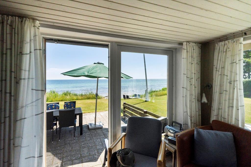 Det åbne køkkenalrum har en hyggelig spiseafdeling med bænk og et godt overblik over køkkenet og den hyggelige stue. Køkkenet har god skabsplads og blandt andet opvaskemaskine og køle-/fryseskab, så det er let at tilberede feriens måltider her. Det store vinduesparti i sofahjørnet byder på vid havudsigt mod syd øst, samt udgang til fliseterrasse med direkte adgang til haven og strandgrund. Dette rum er altså husets samlingsrum, hvor man kan lave mad, spille et spil eller slappe af i sofaen med en god bog eller tænde for TV´et med både danske og tyske kanaler.