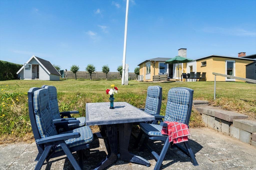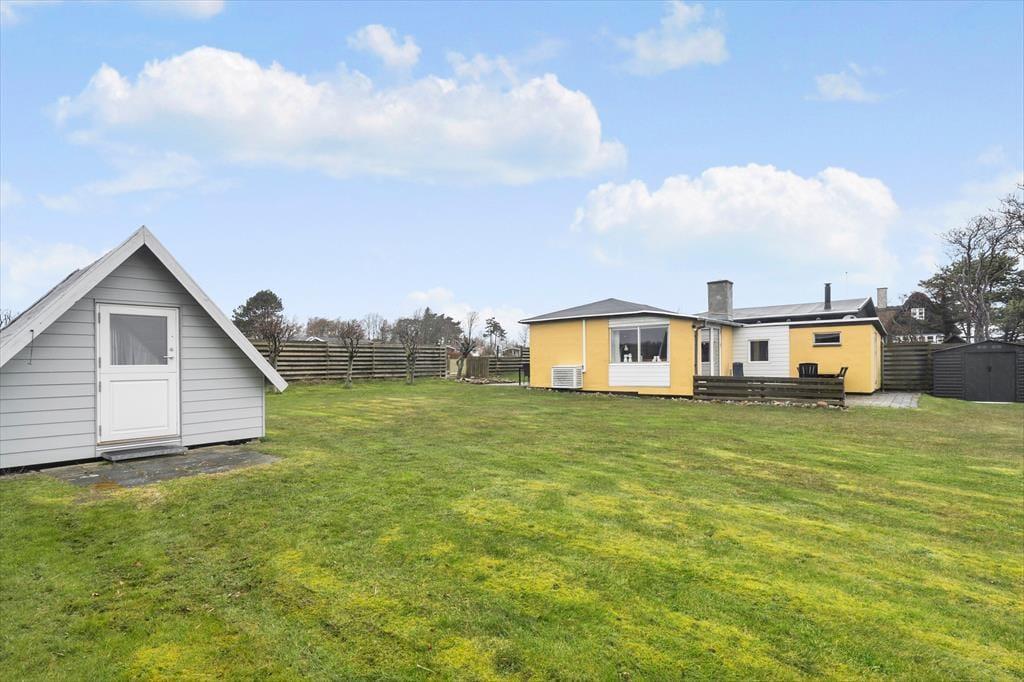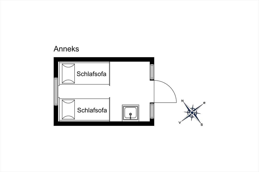 I haven er et anneks på 10 m2, som er til brug i sommerperioden. Her er trægulv, lille bord arrangement, en håndvask og 2 enkeltsenge. Annekset er hyggeligt og herfra er også en flot udsigt til stranden og havet.