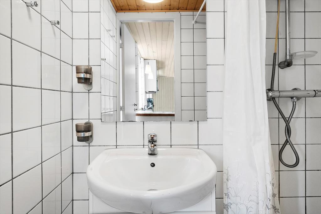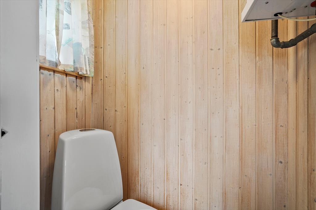 Sommerhusets bad og toilet med klinkegulv er opdelt i hvert sit rum. Det er i sammenhæng med en lille praktisk entre med plads til overtøj. Pladsen her er ikke stor, men det er et funktionelt og hyggeligt sommerhus, hvor beliggenheden er helt i top.