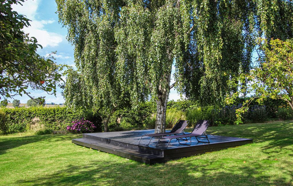 Udenfor kan I slå jer ned på de komfortable liggestole på de dejlige terrasser, der byder på både sol og skygge under birketræet. Ude på terrassen ved huset kan I også spise i det fri, og en grill står klar til en god sommerret til hele familien.