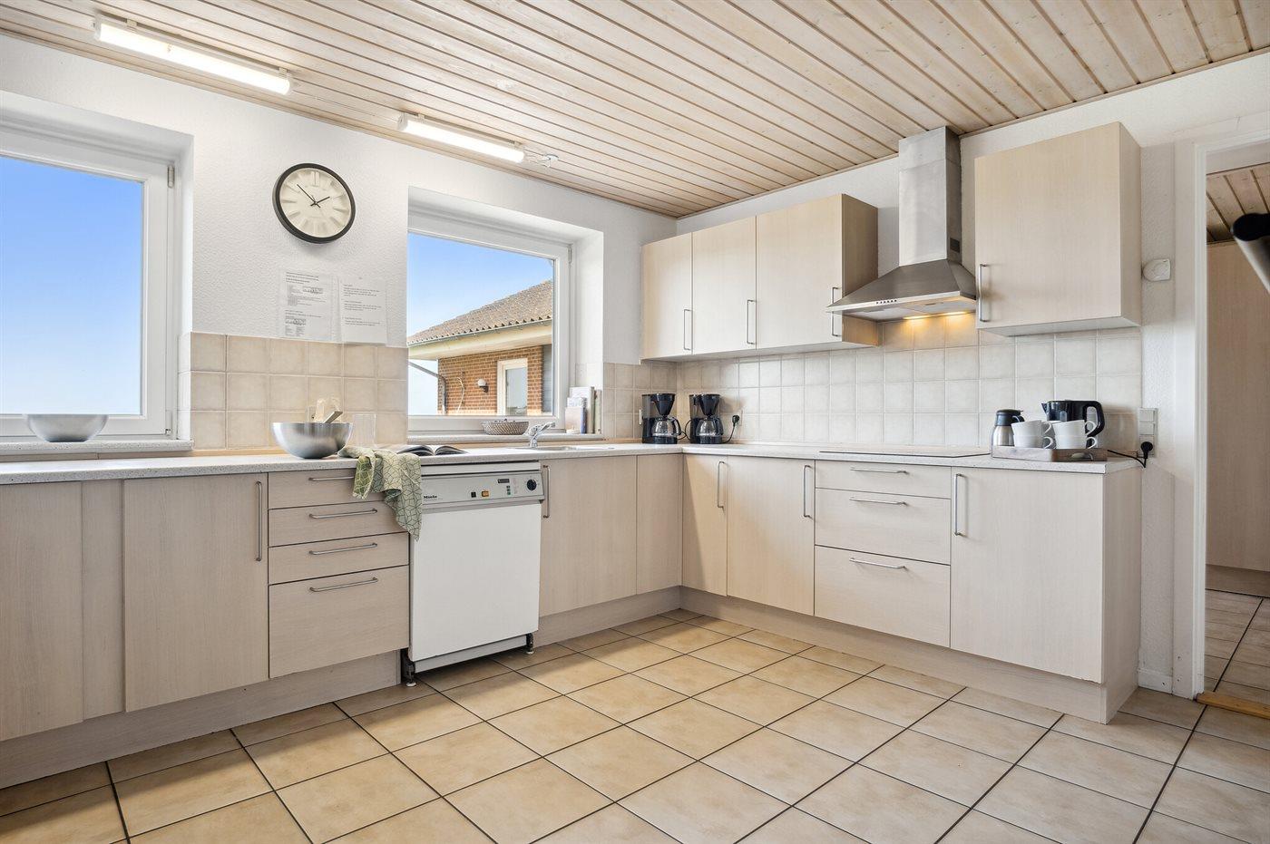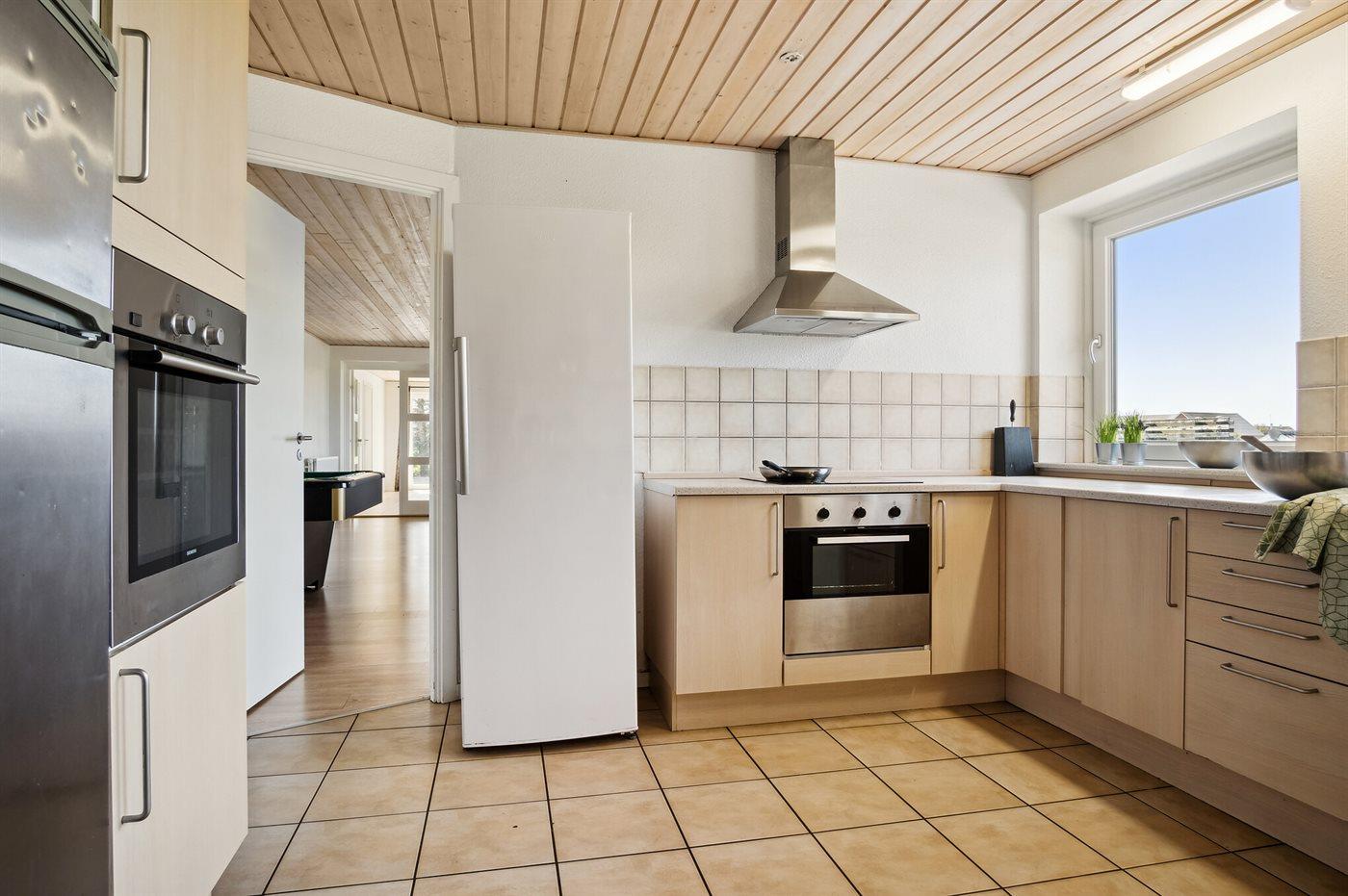 Køkkenet er udstyret med 1 køleskab. Der er 4 keramiske kogeplader, varmluftovn, mikrobølgeovn samt opvaskemaskine.