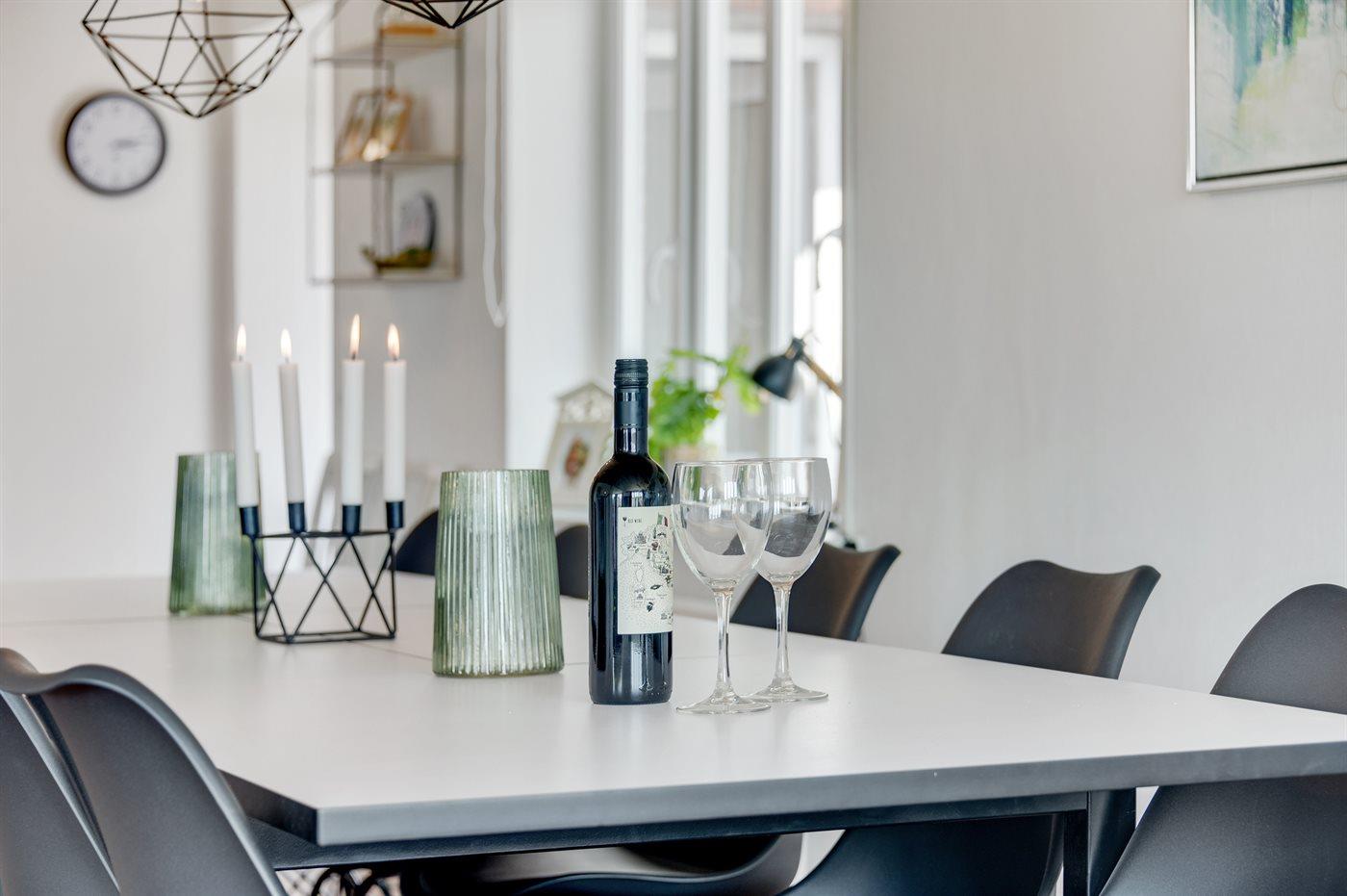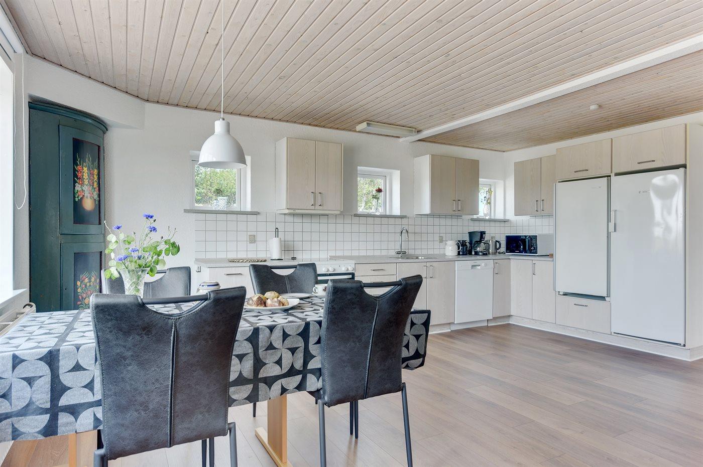 Køkkenet er udstyret med 1 køleskab. Der er 4 keramiske kogeplader, varmluftovn, mikrobølgeovn samt opvaskemaskine.