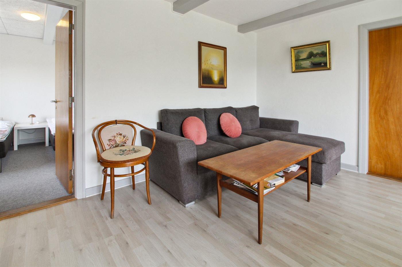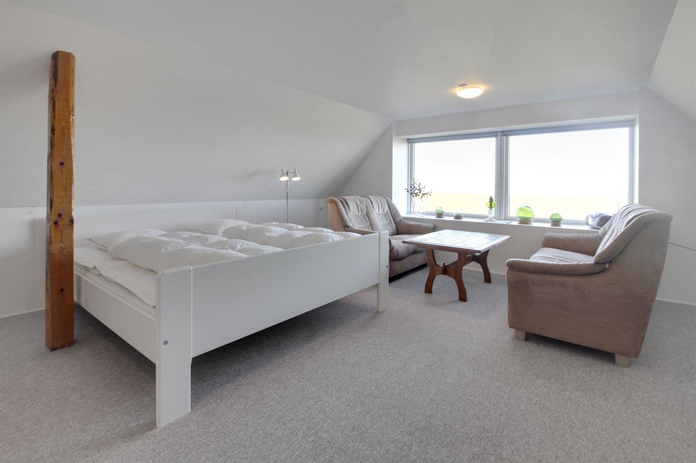Der er i alt 1 soveværelse. Sovepladserne fordeler sig på: 2 sovepladser i dobbeltseng. 2 sovepladser i enkeltsenge. 2 sovepladser i sovesofa (dobbelt). 2 af disse sovepladser befinder sig i stuen. Derudover er der 1 stk. barneseng.