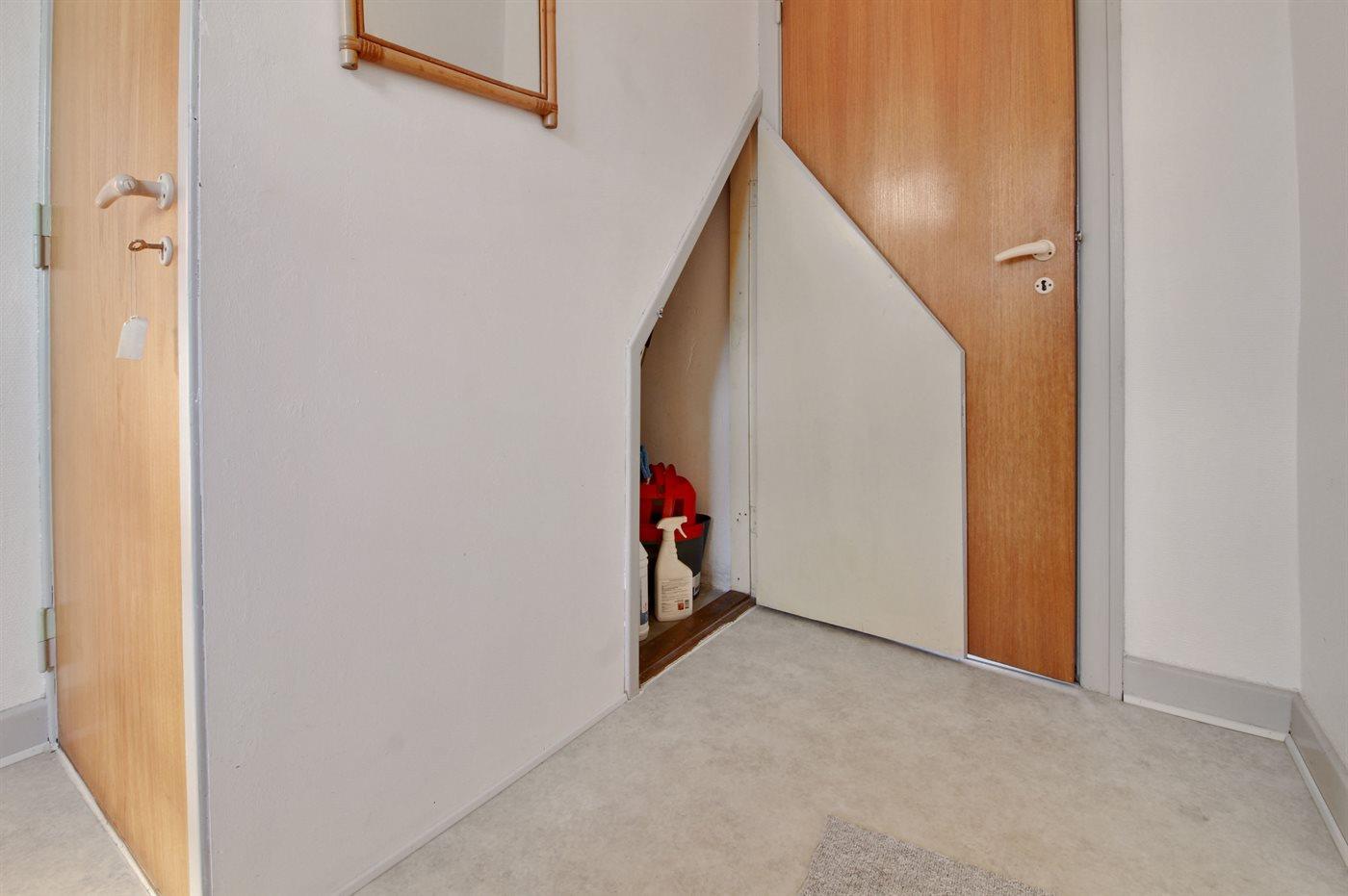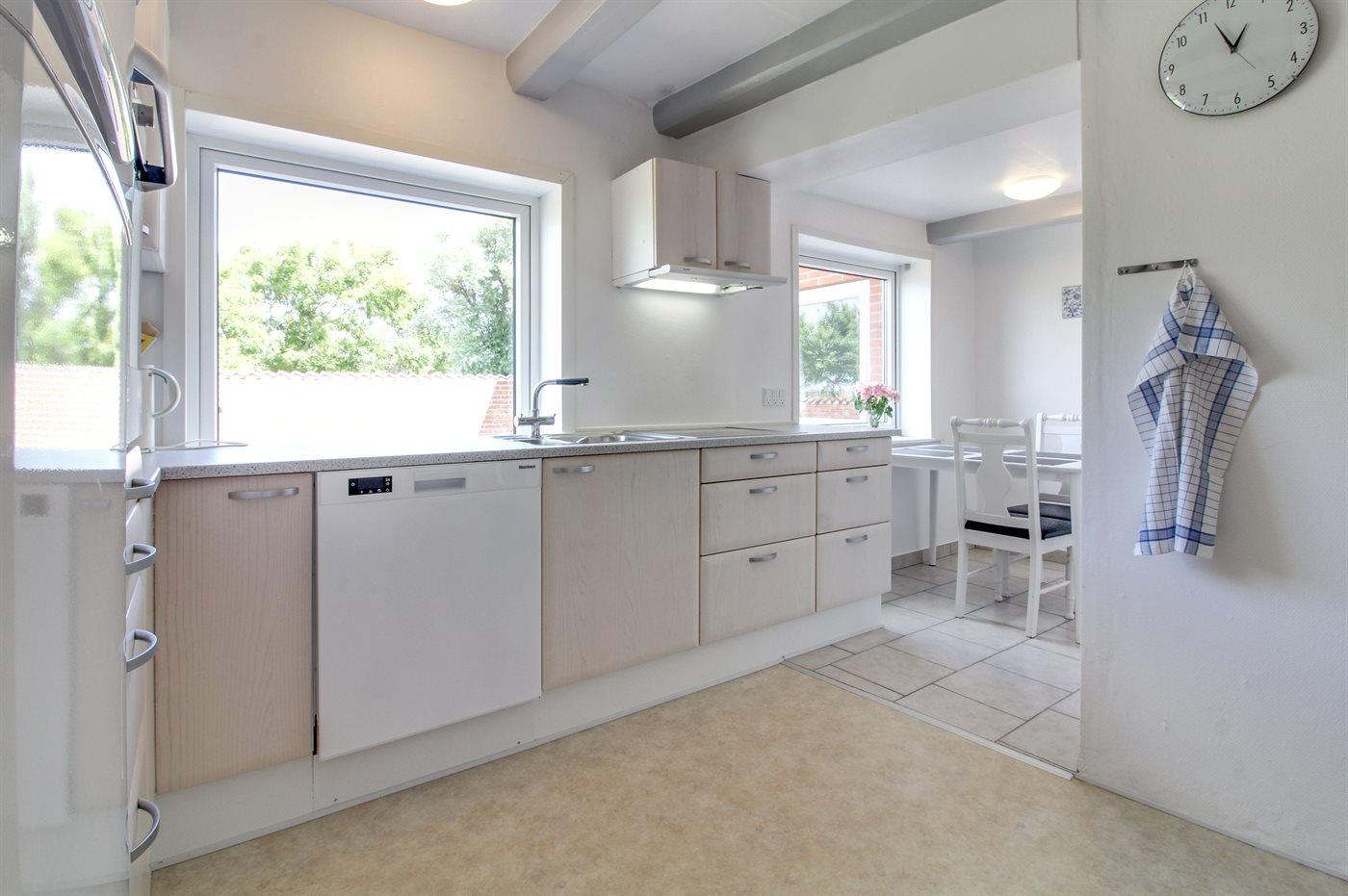 Køkkenet er udstyret med 1 køleskab. Der er 4 keramiske kogeplader, varmluftovn, mikrobølgeovn samt opvaskemaskine Der er gulvvarme i køkkenet.
