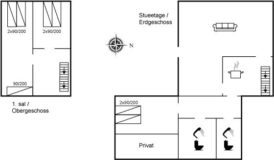 Der er i alt 3 soveværelser. Sovepladserne fordeler sig på: 6 sovepladser i dobbeltsenge. 1 soveplads i enkeltseng.