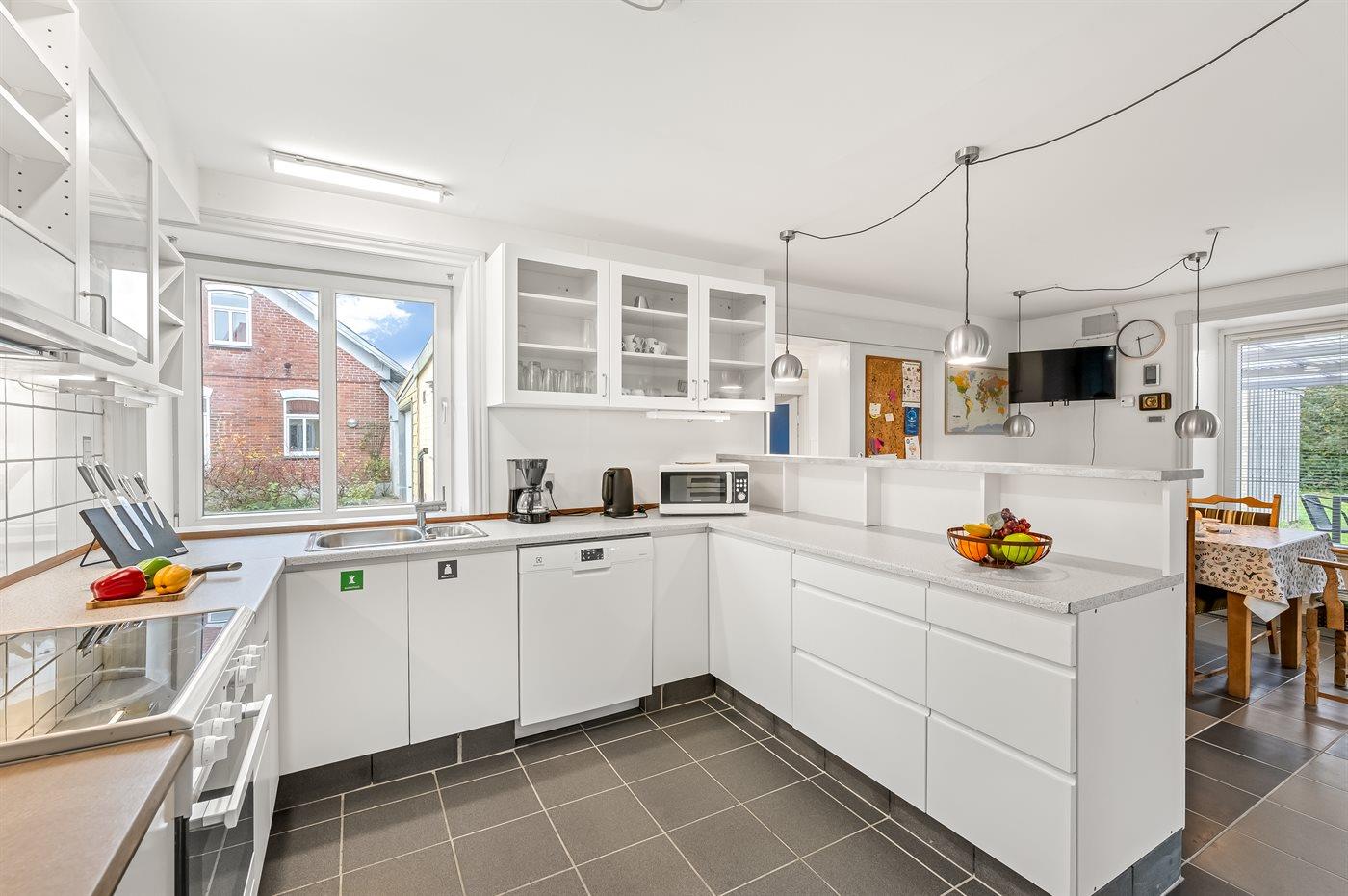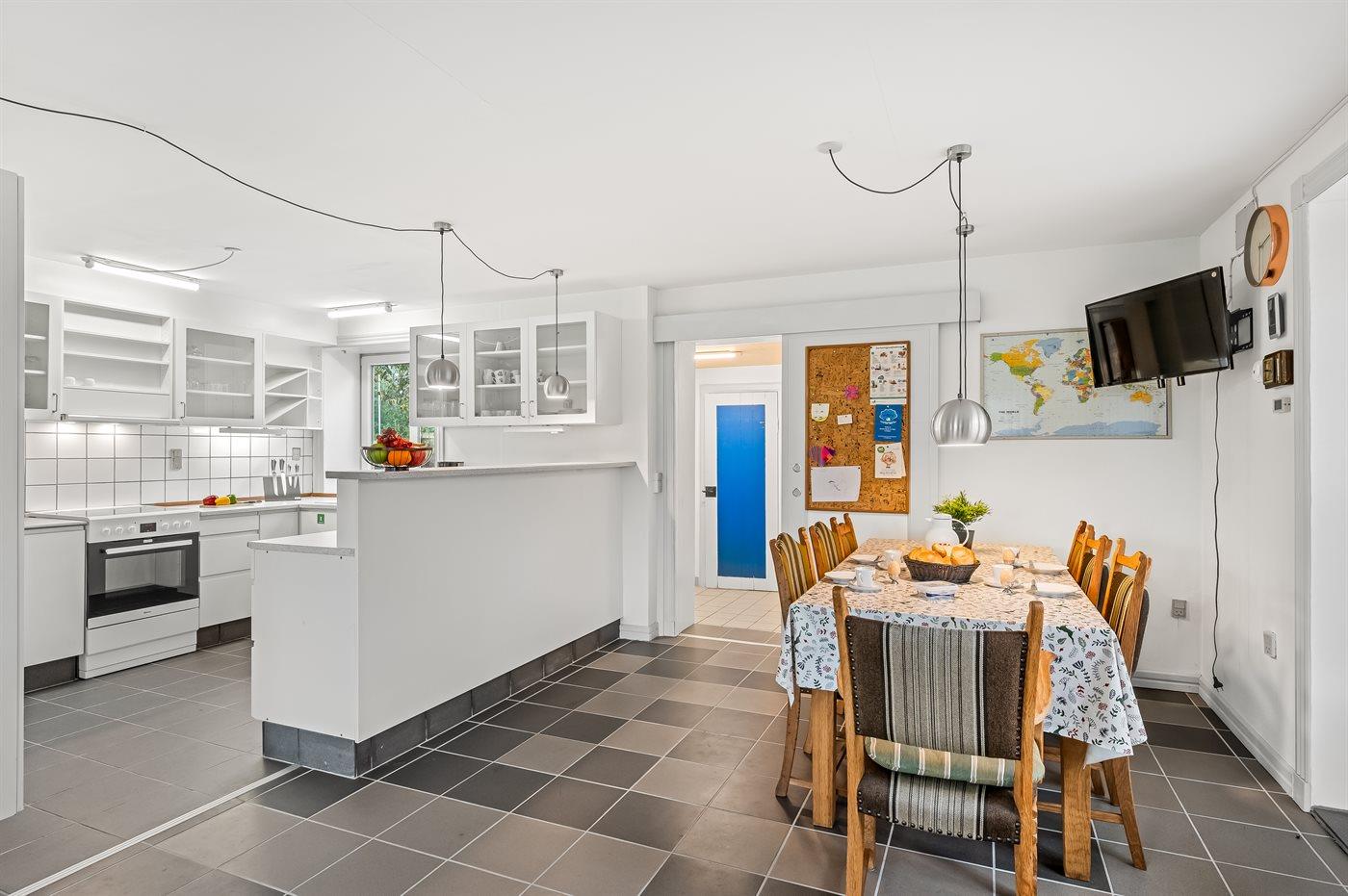 Køkkenet er udstyret med 1 køleskab. Der er 4 elkogeplader, varmluftovn, mikrobølgeovn samt opvaskemaskine.