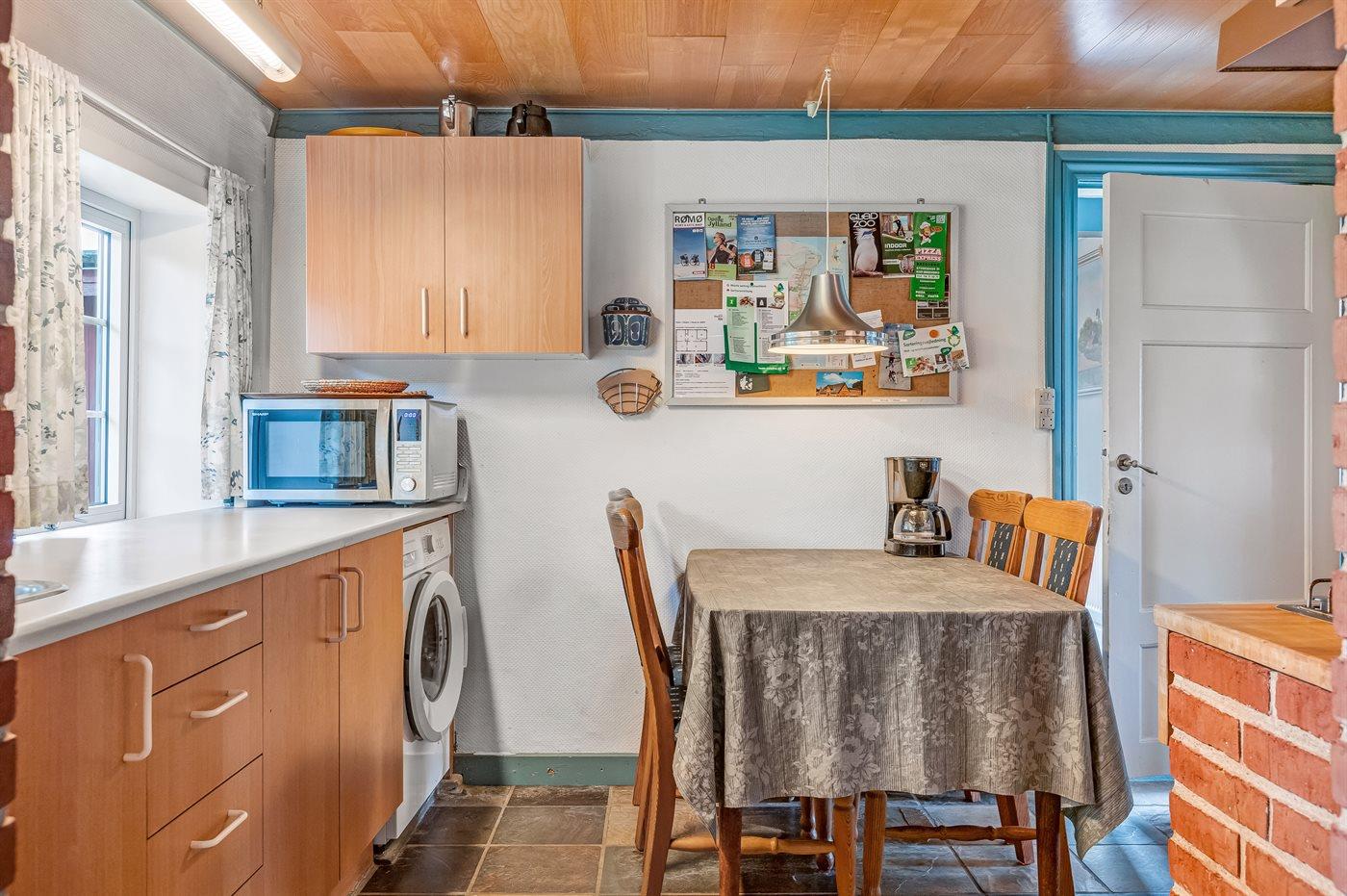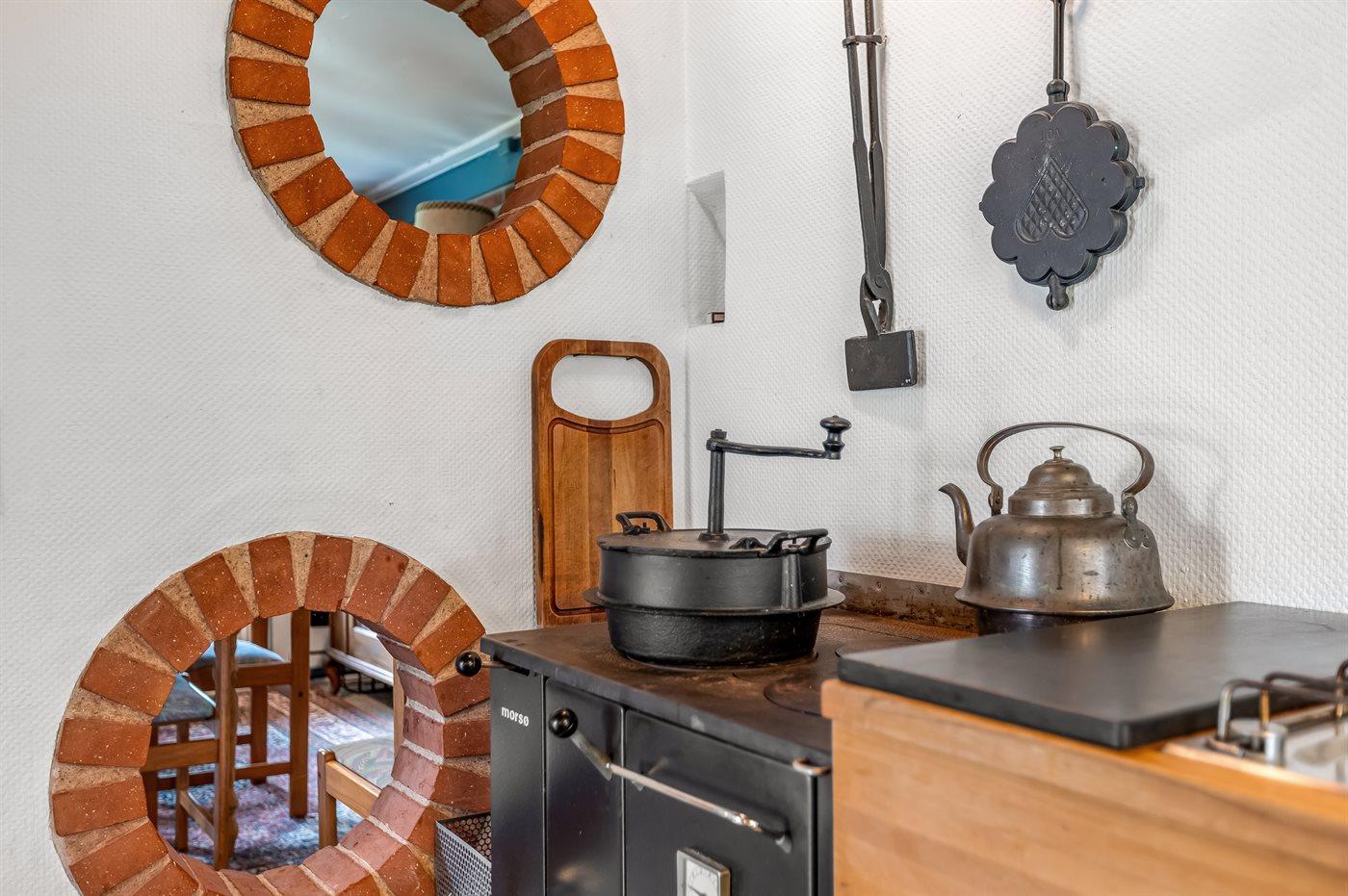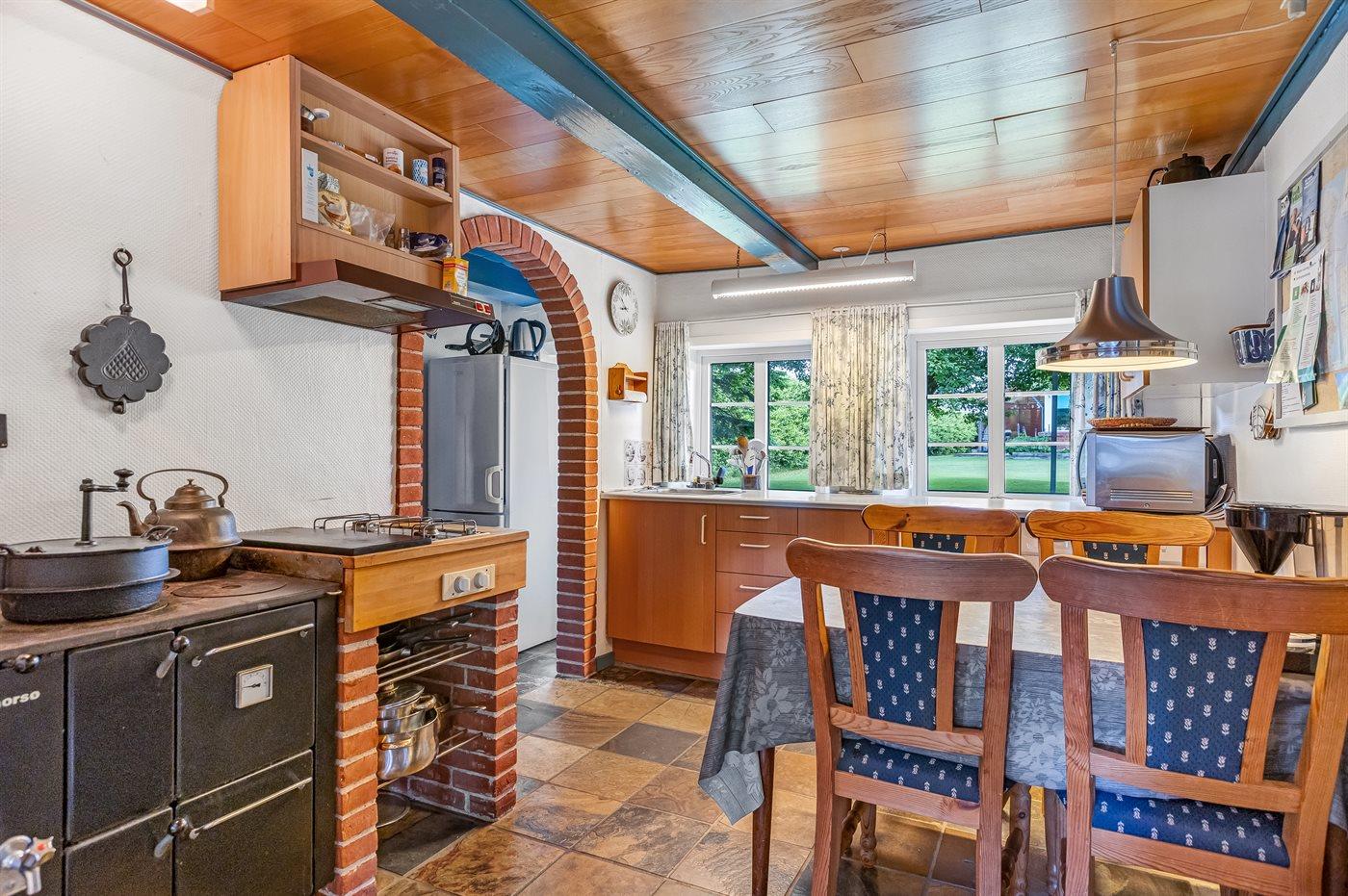 I husets køkken finder du bl.a. brændeovns-/trækomfur, som kan bruges med brænde – ligesom i de gode gamle dage.
