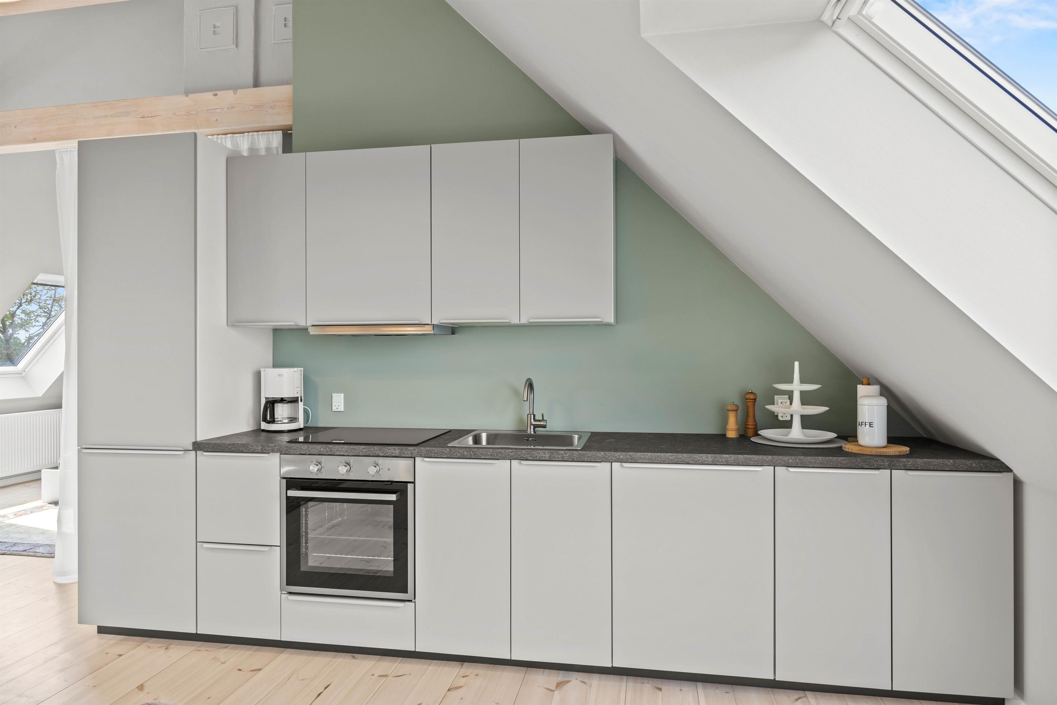 Køkkenet er fuldt udstyret med opvaskemaskine, køleskab med integreret frostboks og induktionskomfur med ovn, så I nemt kan tilberede lækre måltider, som I kan nyde i den rolige atmosfære. Badeværelset fremstår moderne og velholdt med naturligt lysindfald, og den hyggelige indretning med trægulve i ophold og soveværelser skaber en varm og indbydende stemning.