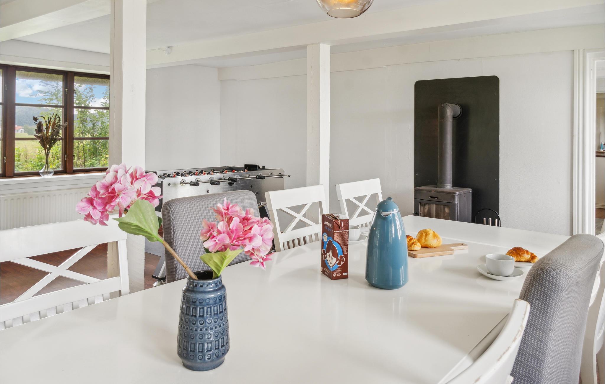 Huset ligger smukt placeret ud til marker og enge, så I kan begynde dagene med at iagttage de vilde dyr og lytte til tonerne af fuglesang. Huset består af fire soveværelser, et badeværelse, et godt køkken, spiseområde samt flere behagelige sofa arrangementer. Brændeovnen sørger for varme og hygge på kølige dage, mens I nyder måltiderne eller slapper af med indendørsaktiviteter. Efter en lang dag på farten er det herligt at få varmen i saunaen og spabadet, som giver jer mulighed for at tilføje lidt wellness til ferien. Den vidunderlige udsigt giver jer mulighed for at lade op i den skønne natur, lige fra I slår øjnene op om morgenen og kigger ud af vinduerne.