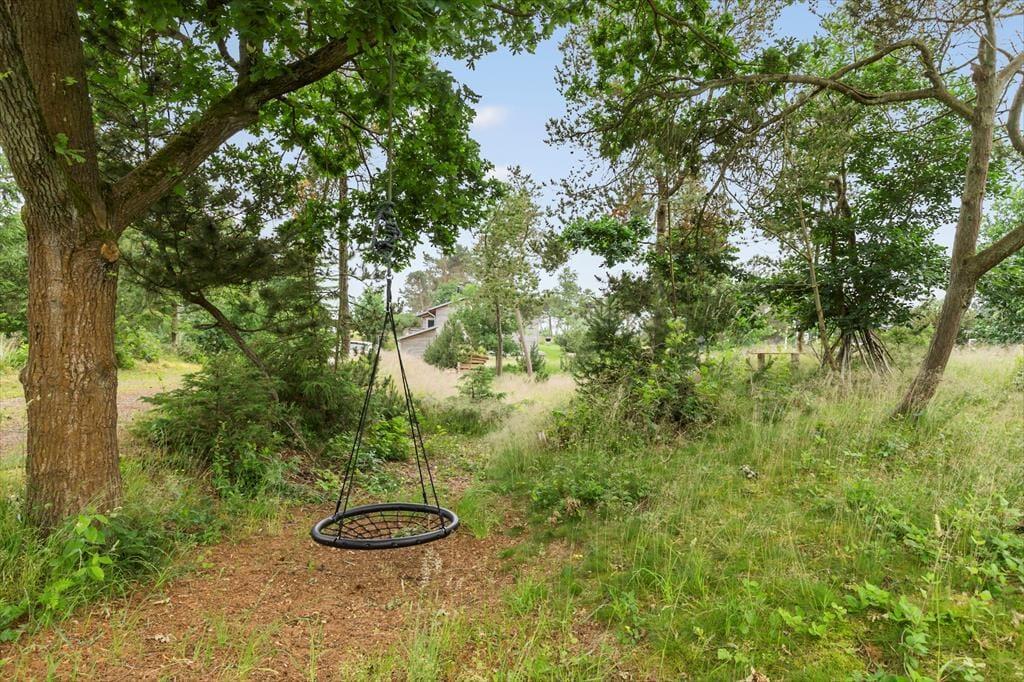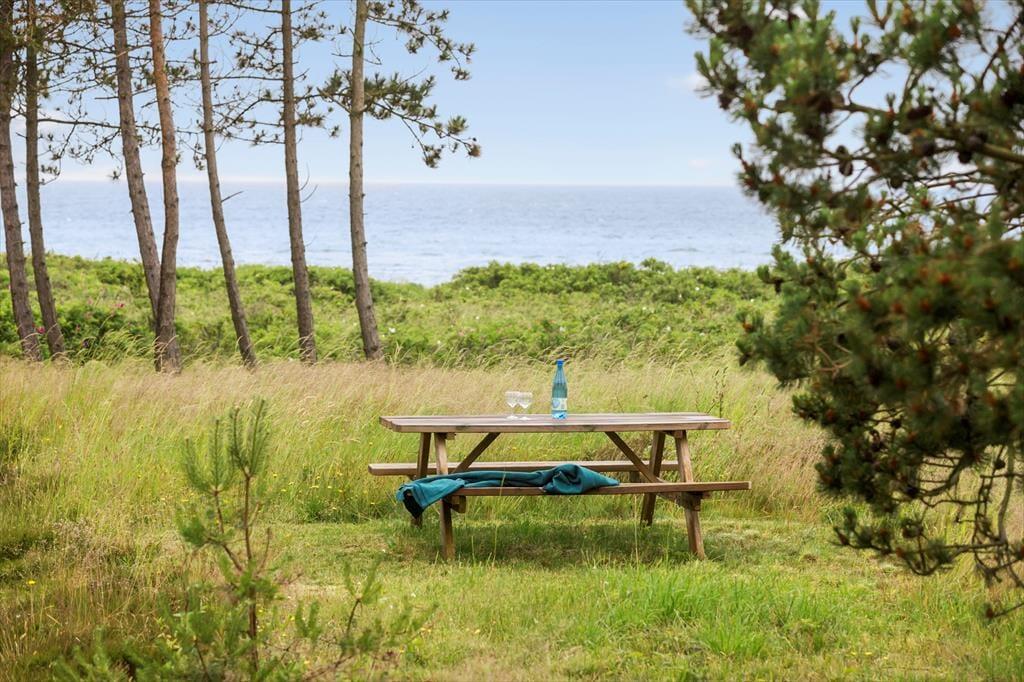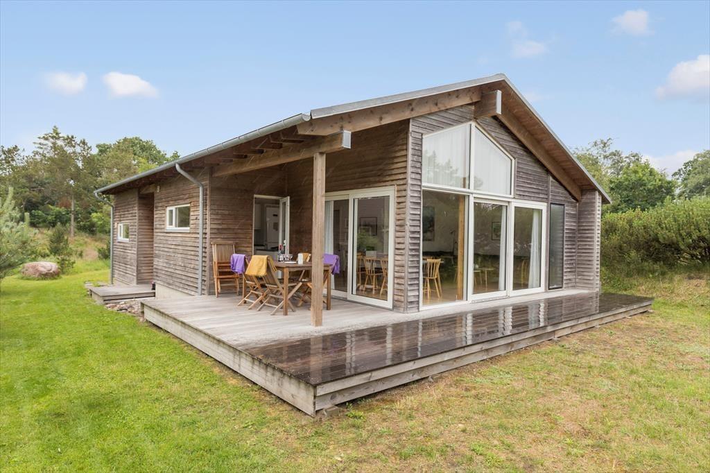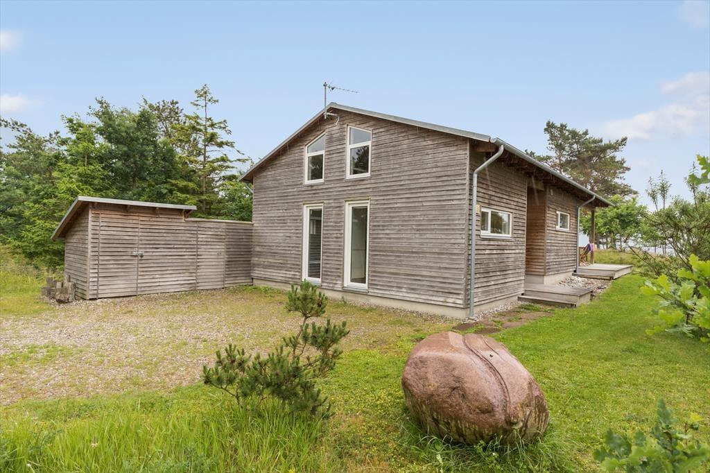 Huset er beliggende på en dejlig kæmpestor naturgrund med træterrasse og fantastisk havudsigt, Velegnet til leg og udendørsaktiviteter. Til huset hører skønne træterrasser med havemøbler, liggestole og grill. Hvis du er tidligt oppe, kan du opleve naturens egne dyr som går rundt og græsser. Du kan også tage en morgendukkert på 2 minutter er du nede ved vandet og kan tage et opfriskende bad.