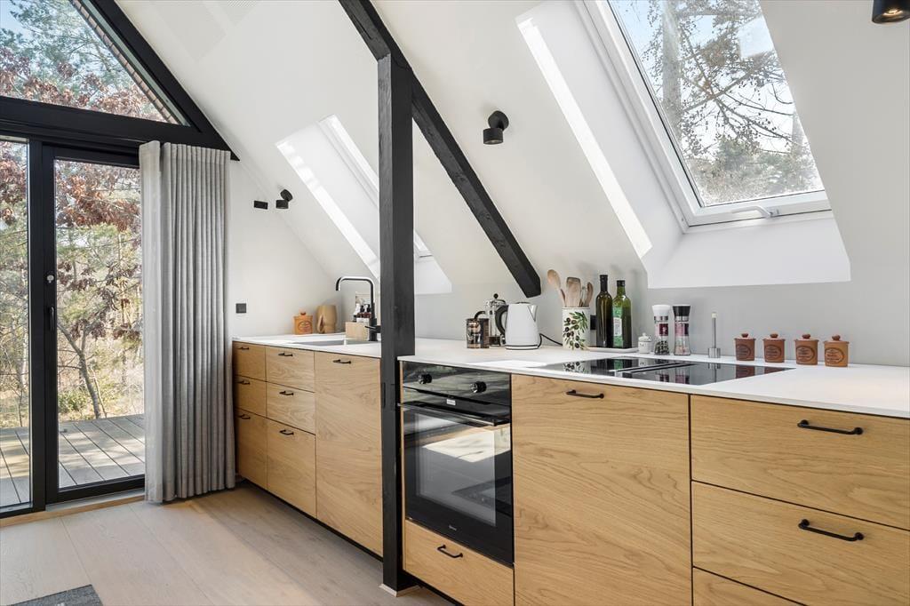 Huset rummer et nyt køkken (med opvaskemaskine) og en hyggelig spiseplads. Fra køkkenet har du direkte adgang til nord-øst terrasse med udsigt til skoven, hvor egern hopper rundt, og rådyr af og til kigger forbi. Stuen er åben og lys med store vinduer og adgang til endnu en sydlig terrasse, hvor du kan lytte til fuglene eller nyde synet af børnene, der leger på naturgrunden.
