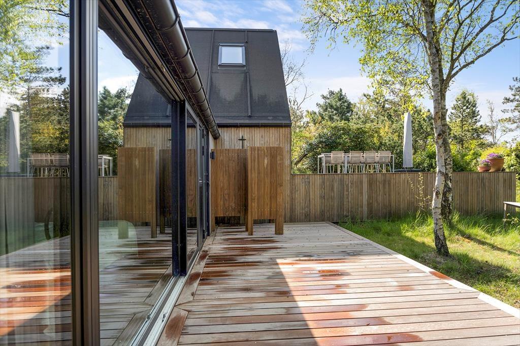 Med flere skønne terrasser omkring huset er der rig mulighed for at nyde udelivet. På den ene terrasse kan du slappe af med udsigt til skoven, mens den anden indbyder til hyggelige måltider og lange sommeraftener. Naturgrunden giver plads til fordybelse og afslapning. Blot 2 minutters gang har du næsten hele stranden for dig selv med den smukke udsigt over Vigen og mulighed for en dukkert, gåtur, leg, eller bare afslapning.