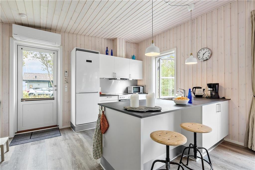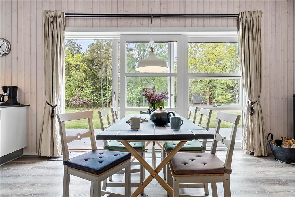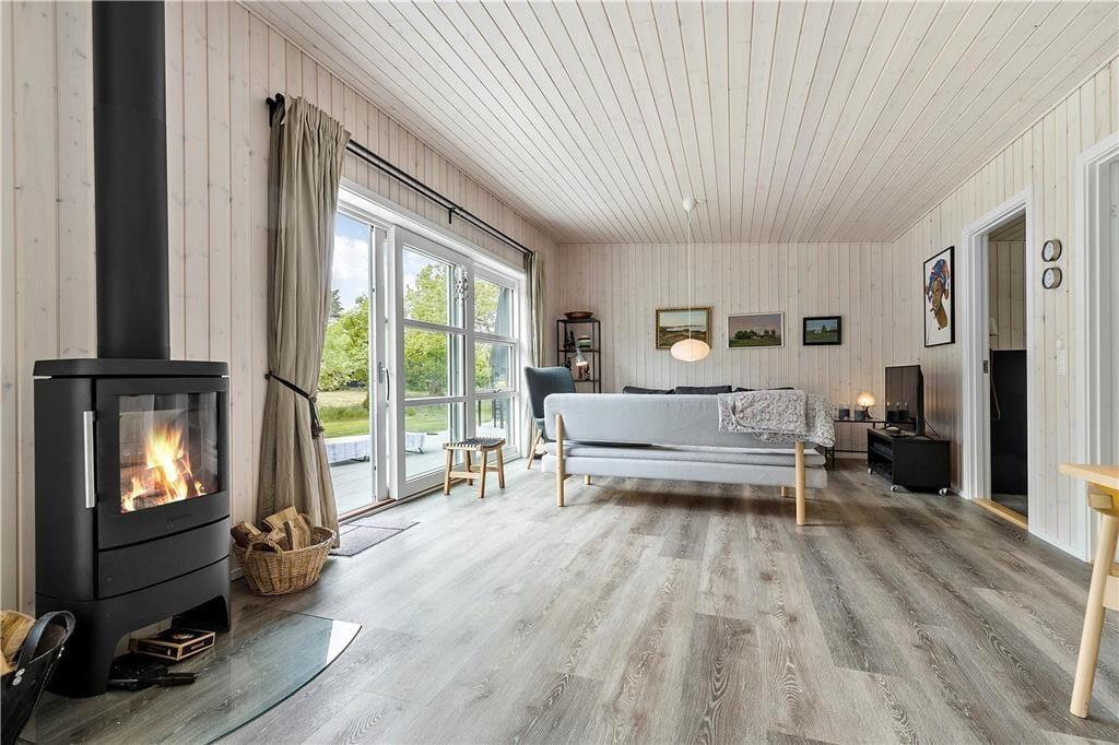 Indenfor mødes du af et lyst og velindrettet hjem. Den rummelige stue med brændeovn indbyder til hygge på kølige aftener og har direkte adgang til terrassen. I åben forbindelse med stuen ligger det moderne og veludstyret køkken med opvaskemaskine, der gør madlavningen nem og bekvem. Huset rummer tre komfortable soveværelser – to med enkeltsenge og et med dobbeltseng – samt et lækkert badeværelse med bruseniche og gulvvarme. For de digitale fornøjelser kan du streame dine yndlingsserier via husets Chromecast eller Apple-TV.