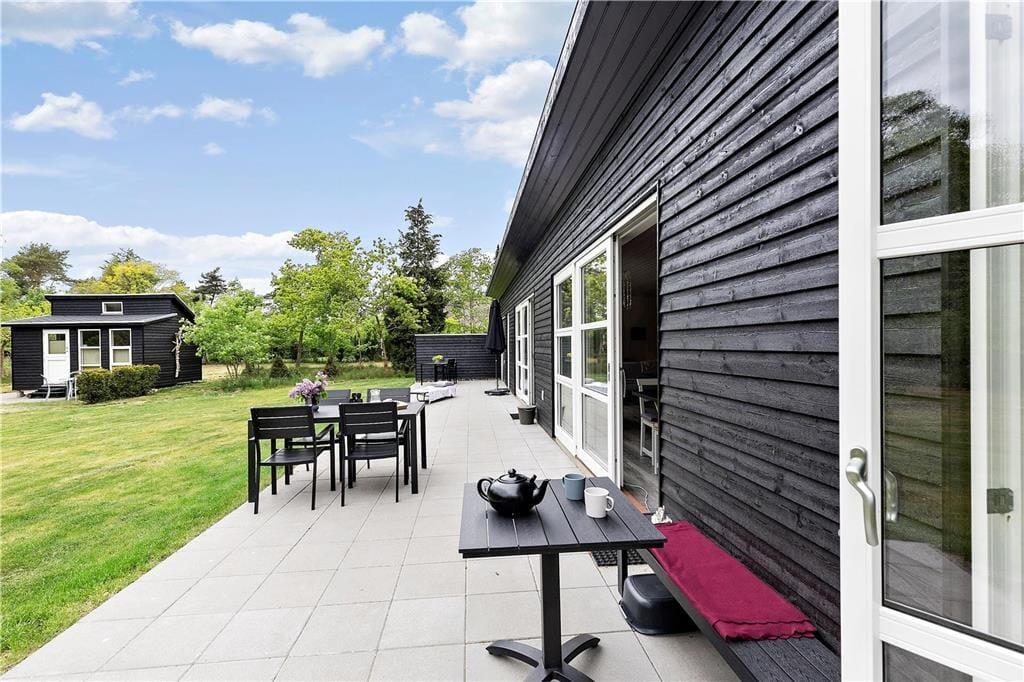 Den store flisebelagte terrasse er perfekt til måltider under åben himmel, mens børnene leger på den velplejede græsplæne. Havemøbler og grill står klar til sommerdage fyldt med afslapning og hygge. Beliggenheden tæt på stranden gør det nemt at tage en dukkert eller gå en tur langs kysten.