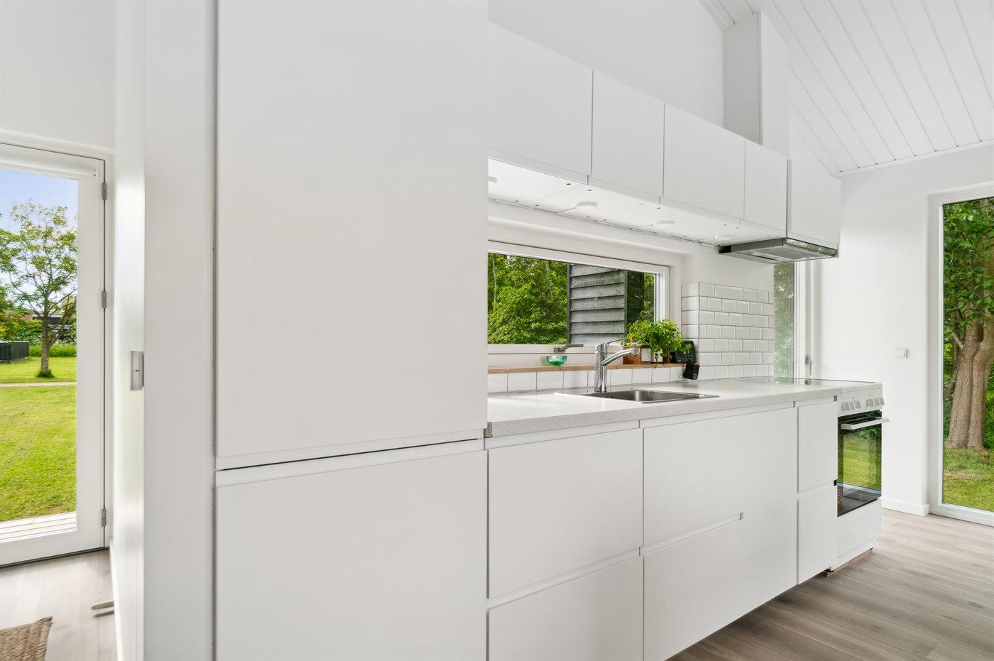 Køkkenet er udstyret med 1 køleskab. Der er 4 keramiske kogeplader, varmluftovn samt opvaskemaskine.
