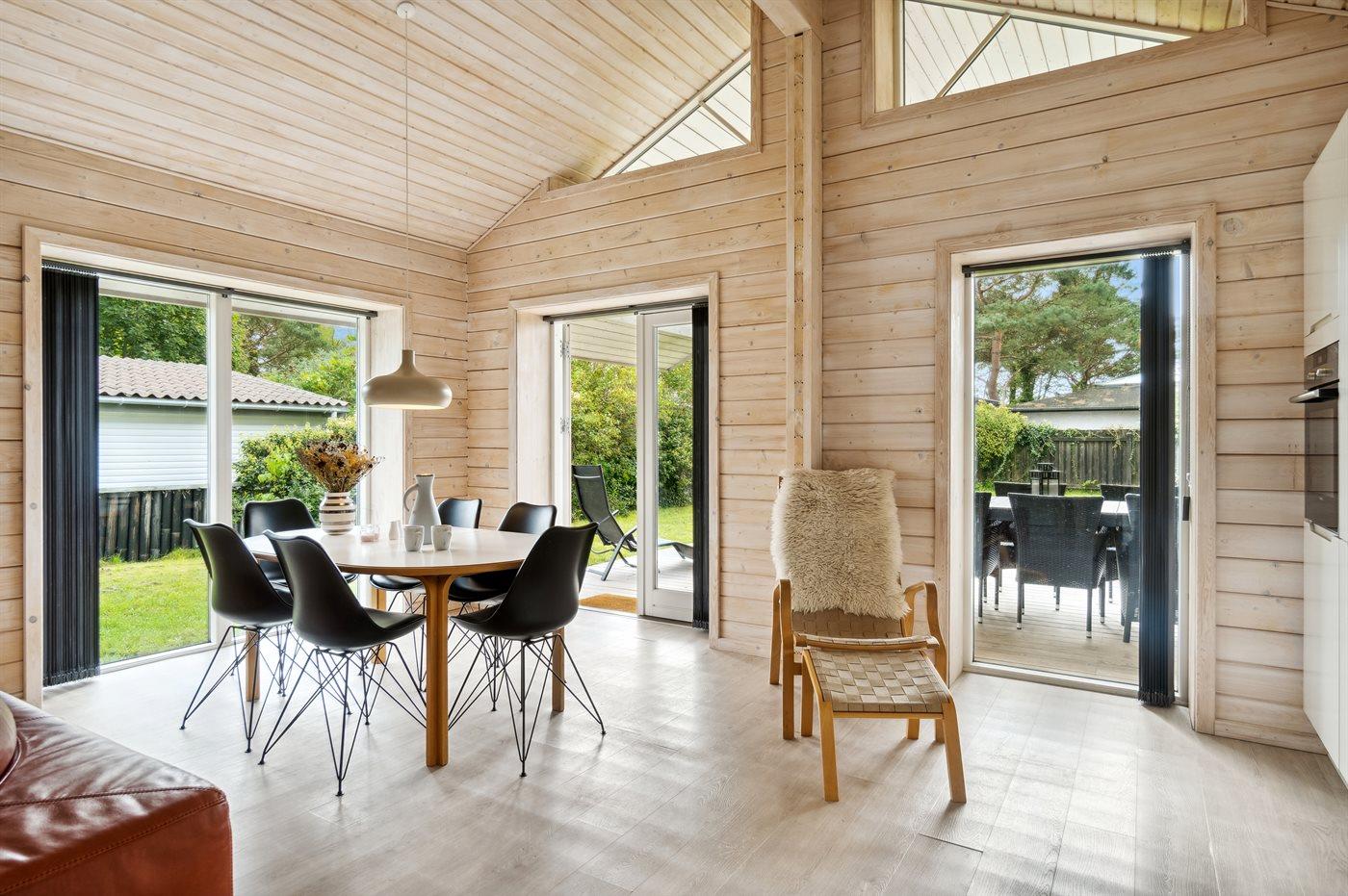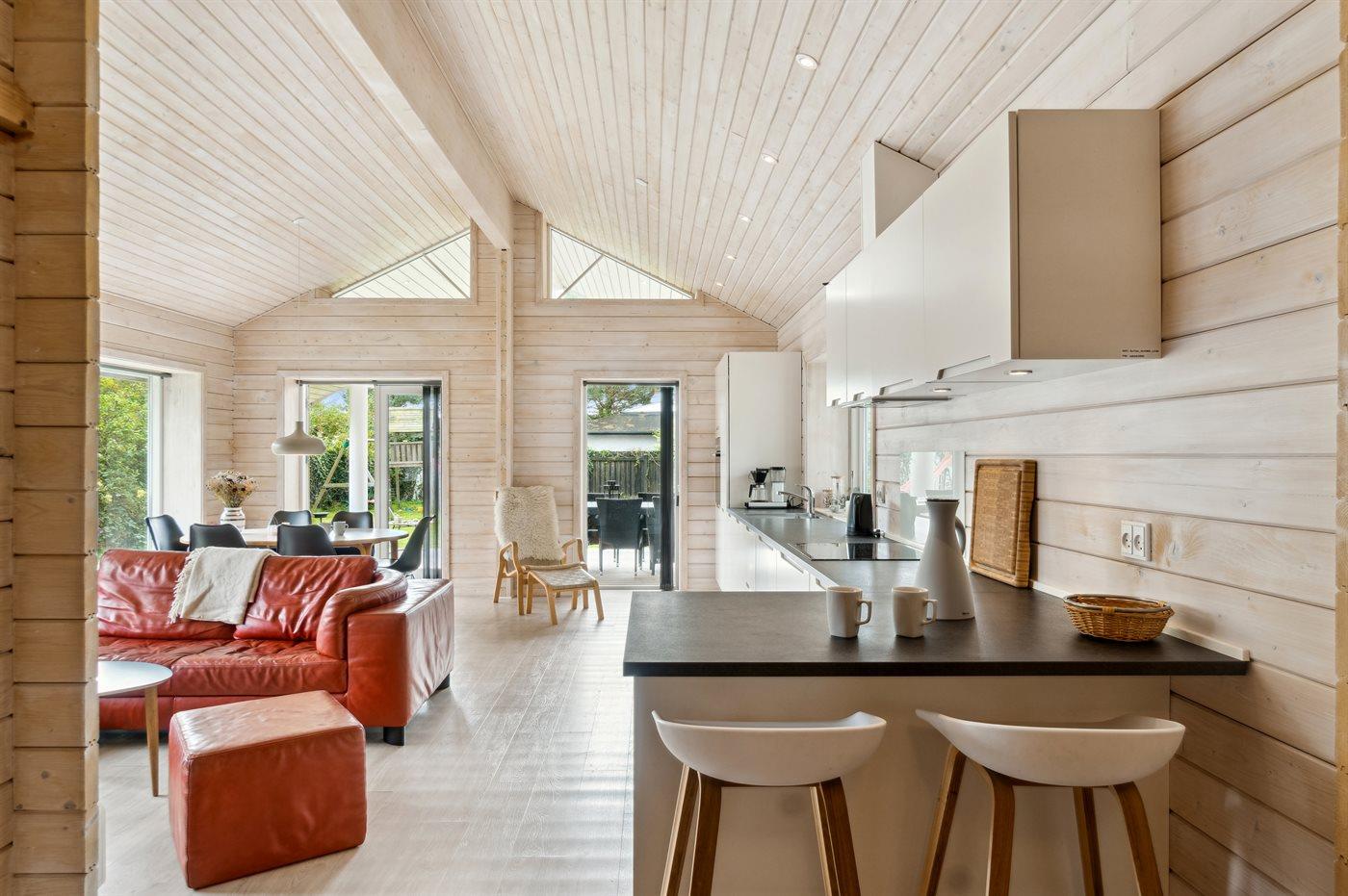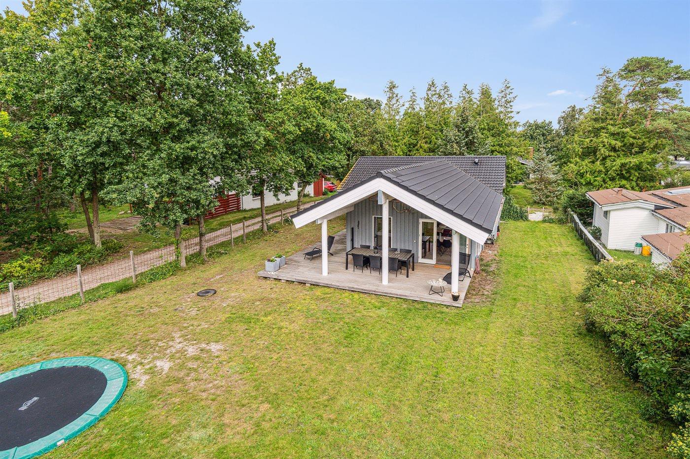 Sommerhuset fremstår lyst og moderne og med en god indretning, som passer rigtig fint til f.eks. en familie med 2 børn og eventuelt bedsteforældre med. Det store åbne køkken og stue i et med det store glasparti og med direkte adgang ud til den dejlige og overdækkede terrasse danner rammerne omkring en god ferie. Fra den skønne terrasse kan stilheden og de skønne omgivelser i særdeleshed nydes. Her er mulighed for at tage en kop kaffe under den overdækkede terrasse eller lægge sig i de to fine solstole og nyde ferien.