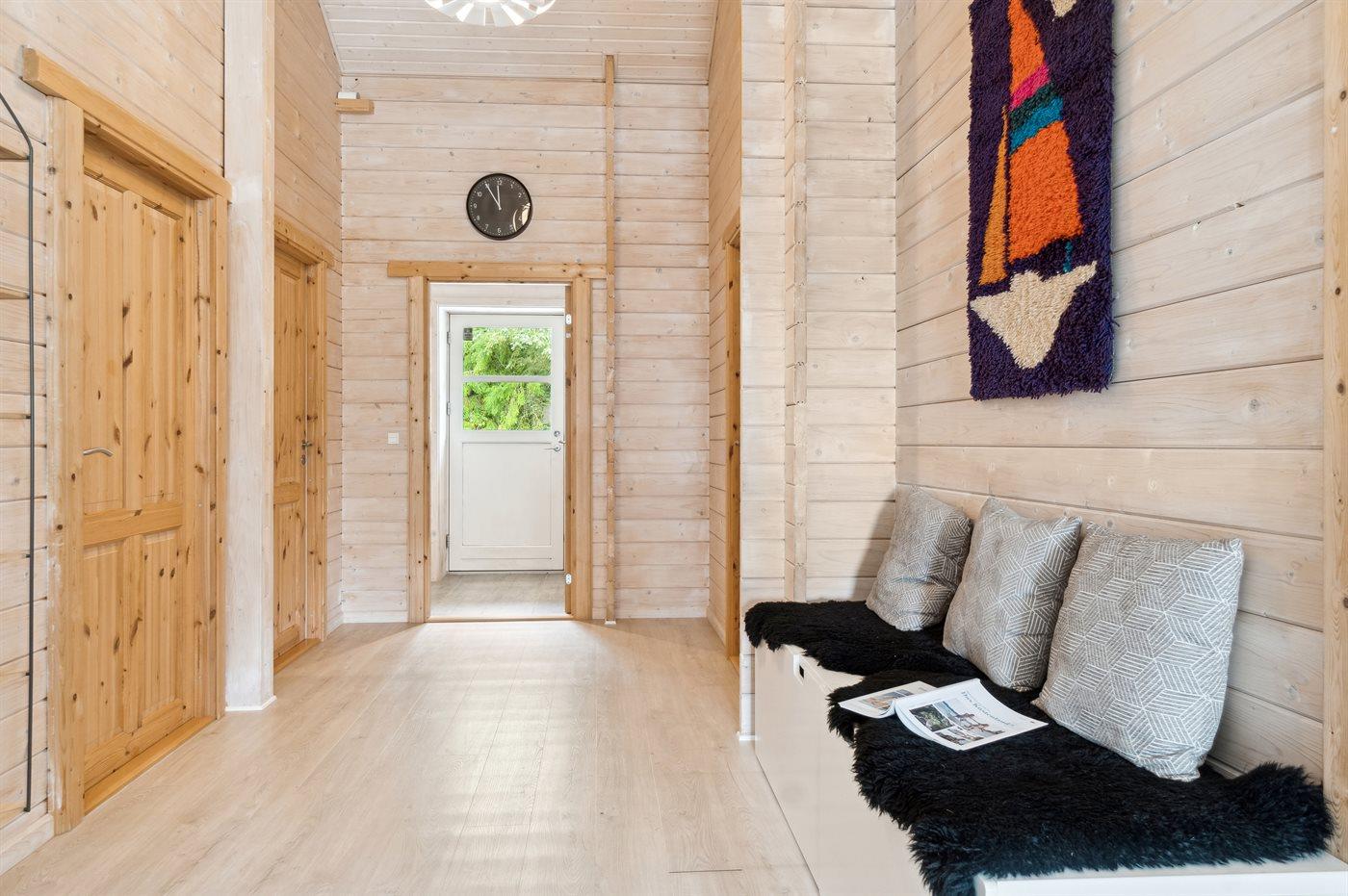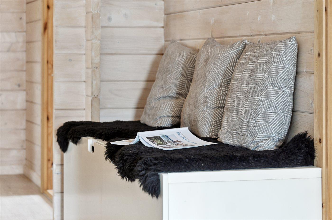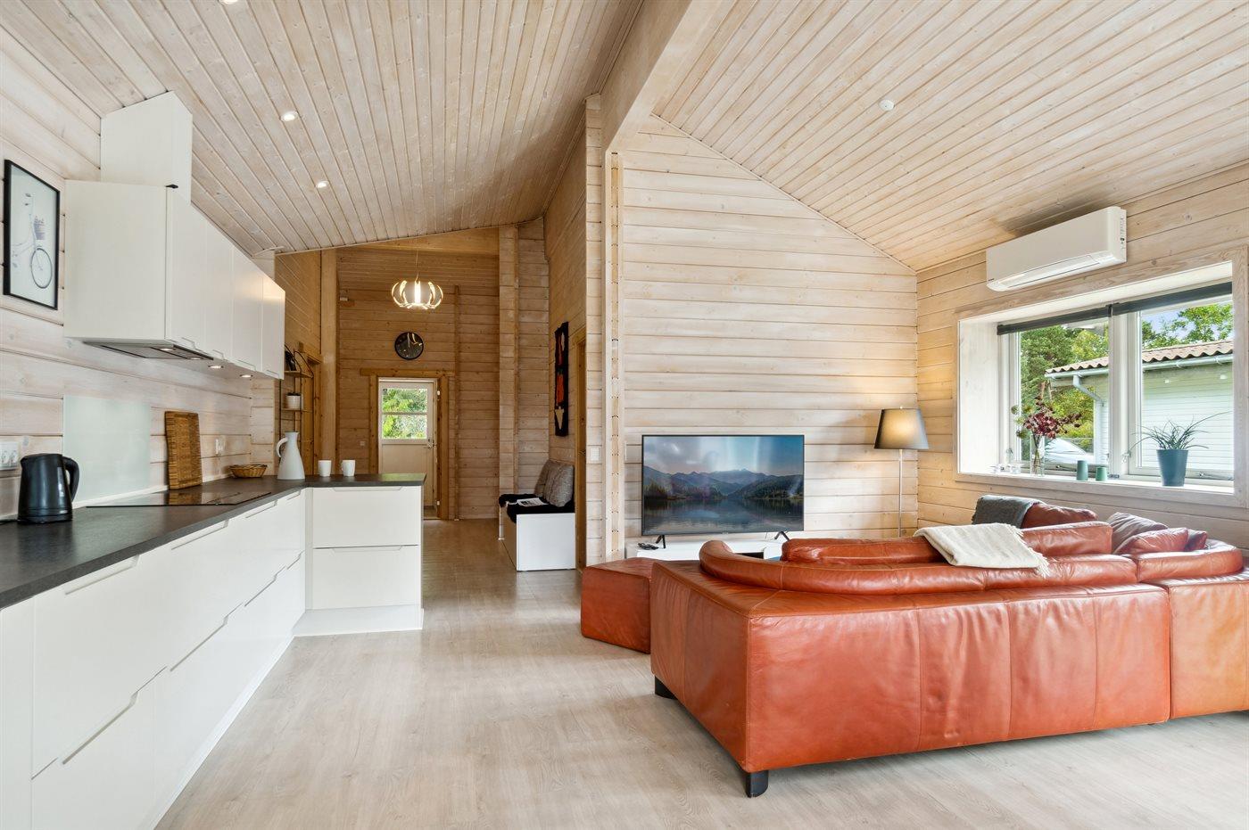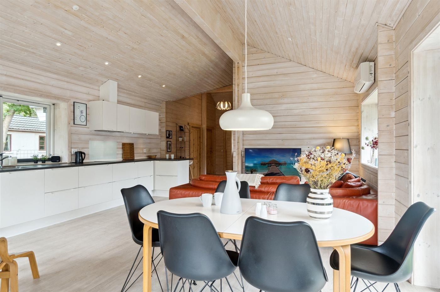Sommerhuset fremstår lyst og moderne og med en god indretning, som passer rigtig fint til f.eks. en familie med 2 børn og eventuelt bedsteforældre med. Det store åbne køkken og stue i et med det store glasparti og med direkte adgang ud til den dejlige og overdækkede terrasse danner rammerne omkring en god ferie. Fra den skønne terrasse kan stilheden og de skønne omgivelser i særdeleshed nydes. Her er mulighed for at tage en kop kaffe under den overdækkede terrasse eller lægge sig i de to fine solstole og nyde ferien.