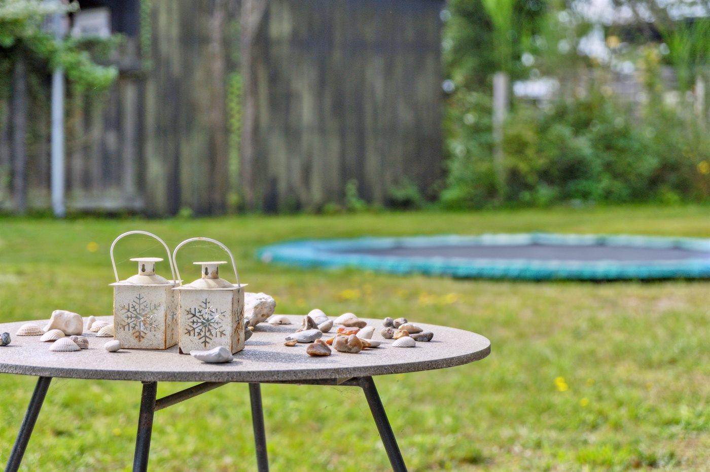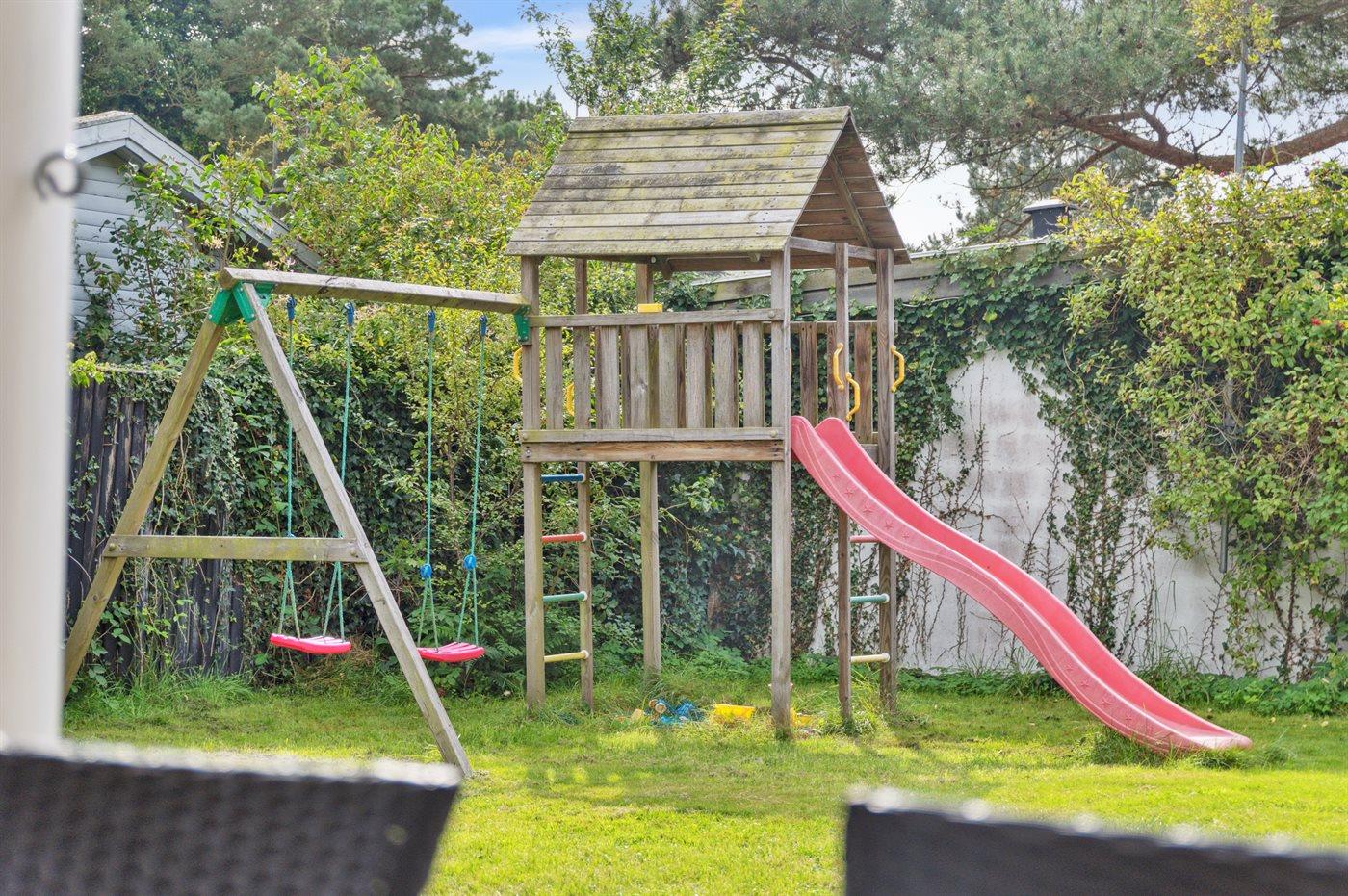 Ferieboligen er beliggende på en 680 m² stor naturgrund. Der er 150 m til havet. Nærmeste forretning er beliggende i en afstand af 2000 m. Til ferieboligen hører åbent terrasseareal. Desuden er der overdækket terrasse. Sandkasse. Trampolin. Legetårn. Rutchebane. Udendørs bruser. Der er installeret stik til opladning af elbil. Parkering ved ferieboligen.