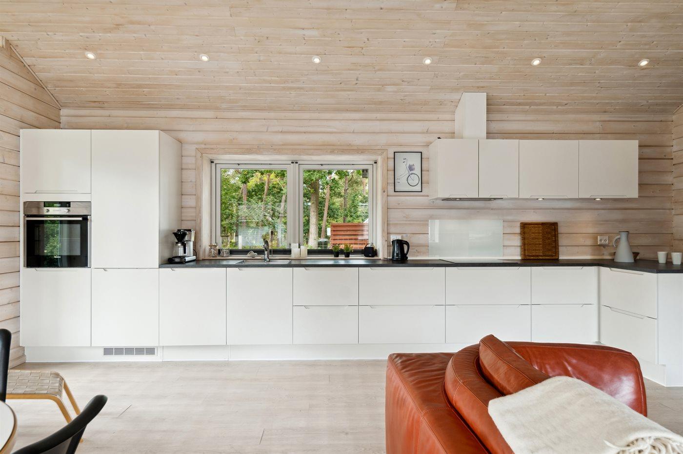 Køkkenet er udstyret med 1 køleskab. Der er 4 keramiske kogeplader, varmluftovn, mikrobølgeovn samt opvaskemaskine.