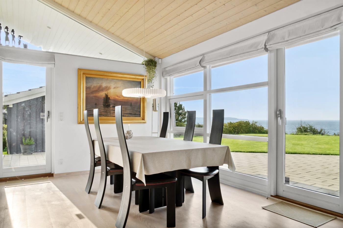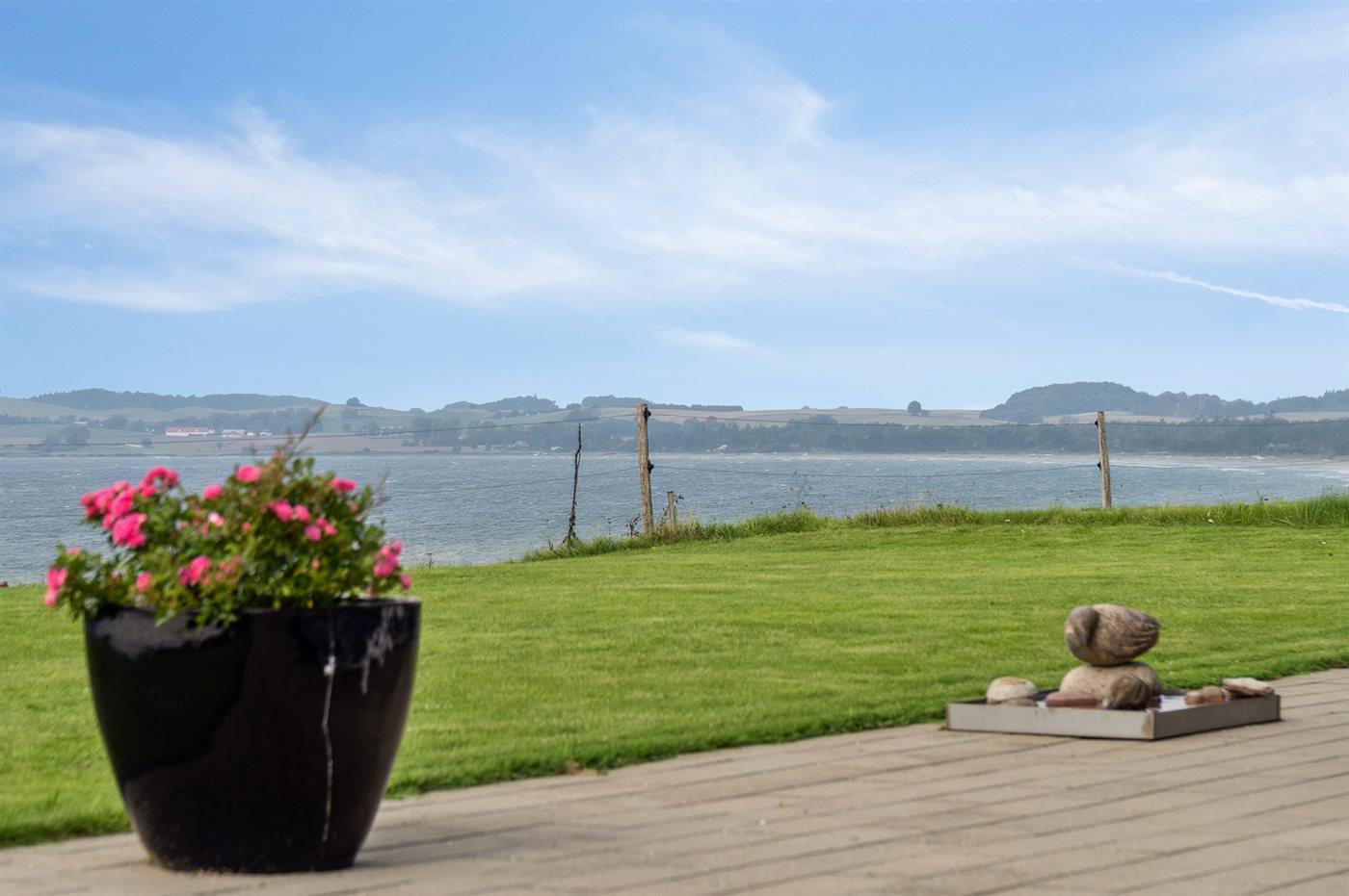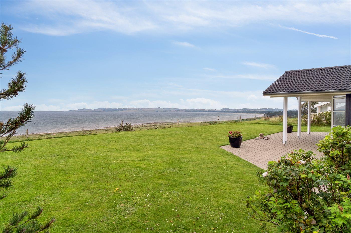 Dette skønne og meget velholdte sommerhus er beliggende ganske eminent med 180 graders panorama udsigt over vandet - en bedre og flottere udsigt er svær at finde. Udsigten er også i fokus inde fra sommerhuset, hvorfra den unikke udsigt bl.a. kan nydes til fulde fra både stue, køkken og soveværelse. Huset har et fantastisk terrasseareal, som også er delvist overdækket ud imod vandet. Her er altid mulighed for at finde en lækrog, da terrassen på husets forside ligger i læ og ganske ugenert.