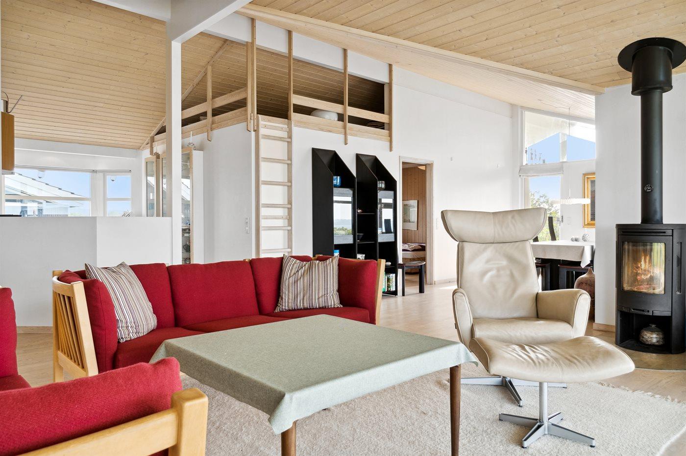 Indvendigt er sommerhuset godt indrettet, og husets hjerte er den store åbne stue med bl.a. spiseplads, hvor de store vinduespartier fremhæver den unikke beliggenhed. Sommerhuset passer rigtig godt til f.eks. en familie med 2 børn og med mulighed for at tage bedsteforældre med, da huset indeholder tre gode soveværelser.