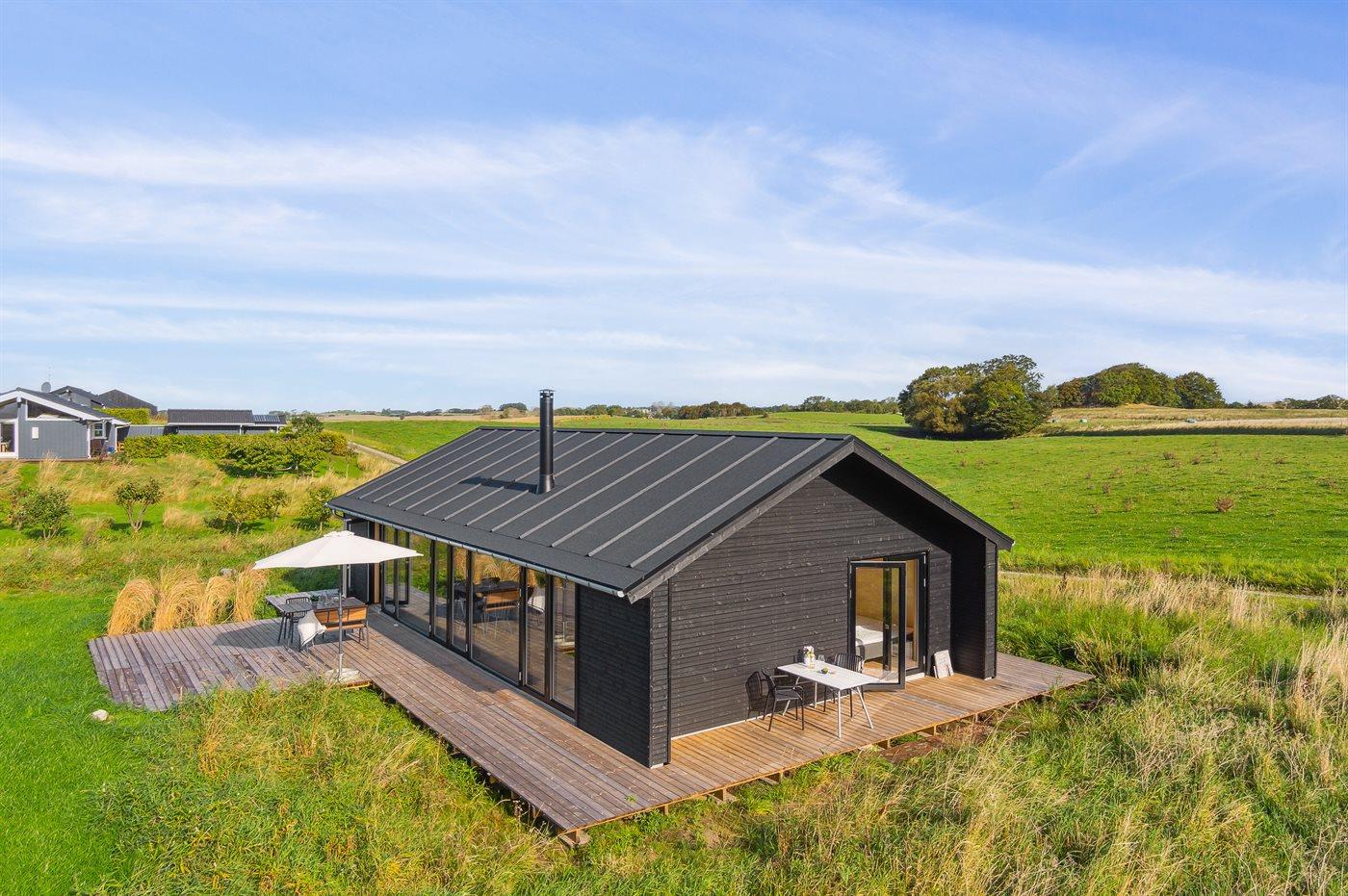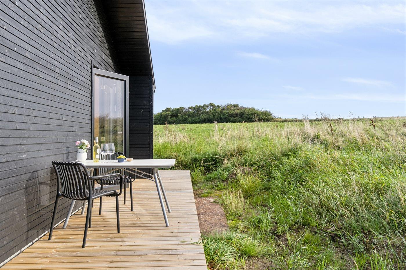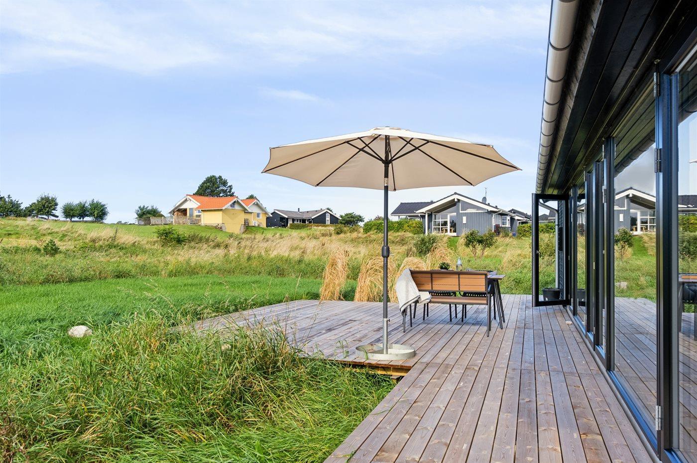 Nybygget sommerhus fra 2024 tæt på vandet ved Begtrup Vig på Djursland med stor terrasse og moderne faciliteter.