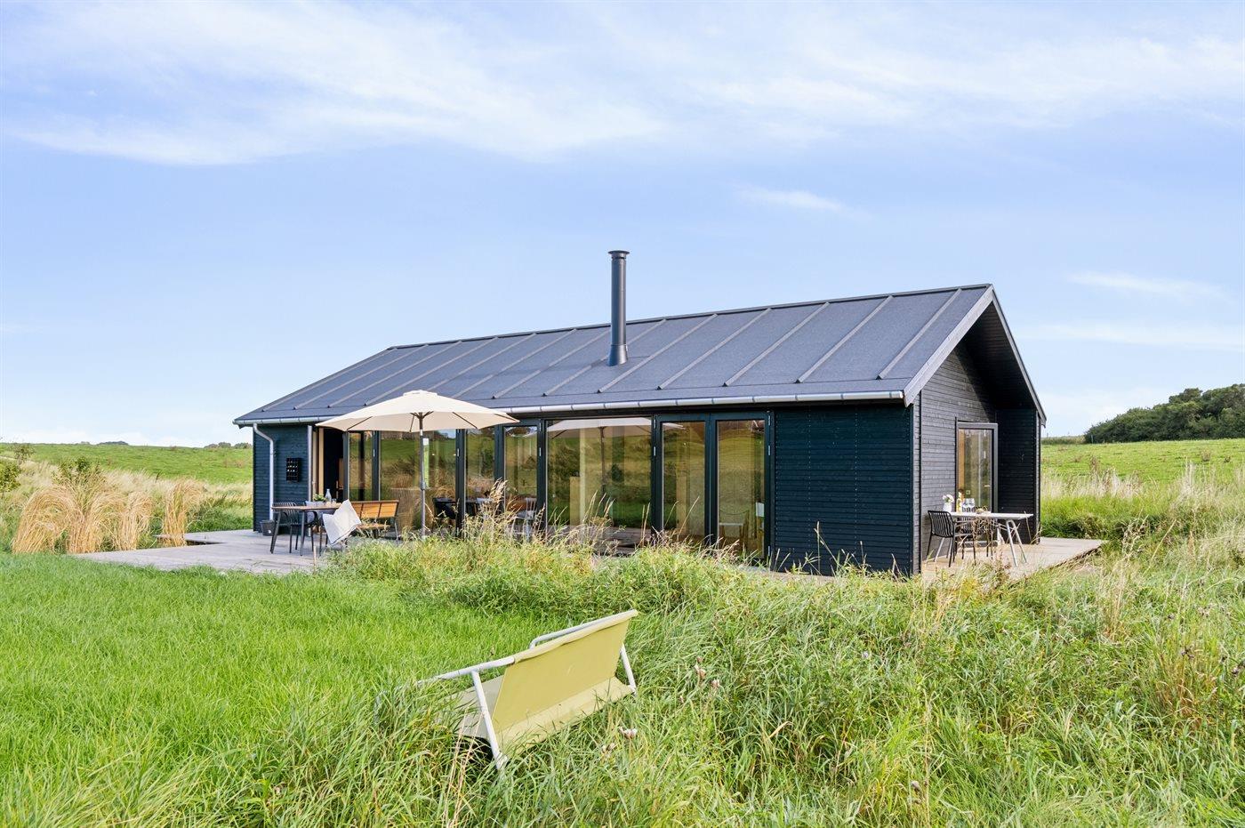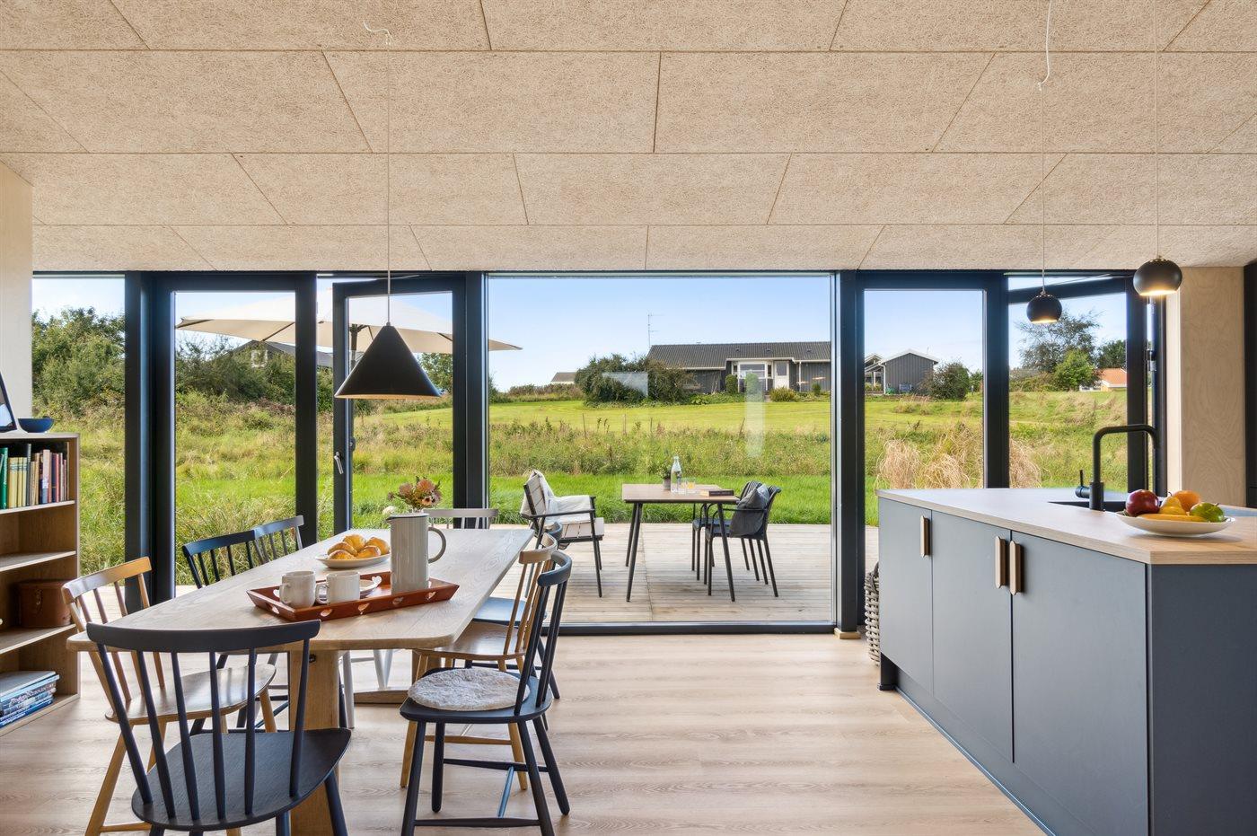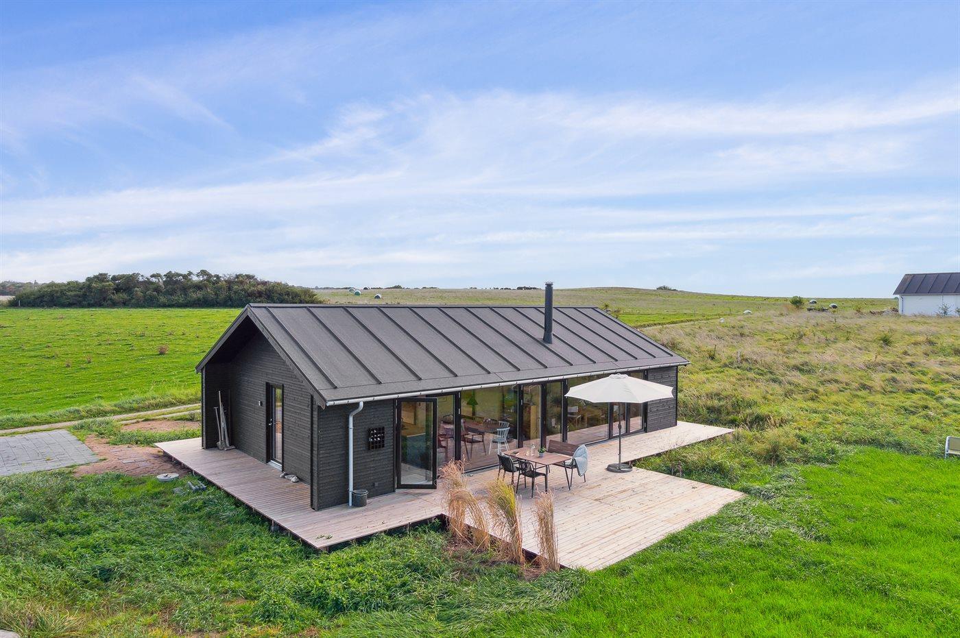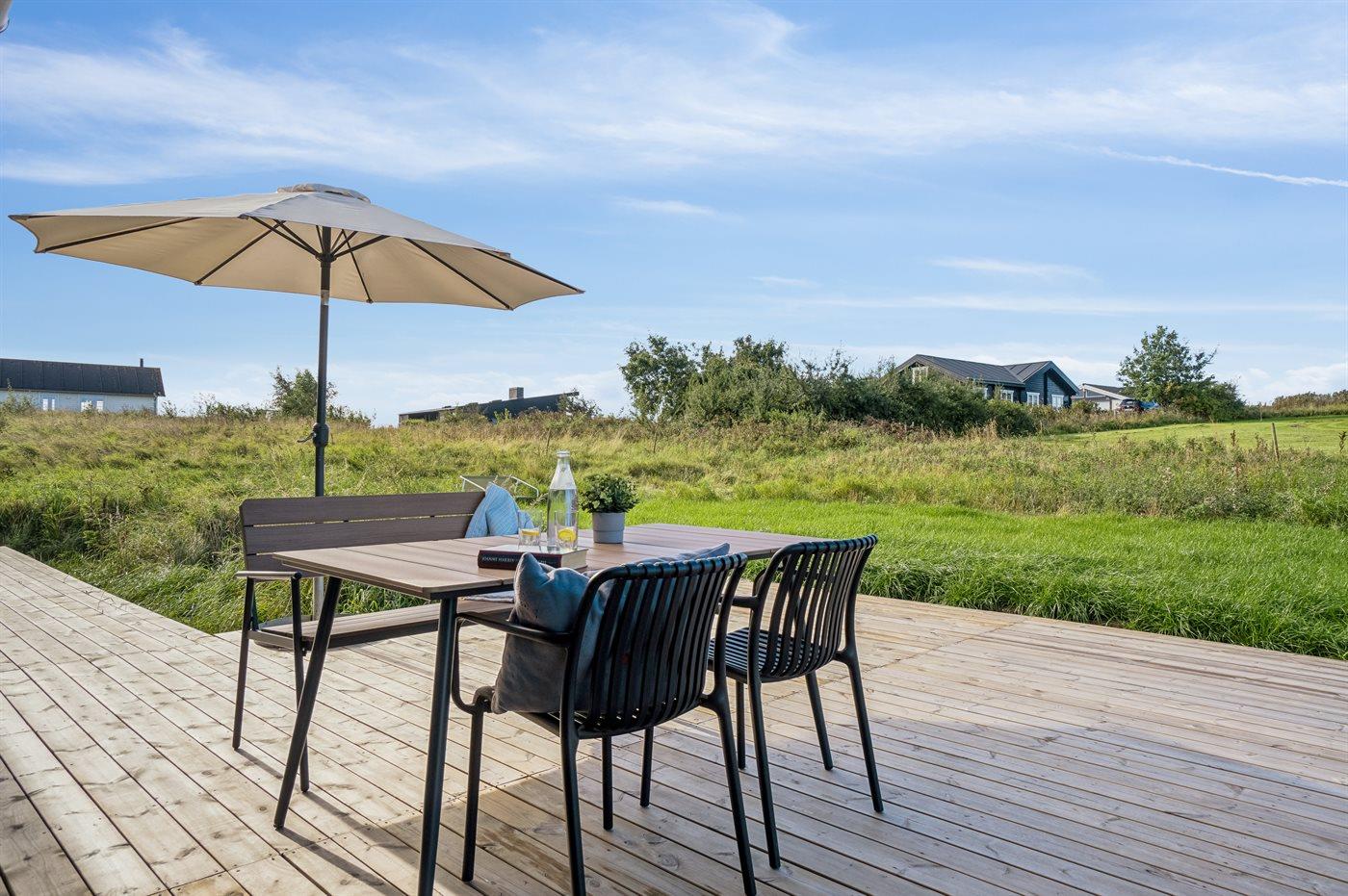 Nybygget sommerhus fra 2024 tæt på vandet ved Begtrup Vig på Djursland med stor terrasse og moderne faciliteter.