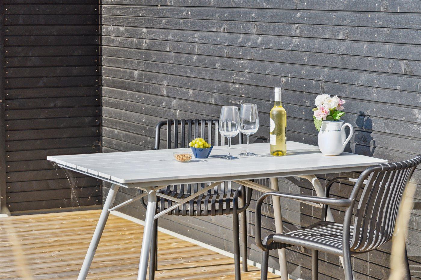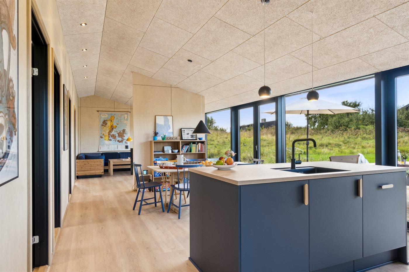 Sommerhuset er gennemført og fremstår præcist, som man forventer af et nybygget sommerhus. Planløsning er rigtig god og optimalt udnyttet uden nogen former for spildplads. Husets hjerte er det store og dejlige køkken/alrum og integreret stue i ét, hvor der er masser af plads og et helt oplagt sted at samle familien. Her er direkte adgang til den skønne terrasse, som går hele vejen rundt om huset og gør det ganske let at finde et hjørne med læ, hvor man kan sidde og nyde solen. Fra terrassen er der et godt udsyn over haven, hvor børnene kan hygge sig, imens de voksne nyder en kop kaffe eller et glas vin.