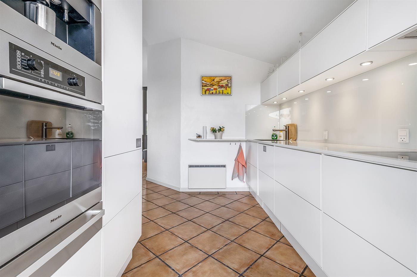 Køkkenet er udstyret med 1 køleskab. Der er 4 induktionskogeplader, varmluftovn, mikrobølgeovn samt opvaskemaskine.
