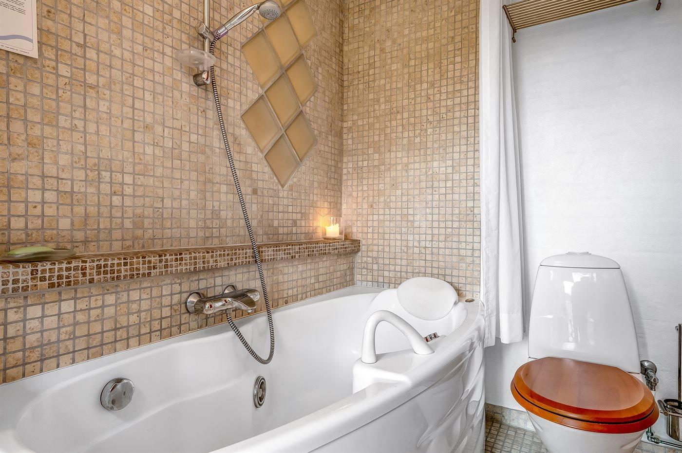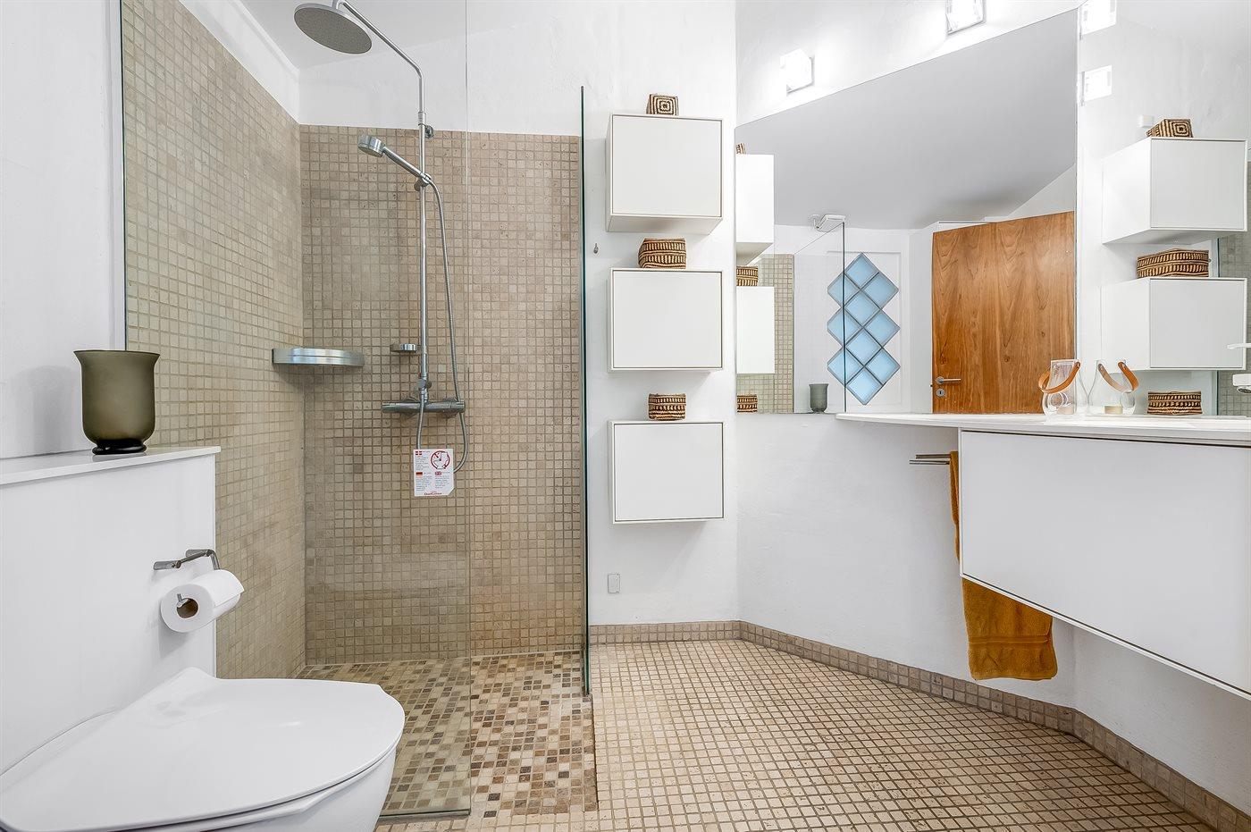 Der er 2 badeværelser med bruseniche og 2 toiletter. Der er gulvvarme på 2 badeværelser.