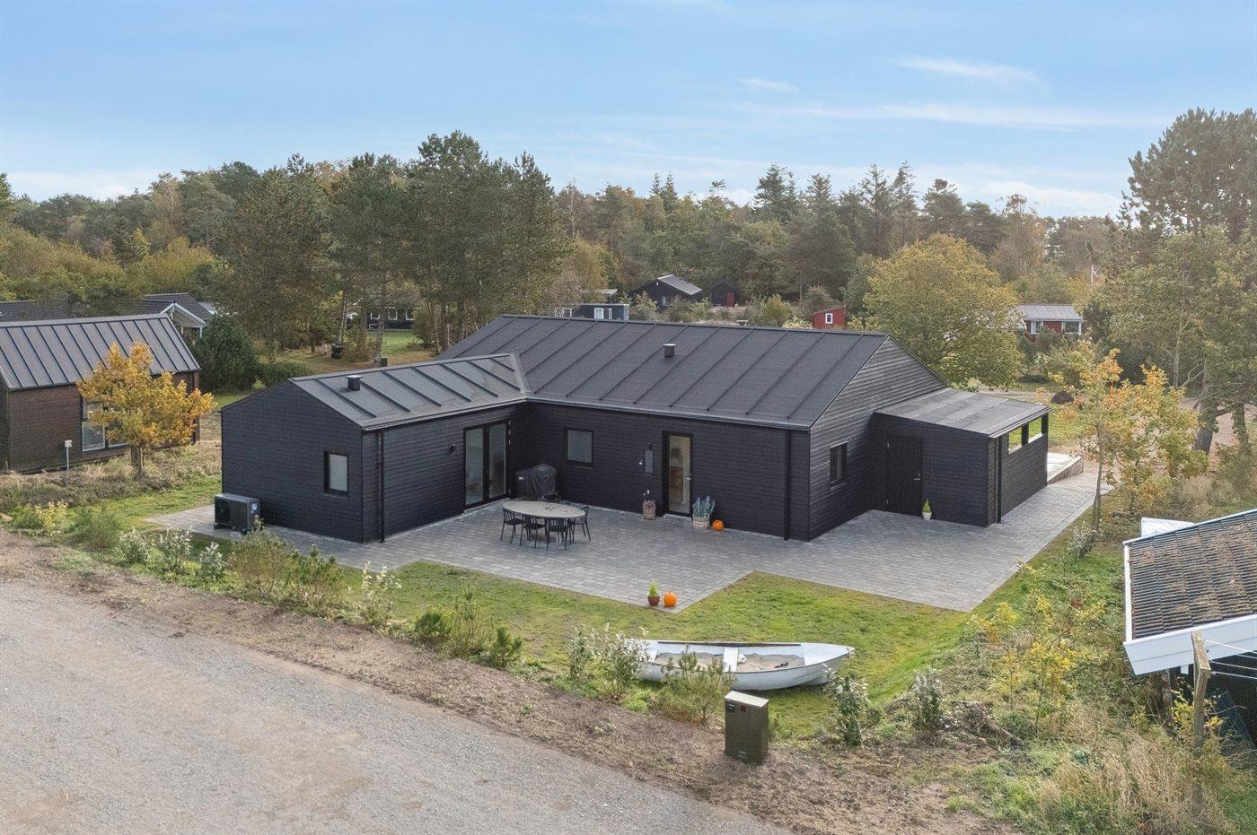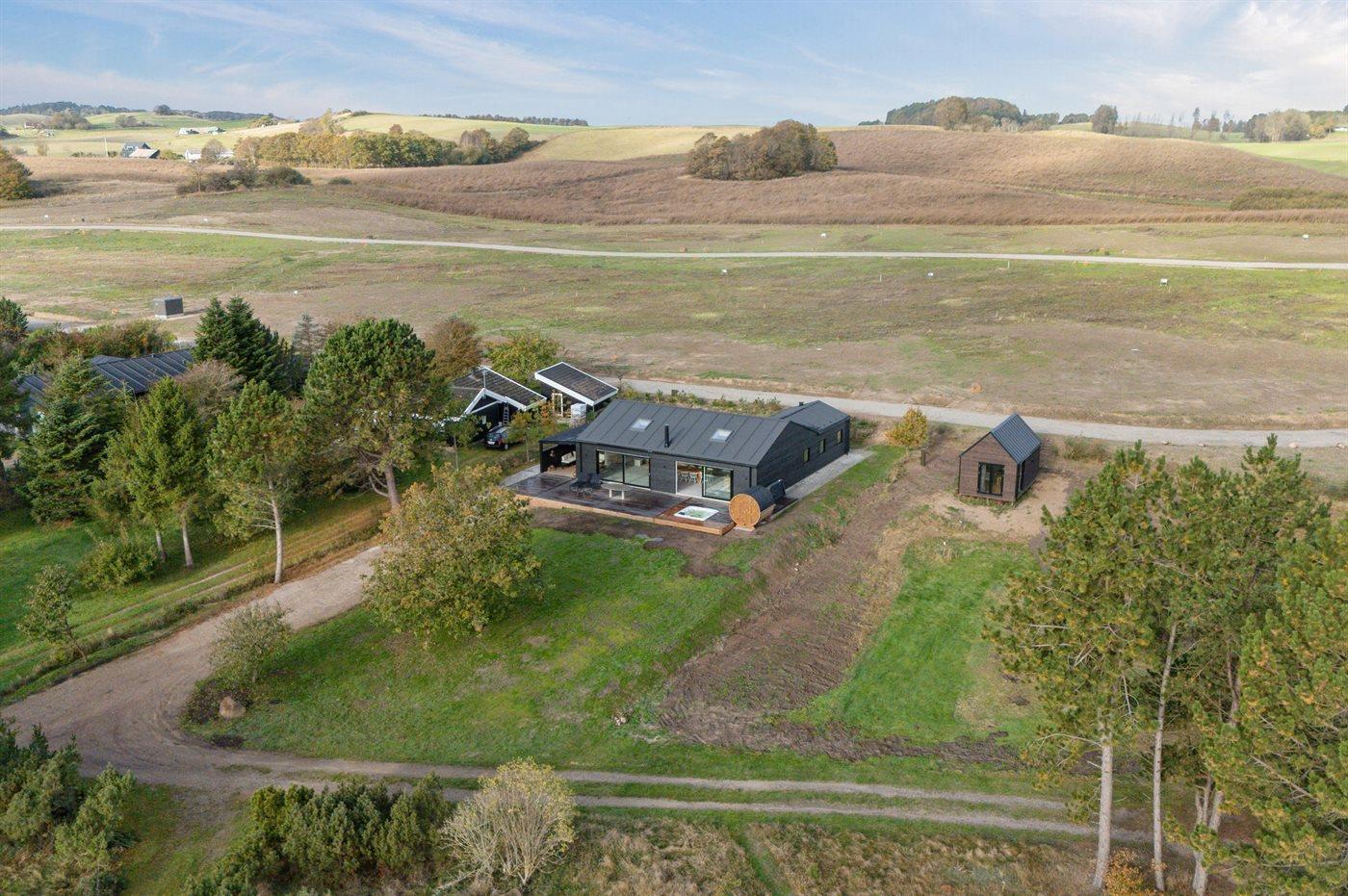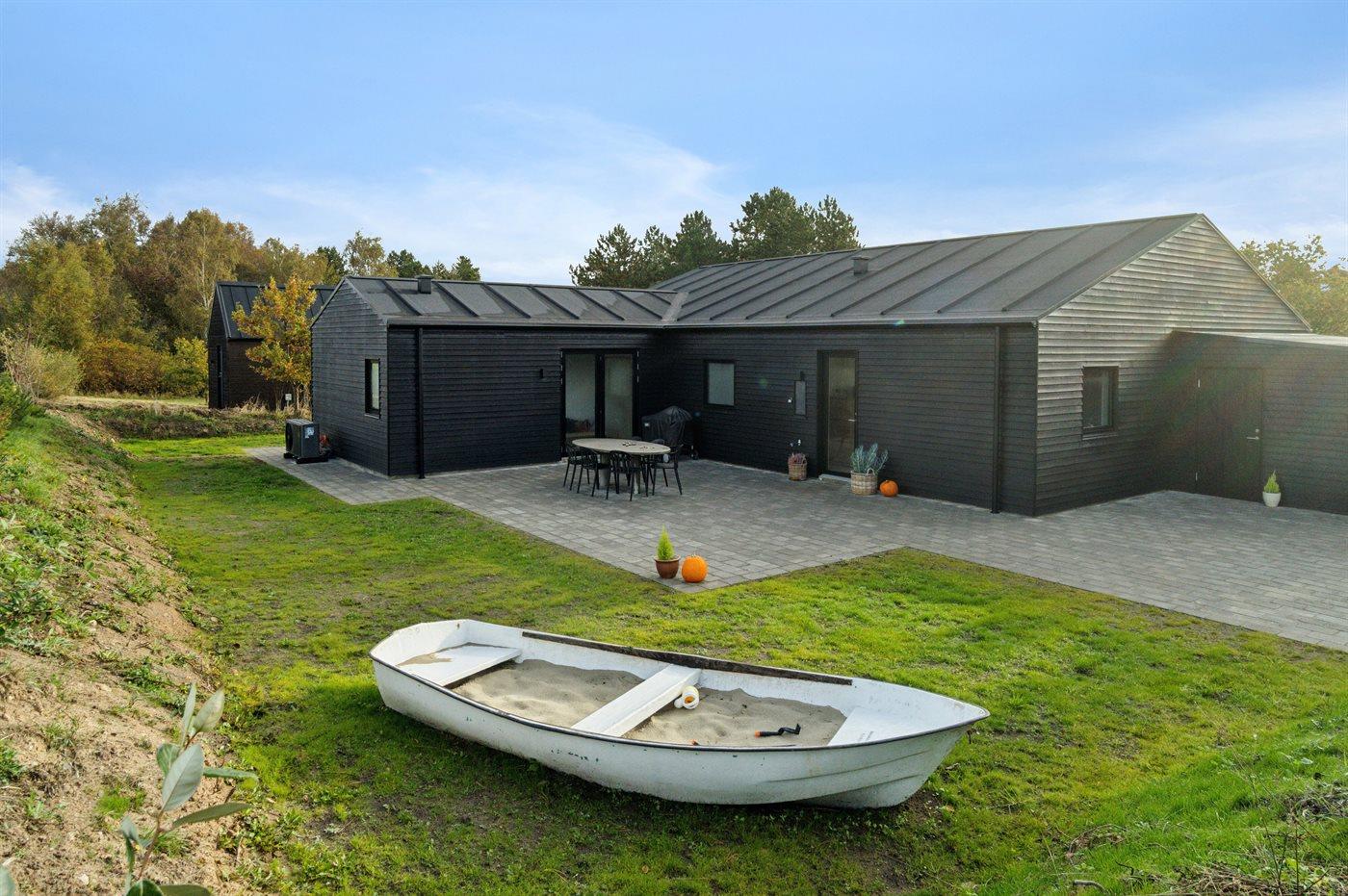 Huset står skarpt på grunden med sort facade og en stor sydvendt terrasse. Her findes der spa, sauna, overdækket lounge og flere små kroge fordelt rundt om huset. Alt er gennemført. Det er tilladt at medbringe familiens firbenede ven, og der er god plads udenfor.