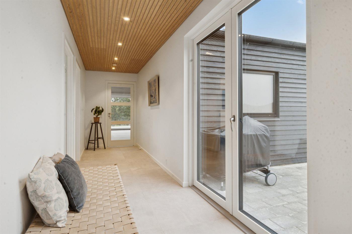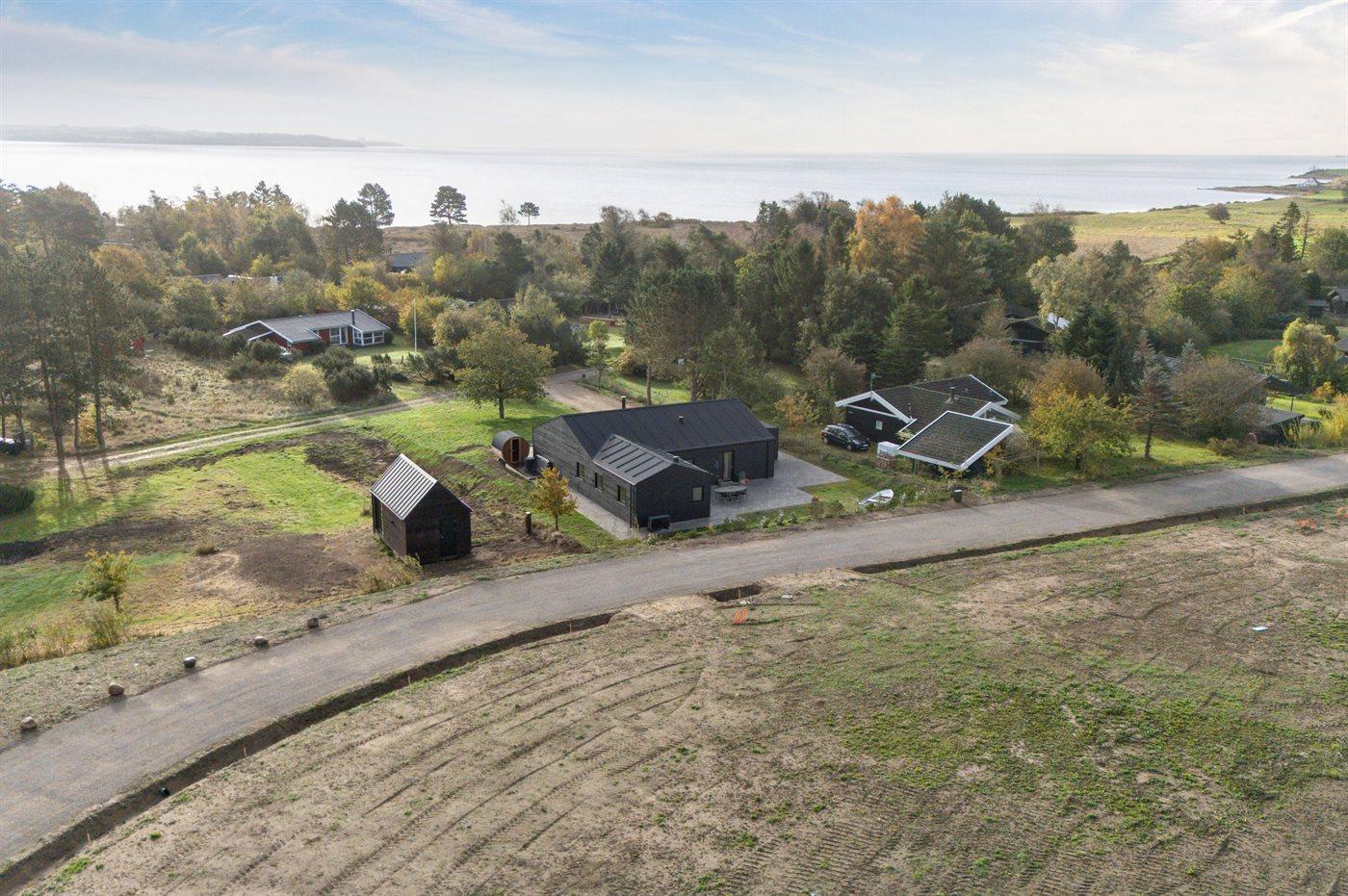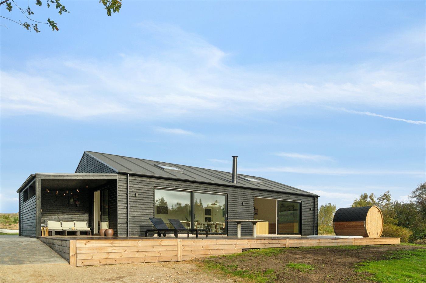 Moderne sommerhus ved Begtrup Vig med spa, sauna og stor terrasse nær stranden.