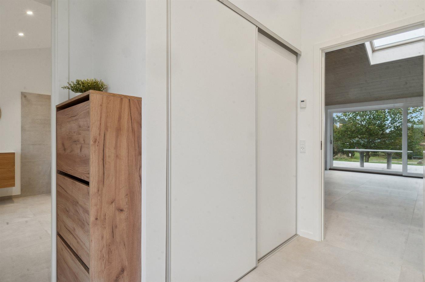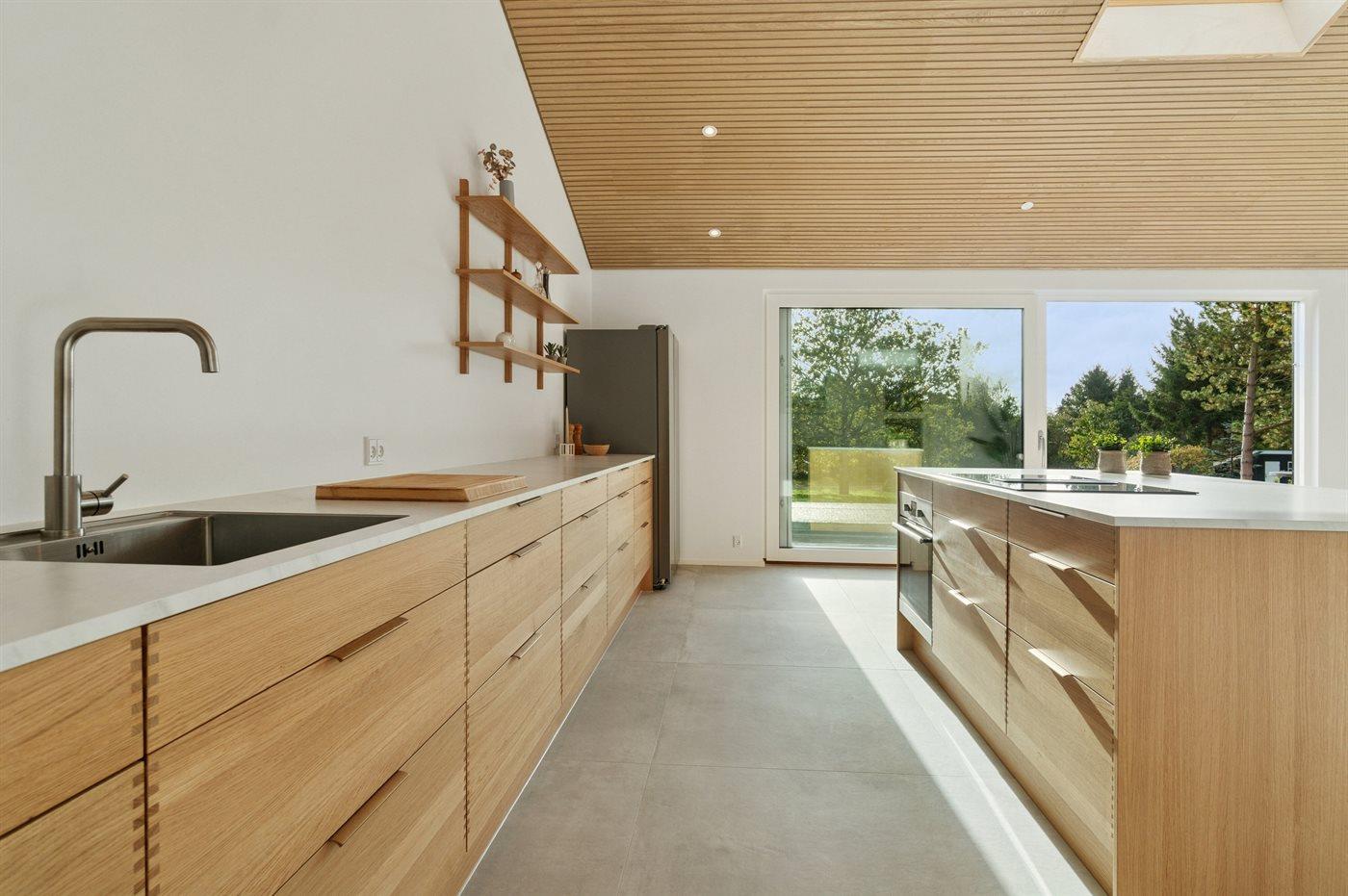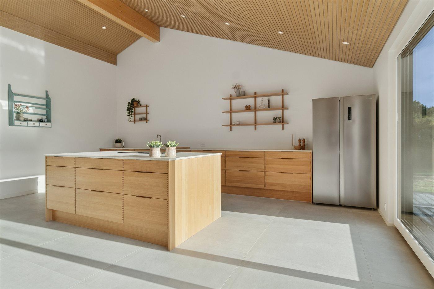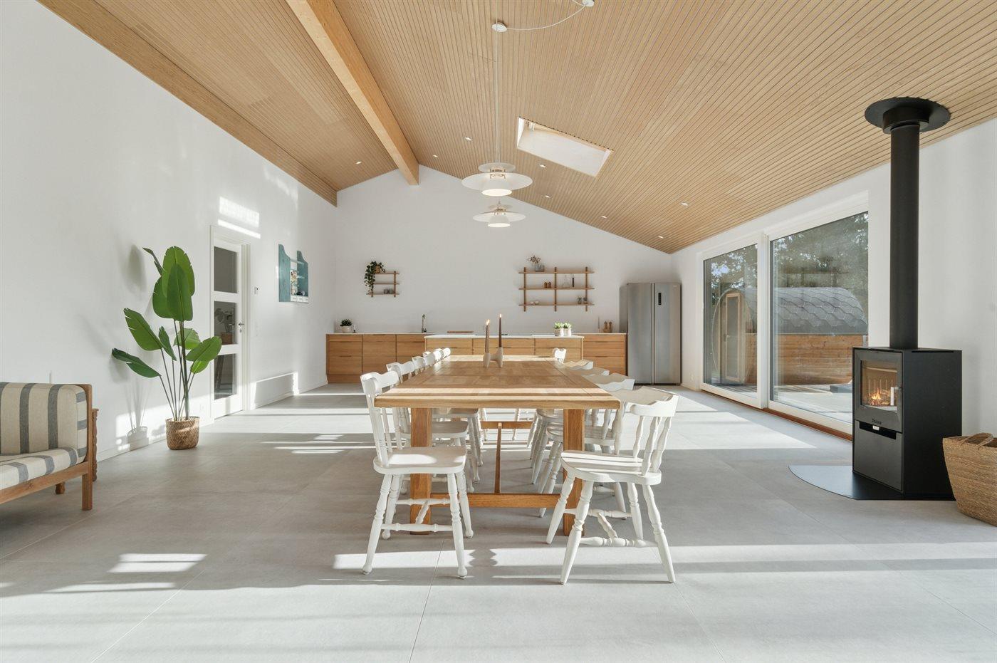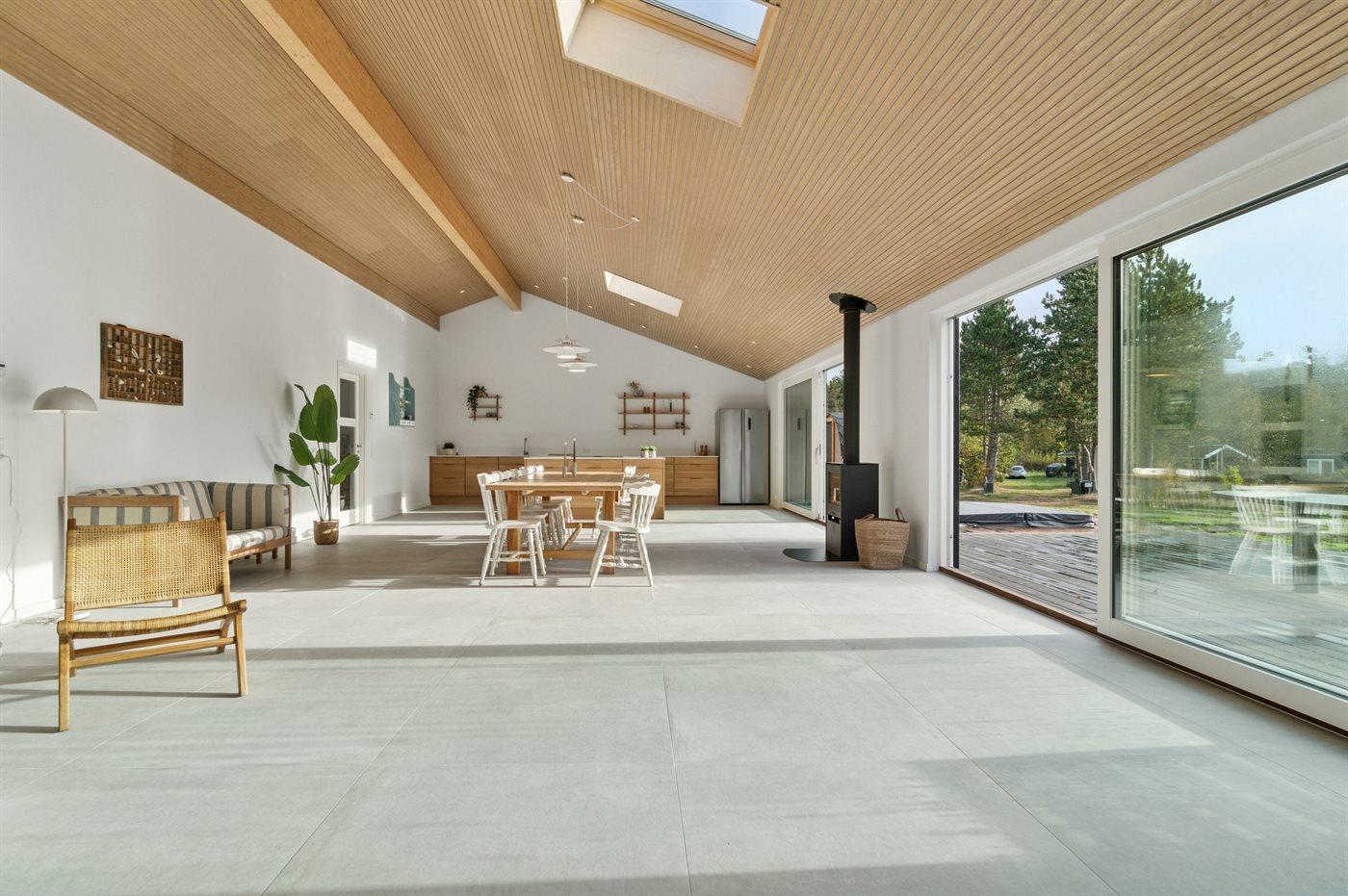 Indenfor fortsætter den gennemførte stil med store klinker, egetræspaneler og lofter til kip. De store vinduer lader lyset falde ind i køkken, alrum og stue, der fungerer som ét samlet opholdsrum. Brændeovnen sørger for hyggelig varme.