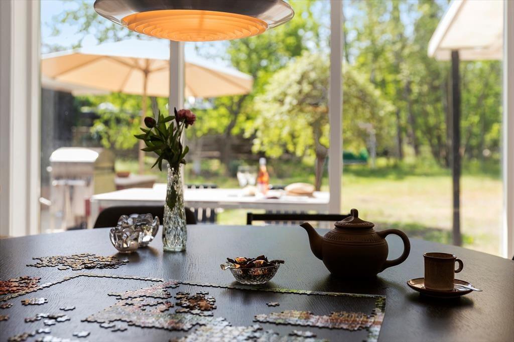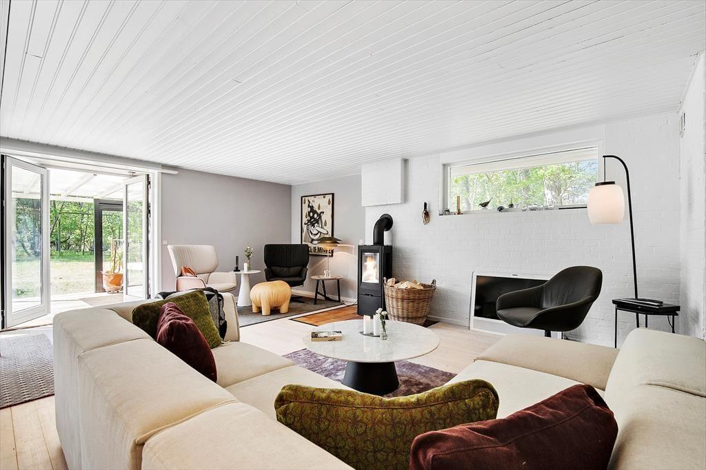 Charmerende, hyggeligt, lyst og lækkert nyrenoveret sommerhus Huset er indrettet med kunst, tæpper og møbler og belysning fra udenlandske producenter såsom Ôrsjô, Moroso, Andreu World, I&I, Blux mm. Huset er godt indrettet med stort køkken i åben forbindelse med opholdsstue. Køkkenet indeholder indbygget ovn, kogeplader, køle/fryseskab og opvaskemaskine. I den hyggelige store opholdsstue er der udgang til terrassen, brændeovn, hyggelig spisekrog, hjørnesofa, lænestole og Smart-TV med adgang til streamingtjenester (kræver eget login. Desuden er der en separat stue i forbindelse med 2 af soveværelserne, hvor der er højt til loftet, stort glasparti, og udgang til terrassen. Tre gode soveværelser med masser af skabsplads, 1 med dobbeltseng, 2 med 2 enkeltsenge. To badeværelser med brusenicher og gulvvarme. Grovkøkken med vaskemaskine og tørretumbler. Værksted med ekstra køleskab. Udhus med sauna Huset opvarmes med gulvvarme i alle rum baseret på en luft til vand varmepumpe, og brændeovn i opholdsstuen.