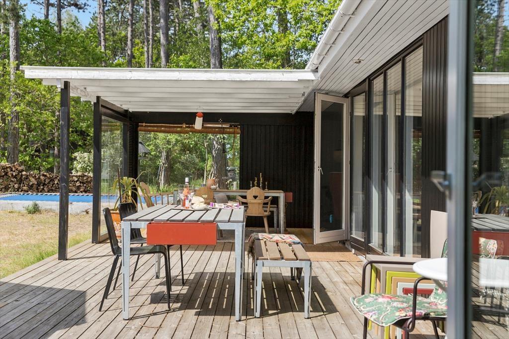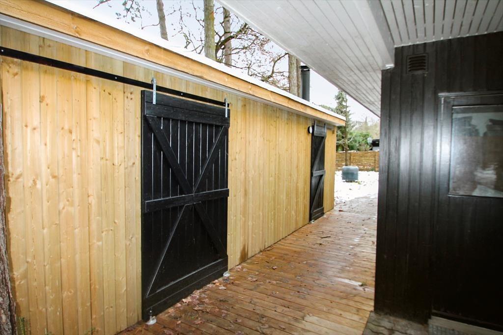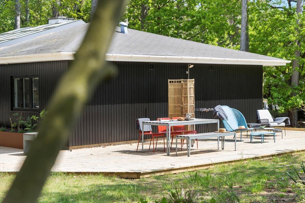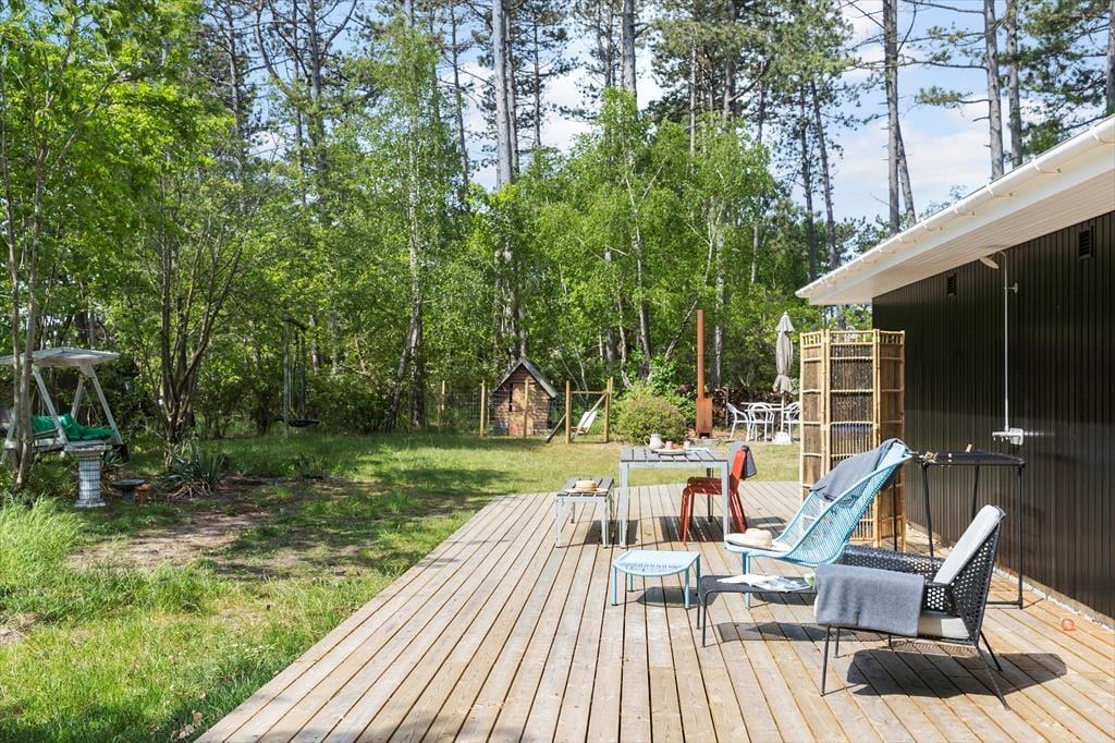 Huset ligger på en 1369 m2 stor grund med en dejlig stor nyere træterrasse. Terrassen er delvis overdækket og der er udhus med cykler, fiskegrej og sportsudstyr, som er til fri afbenyttelse. Ved huset er der havemøbler, terrassevarmer, parasol, hængesofa, gasgrill, legehus, trampolin, udendørs bruser, og gyngestativ.