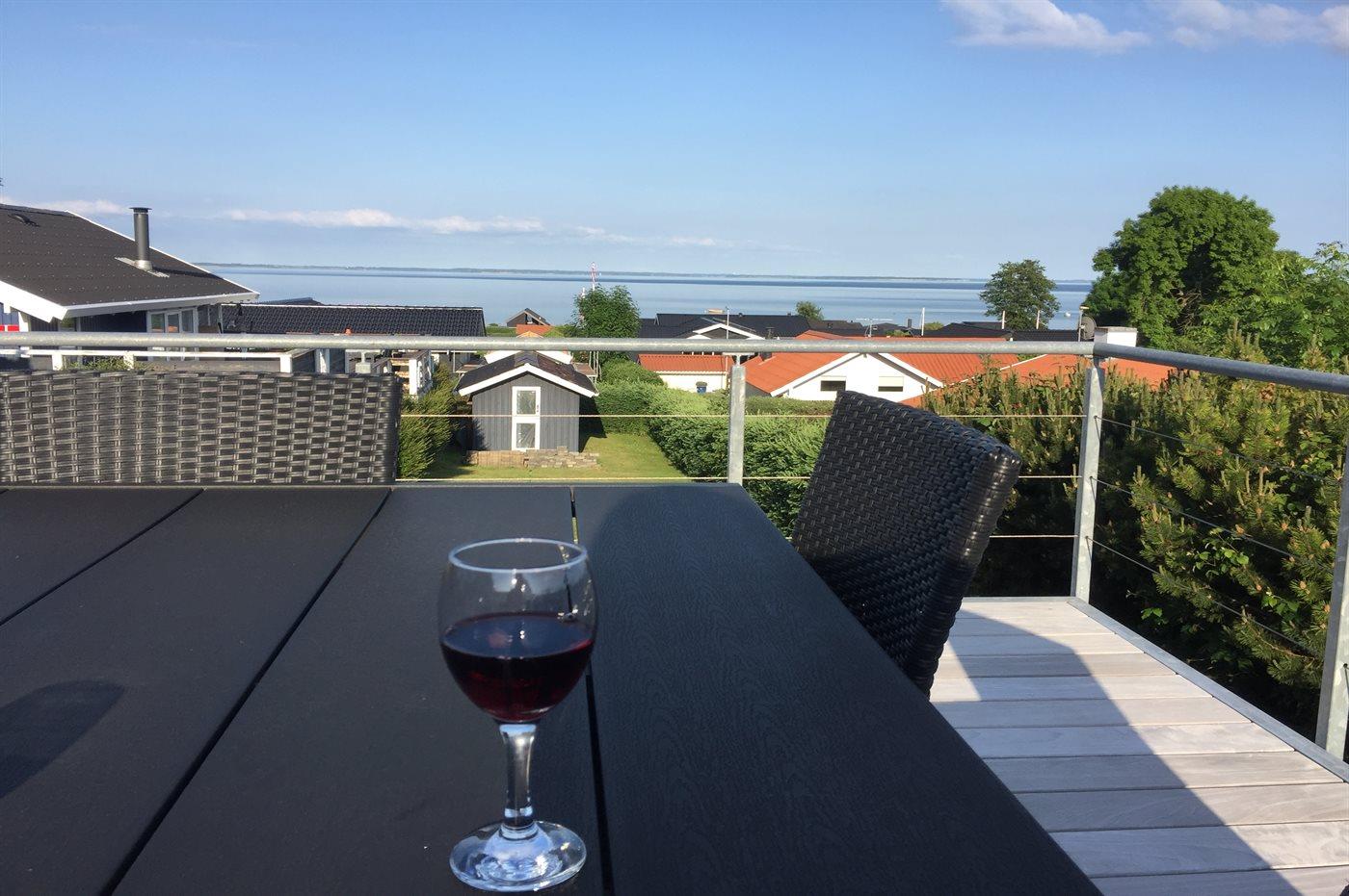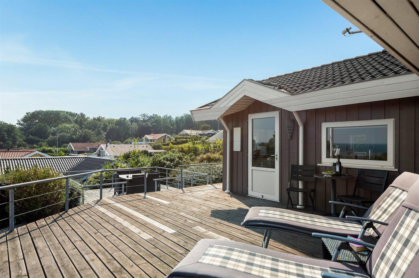 Skønt sommerhus beliggende højt på en skrånende grund lige ved vandet og børnevenlig badestrand i et roligt og kuperet område. Fra såvel hus som grund har man en fantastisk panoramaudsigt over havet og det naturskønne område.