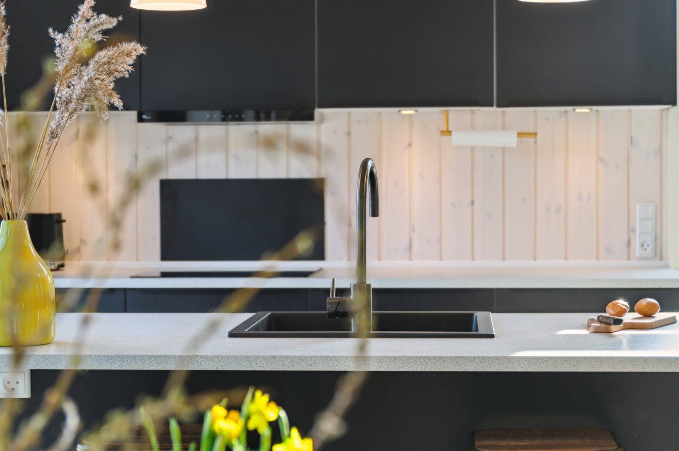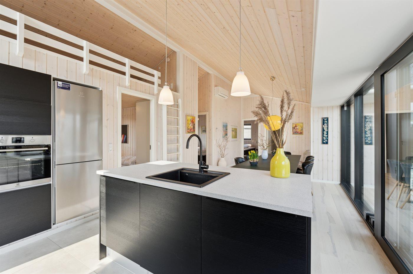 Køkkenet er udstyret med 1 køleskab. Der er 4 induktionskogeplader, varmluftovn, mikrobølgeovn samt opvaskemaskine.