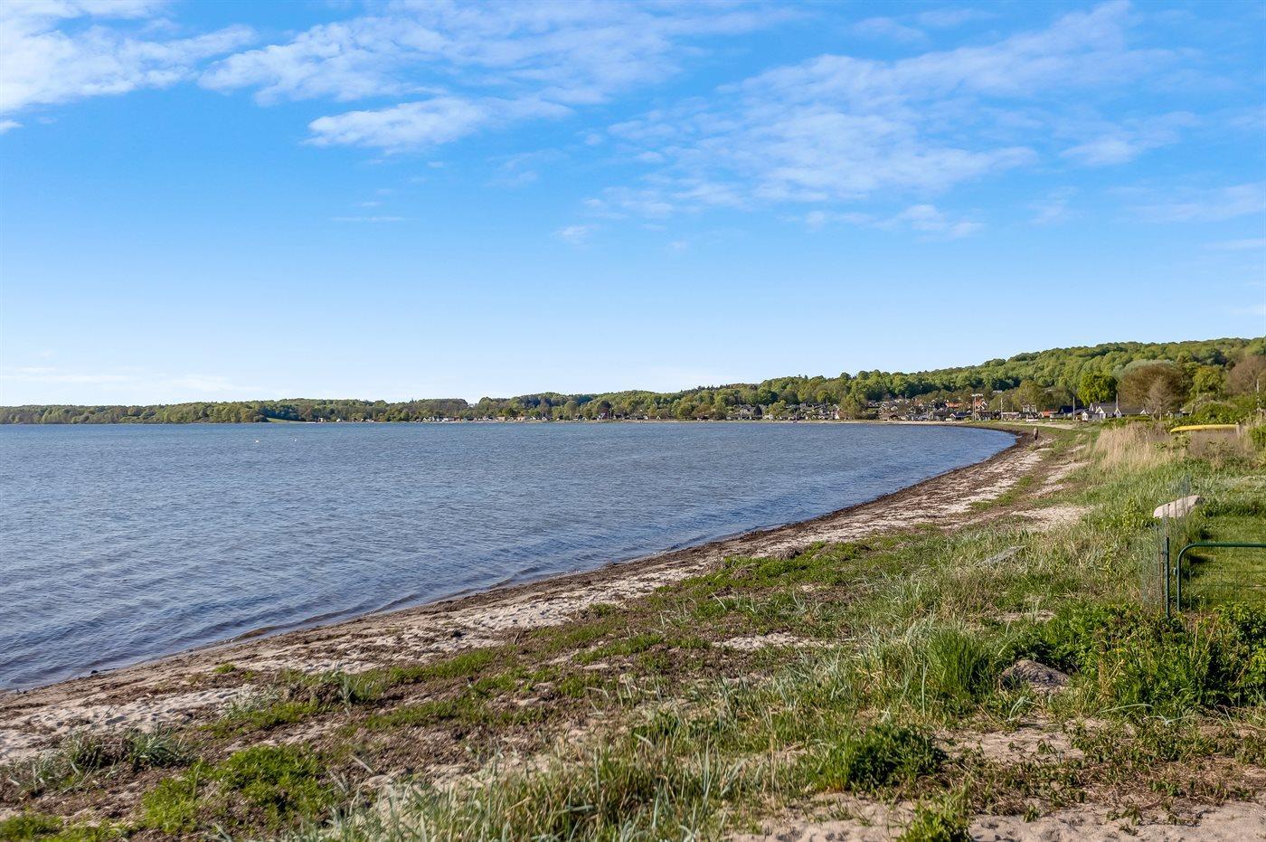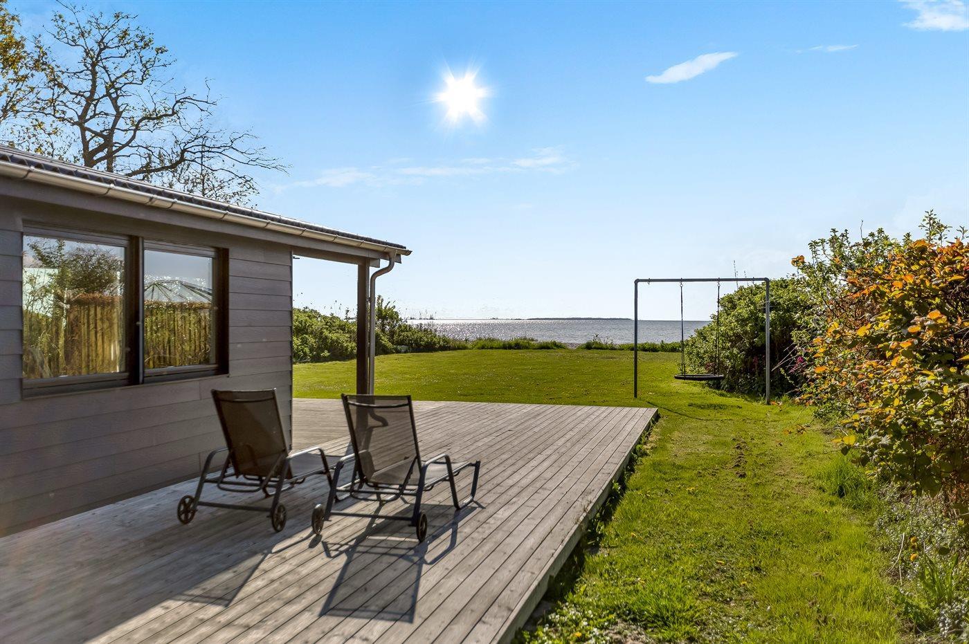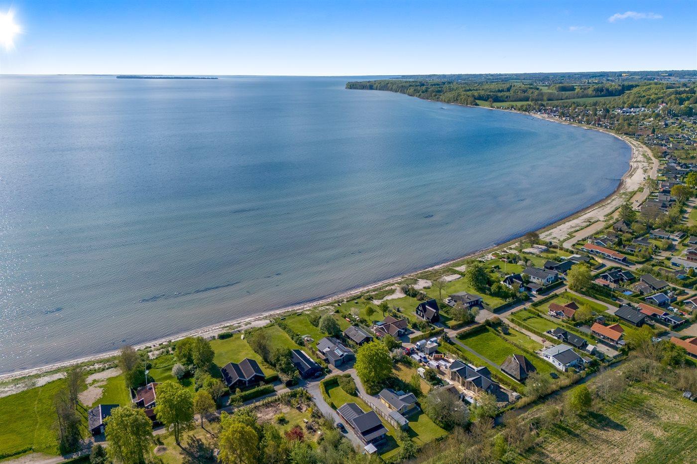 Fra både inde- og uderum har I den mest fantastiske udsigt over Lillebælt, hvor I kan følge skibenes rolige sejlads og nyde synet af kite surfere, der leger med vinden. De dejlige terrasser - heraf en overdækket- giver jer mulighed for at nyde solen hele dagen og de lange sommeraftener med blikket mod havet. Den store græsplæne strækker sig direkte ned mod den fine, hvide strandsand, så på få sekunder kan I tage turen fra hus til hav og hoppe i vandet.