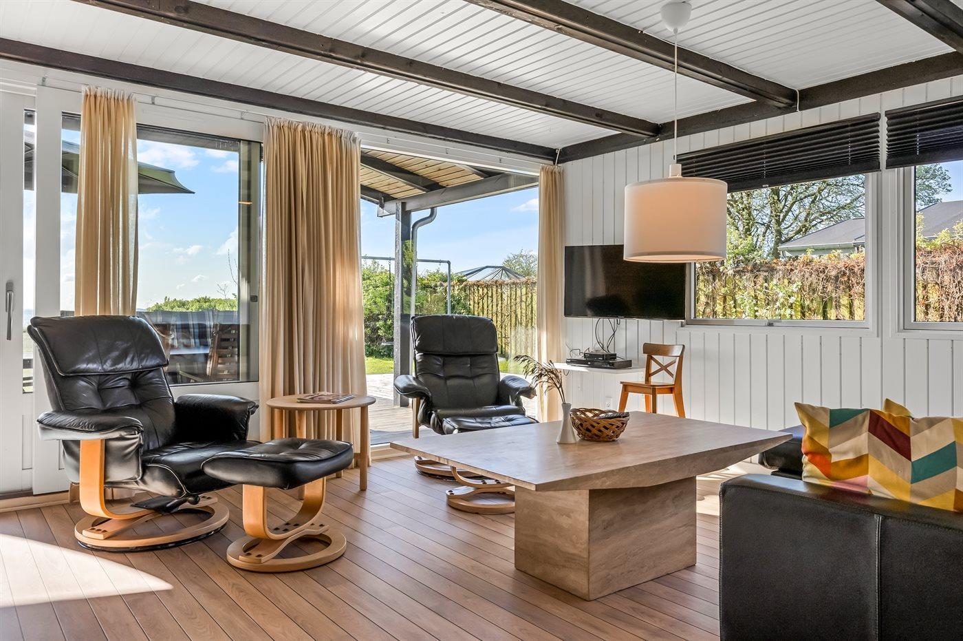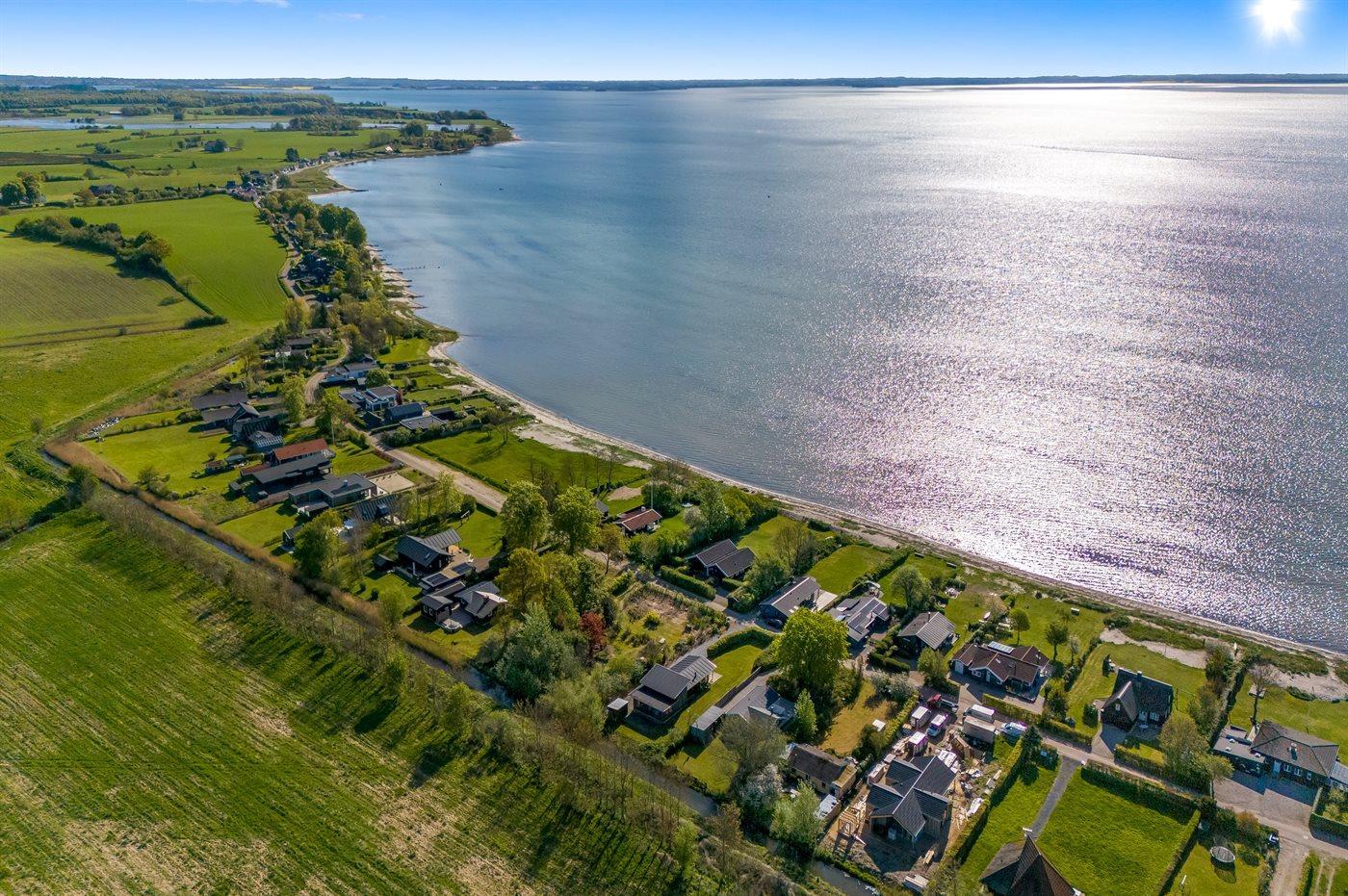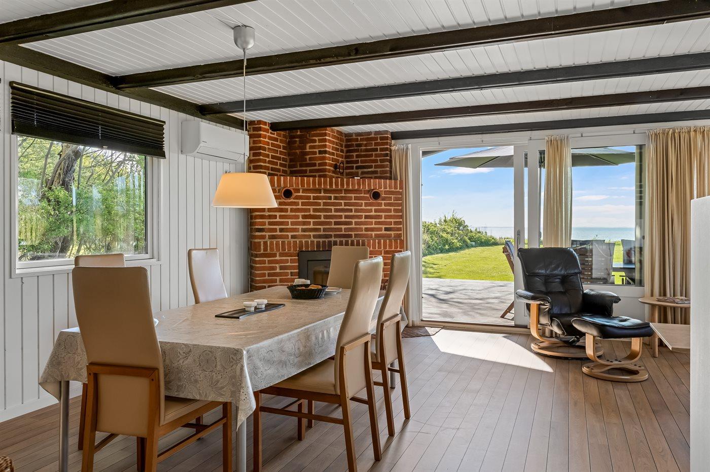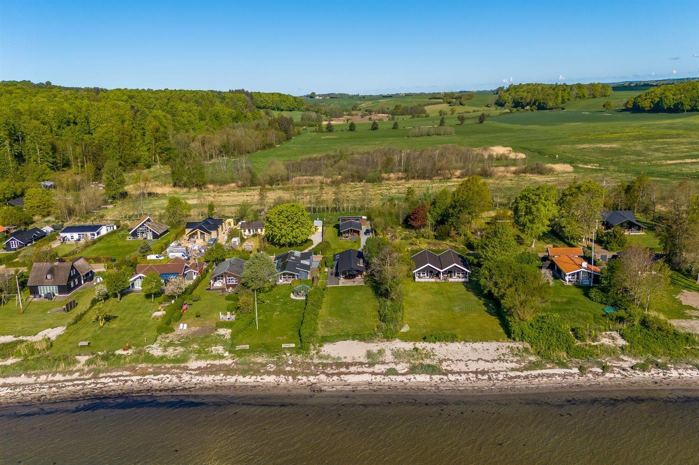 Fra både inde- og uderum har I den mest fantastiske udsigt over Lillebælt, hvor I kan følge skibenes rolige sejlads og nyde synet af kite surfere, der leger med vinden. De dejlige terrasser - heraf en overdækket- giver jer mulighed for at nyde solen hele dagen og de lange sommeraftener med blikket mod havet. Den store græsplæne strækker sig direkte ned mod den fine, hvide strandsand, så på få sekunder kan I tage turen fra hus til hav og hoppe i vandet.