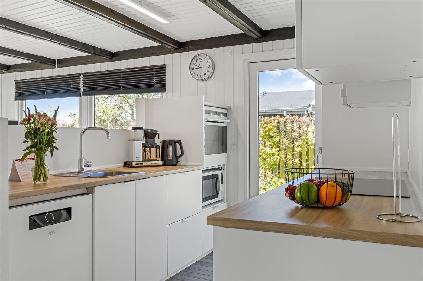 Køkkenet er udstyret med 1 køleskab. Der er 4 induktionskogeplader, varmluftovn, mikrobølgeovn samt opvaskemaskine.