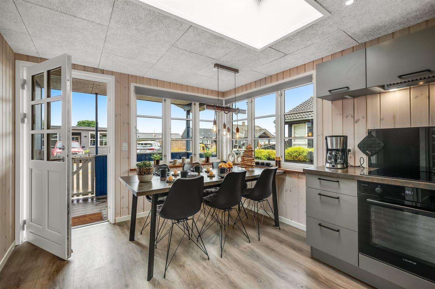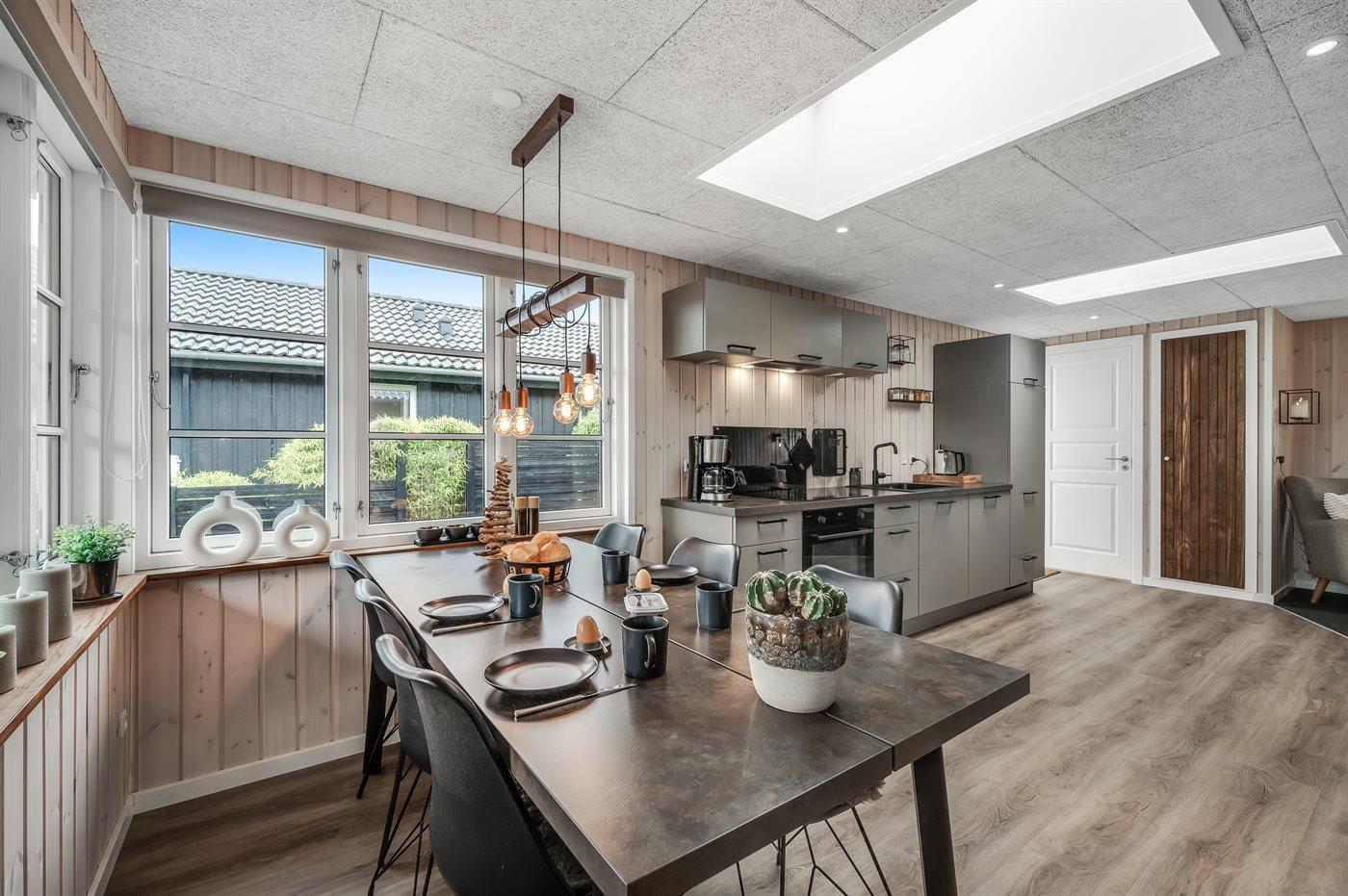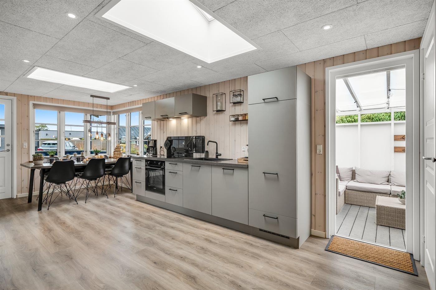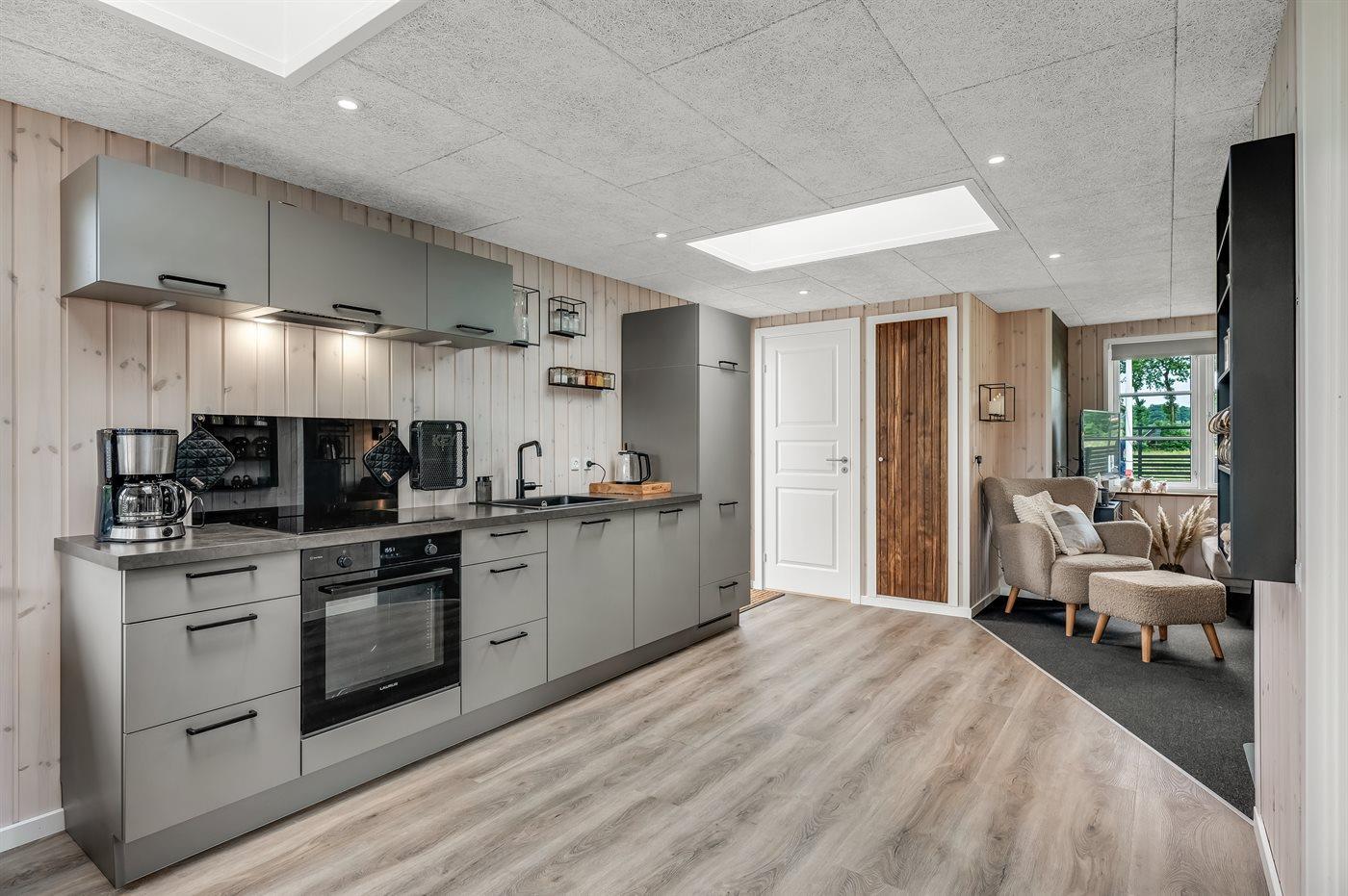 Køkkenet er udstyret med 1 køleskab. Der er 4 induktionskogeplader, varmluftovn, mikrobølgeovn, Airfryer, blender samt opvaskemaskine.