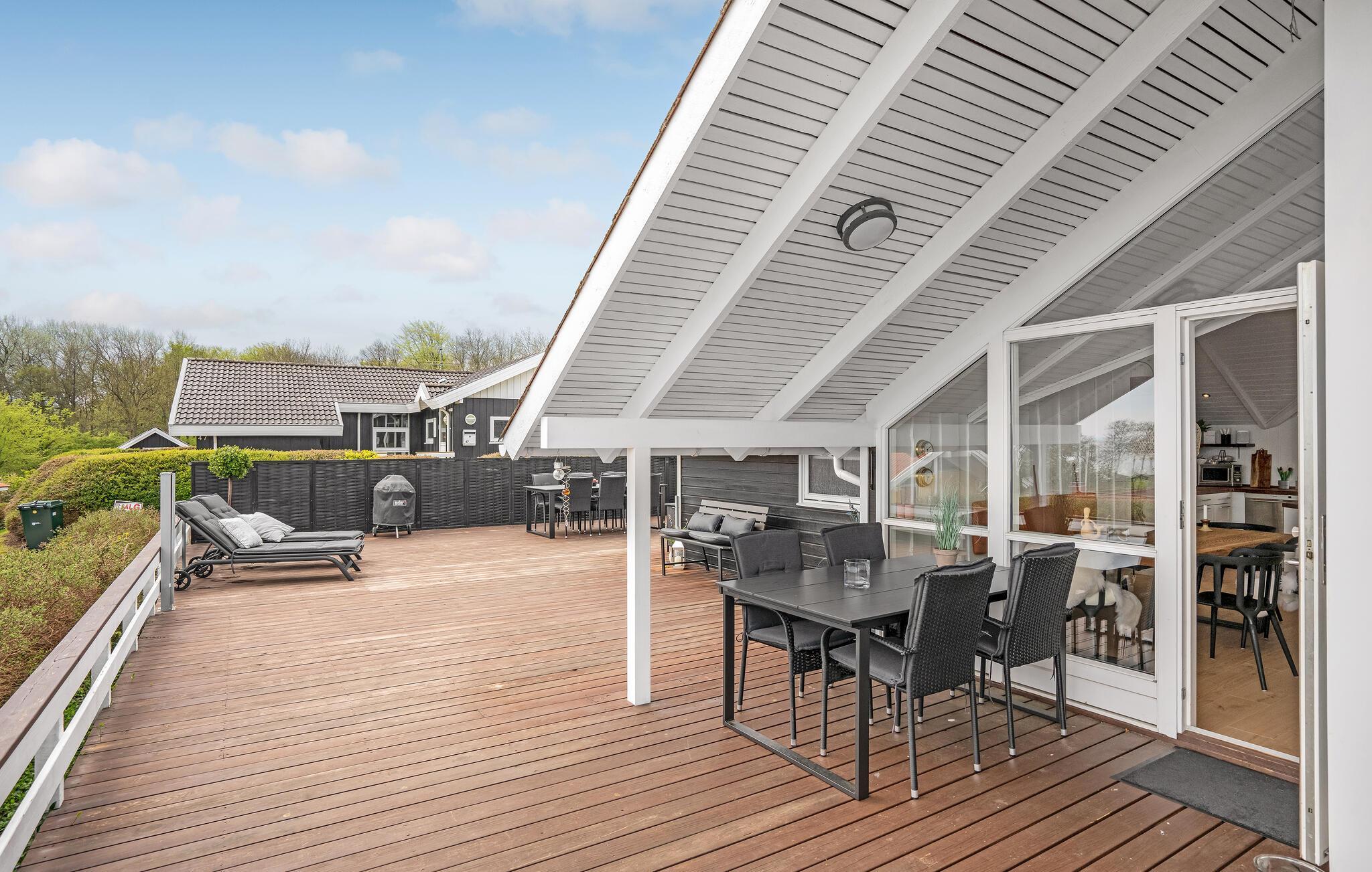 Terrassen har delvis overdækning, så I kan også spise frokost ude i den lette sommerregn. Det er også skønt at læne sig tilbage med en god bog på liggestolene eller tænde bål i haven sammen med børnene.