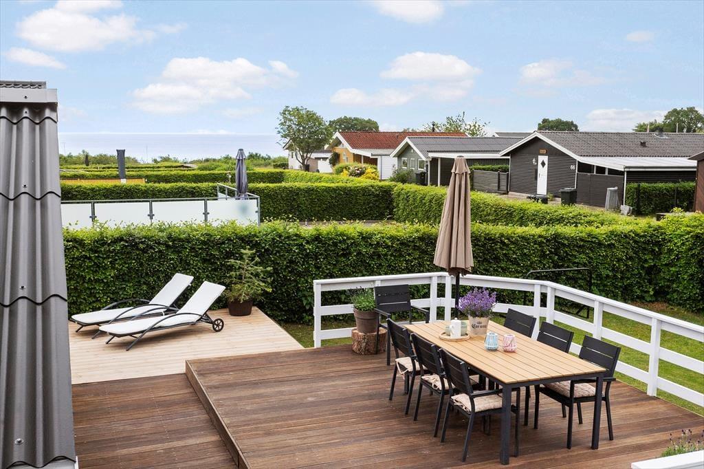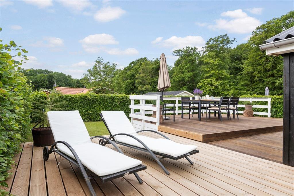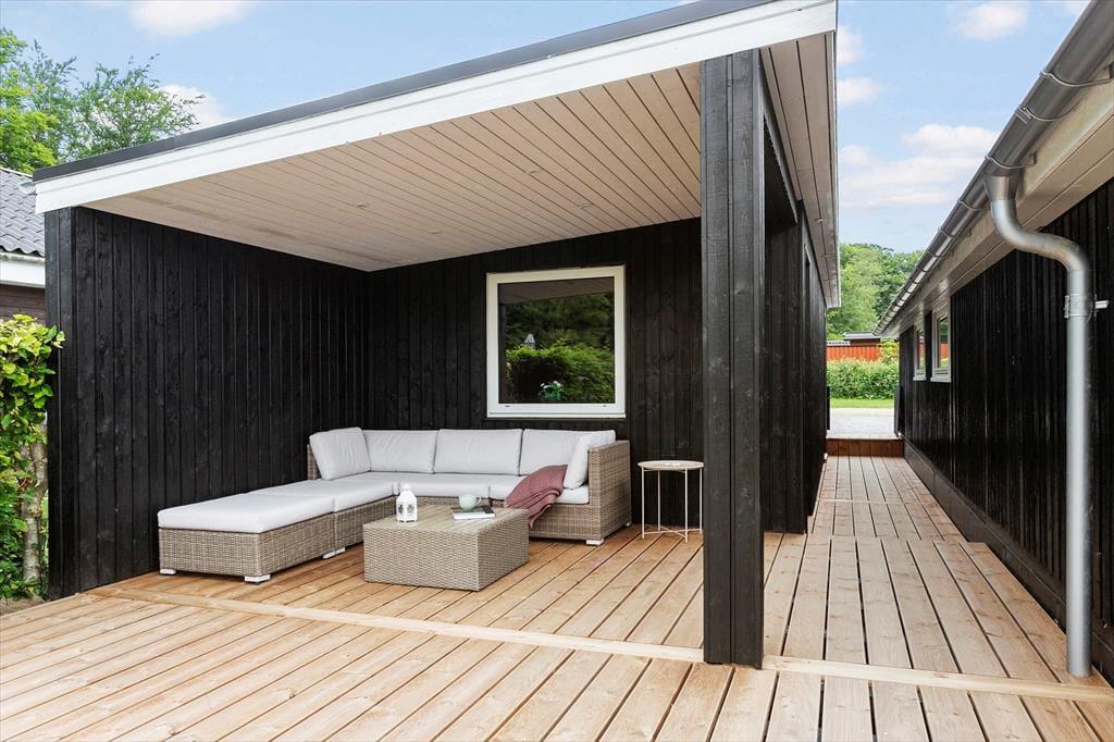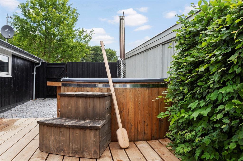 Sommerhusets udendørsområde er en sand oase af afslapning og hygge. Den store terrasse, der kombinerer overdækkede og åbne arealer, giver dig mulighed for at nyde livet under \e5ben himmel uanset vejret. Til venstre for hovedhuset finder du et lækkert loungeområde, hvor du kan nyde en god bog eller et glas vin i behagelige omgivelser. Og hvad er bedre end at afslutte en lang dag med en tur i det varme vildmarksbad? Her kan du lade skuldrene synke ned i det lune vand, mens du ser solen gå ned bag træerne. Med grillfaciliteter og komfortable havemøbler er der også rig mulighed for hyggelige grillaftener med familien.