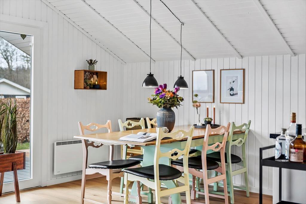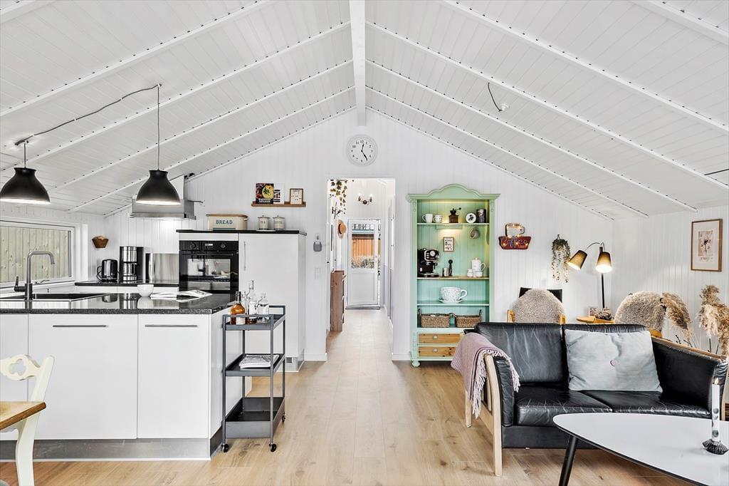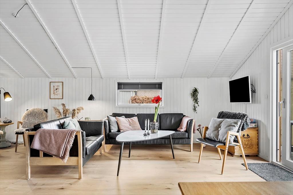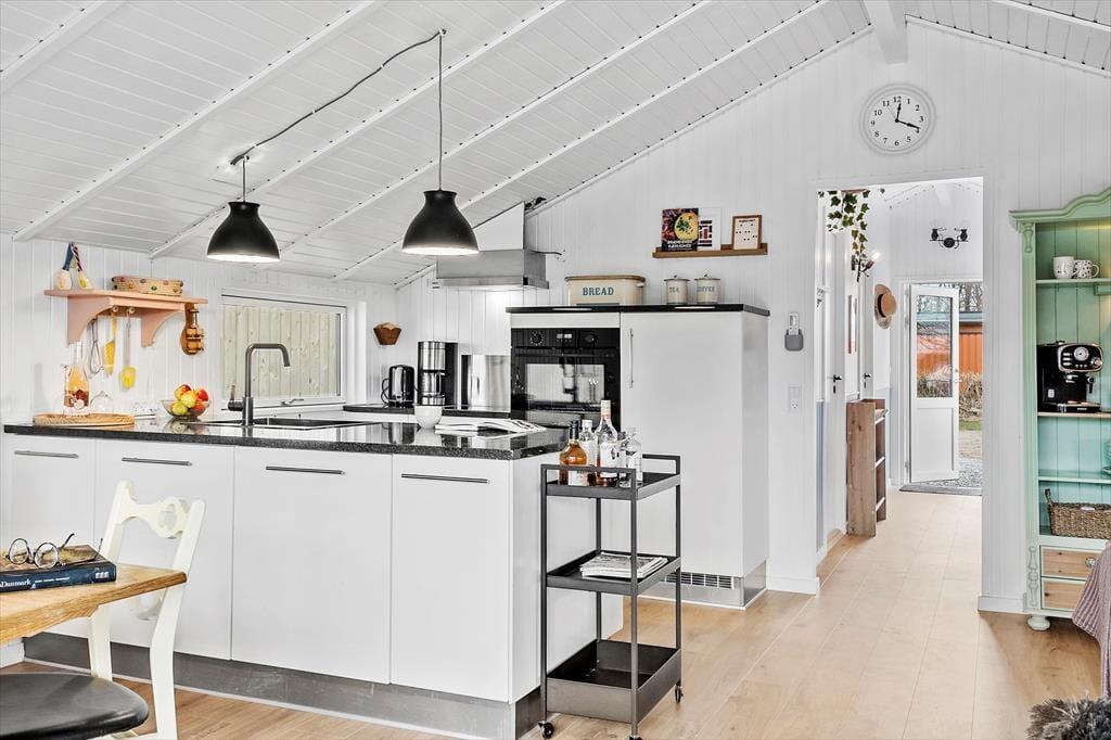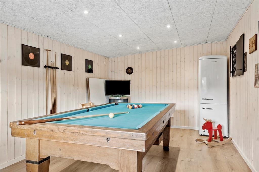 Sommerhuset byder dig velkommen med en lys og venlig atmosfære, hvor loft til kip skaber en rummelig og luftig fornemmelse. Den åbne planløsning forener stue, spiseområde og køkken, så du nemt kan nyde samværet, uanset om du står i køkkenet eller slår dig ned i sofaen. Store vinduer lukker lyset ind og giver dig en skøn udsigt til de naturskønne omgivelser. Aktivitetsrummet byder på timevis af sjov med dart, billard og bordtennis, så både store og små kan udfordre hinanden i hyggelige dyste. Huset er smagfuldt indrettet med kvalitetsmøbler og moderne faciliteter, der skaber de perfekte rammer for en afslappende ferie.
